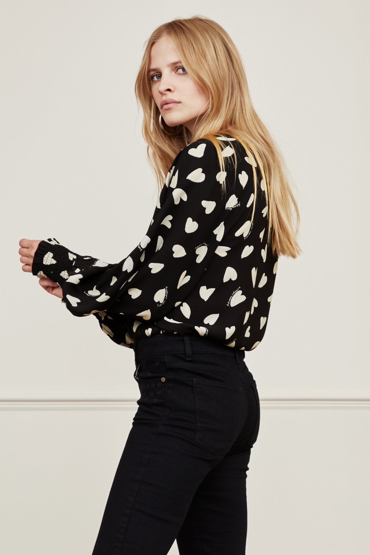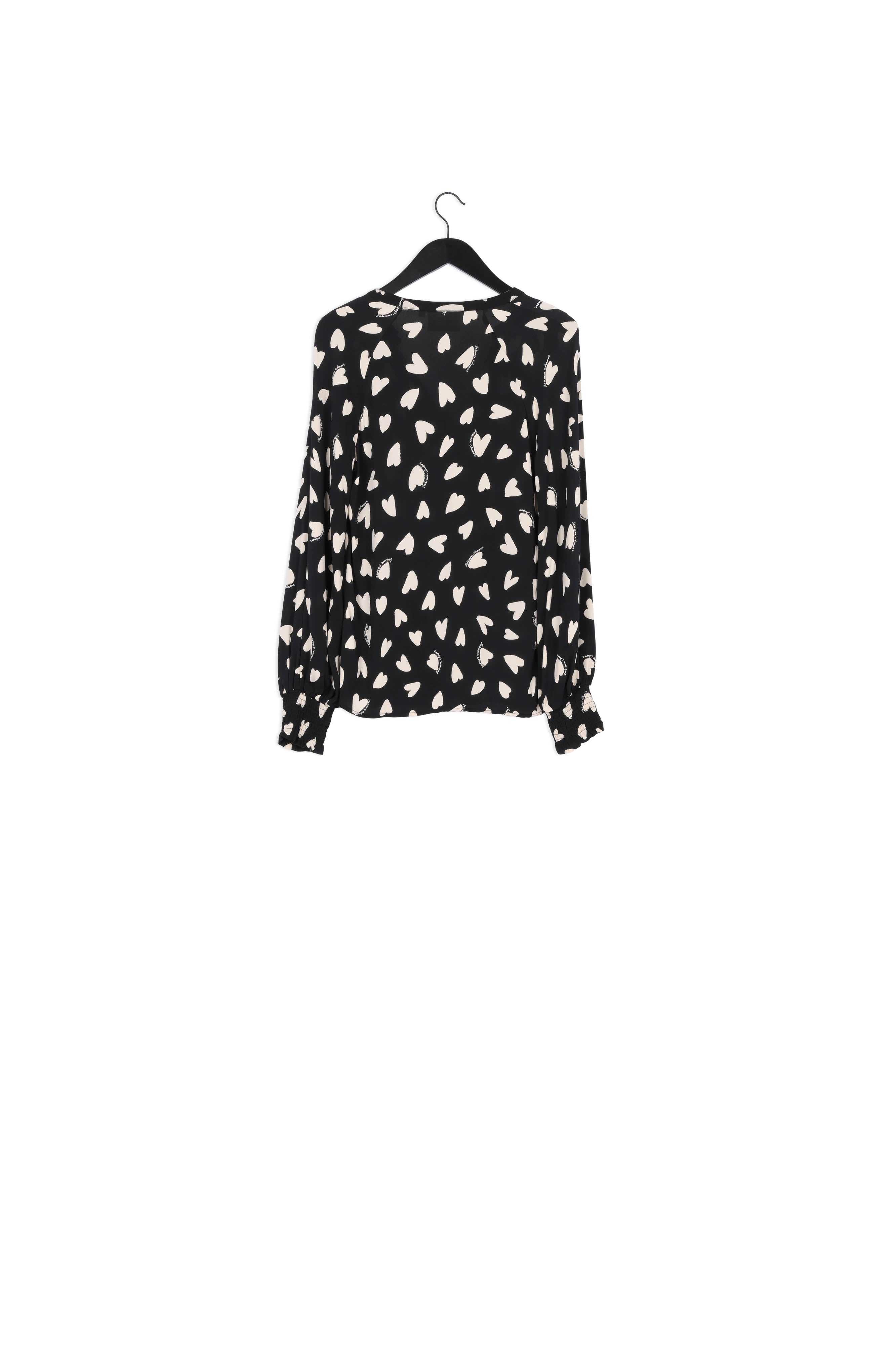 Flowing blouse with a V-neckline and a concealed button closure. Cliff Isa Blouse has balloon sleeves and smocked cuffs.