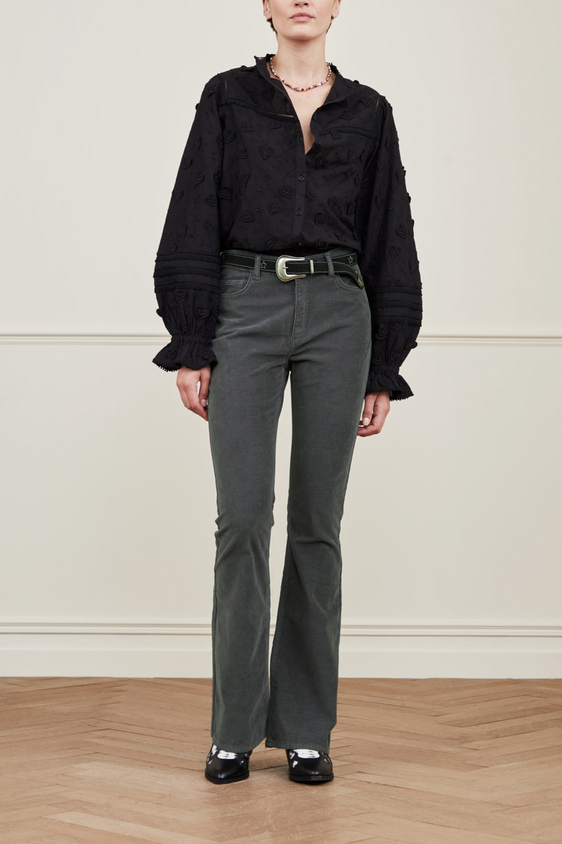 Blouse with button closure and ruffle cuffs. Joan Blouse has a beautiful all over embroidery with hearts and cut-away details on the sleeves. -
