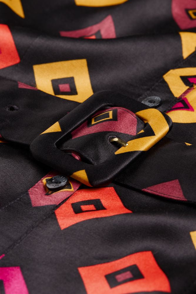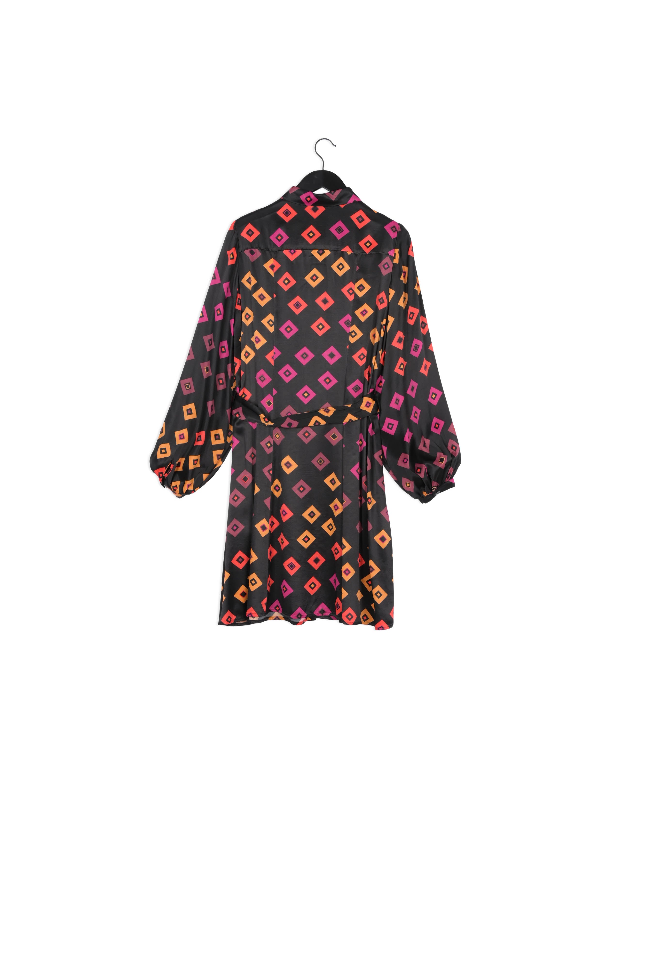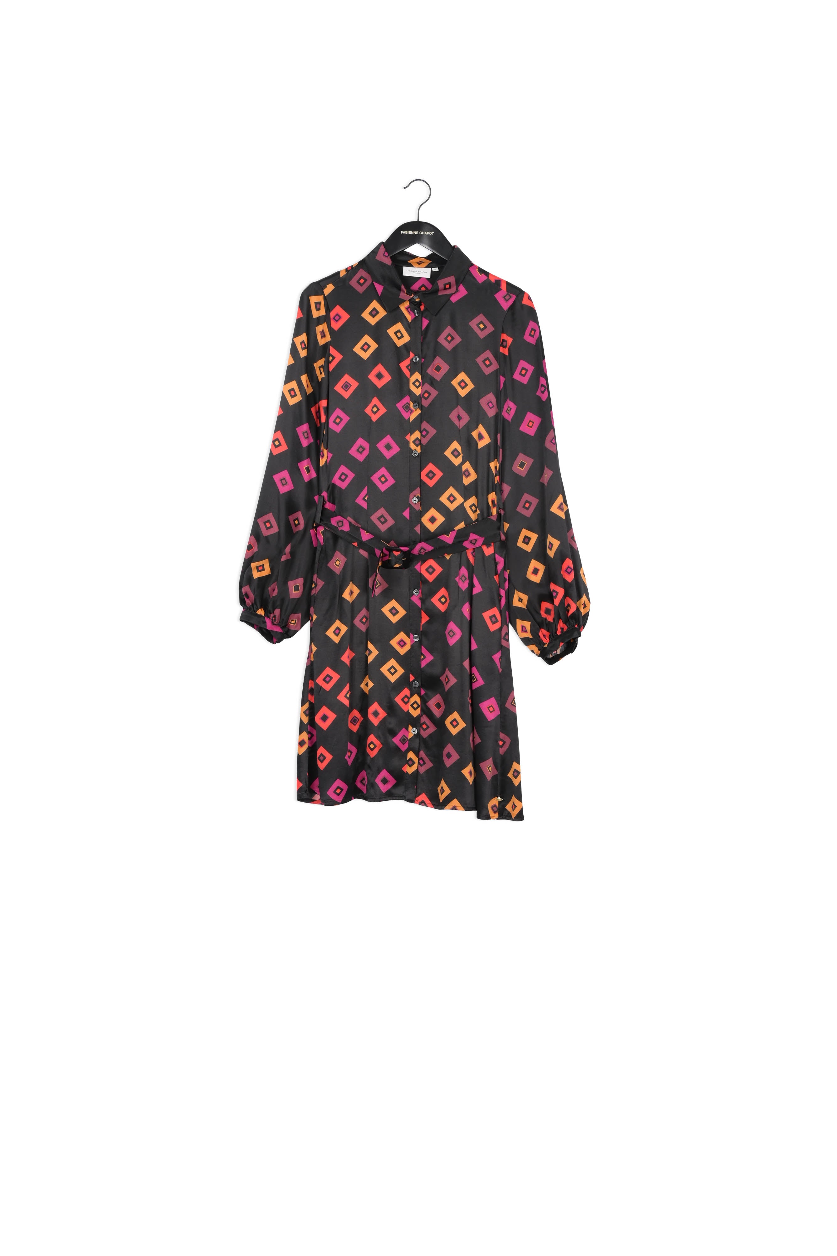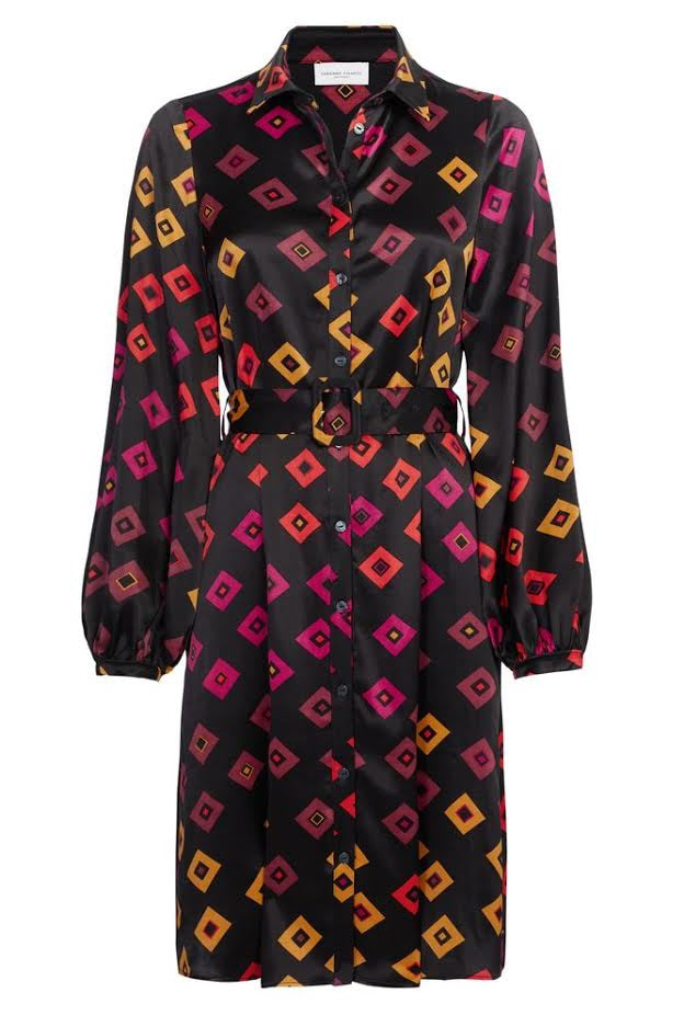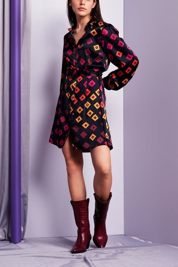 Midi-length flowing dress with long sleeves and a waist belt. The Samantha Short Dress has a button fastening down the length of the dress. -