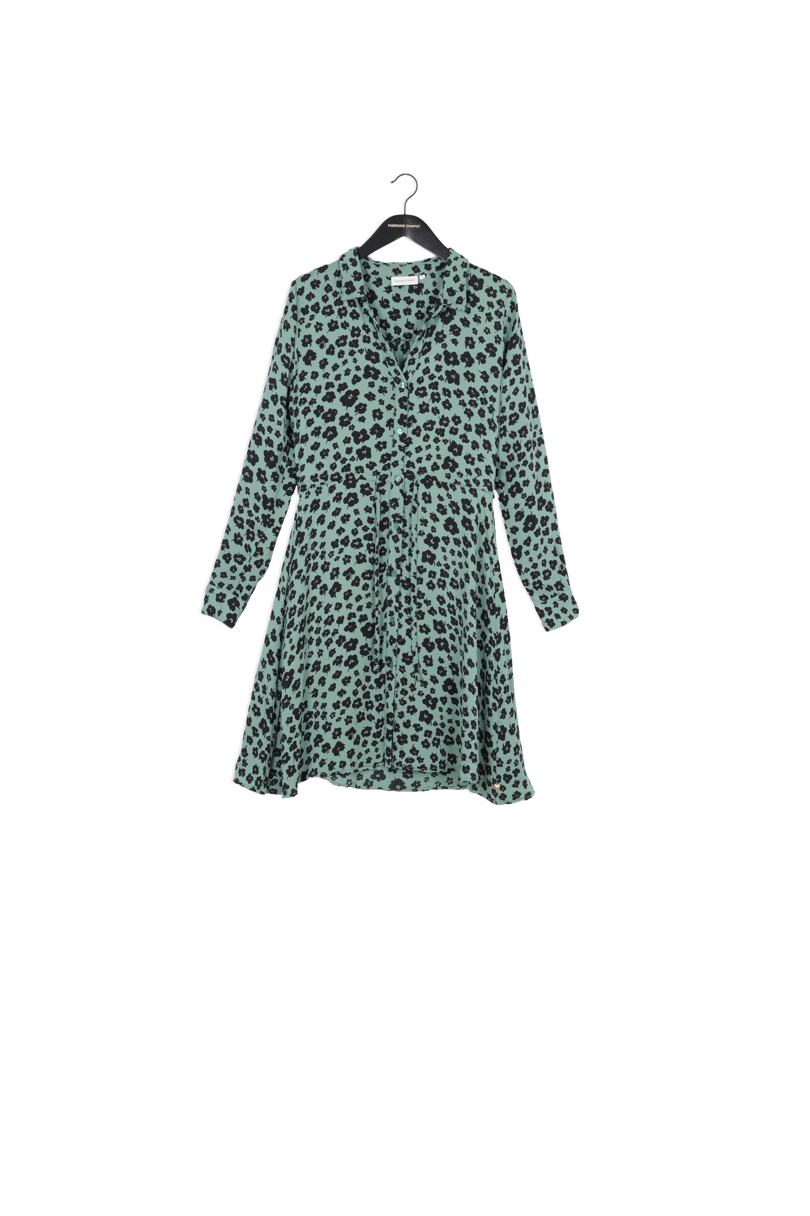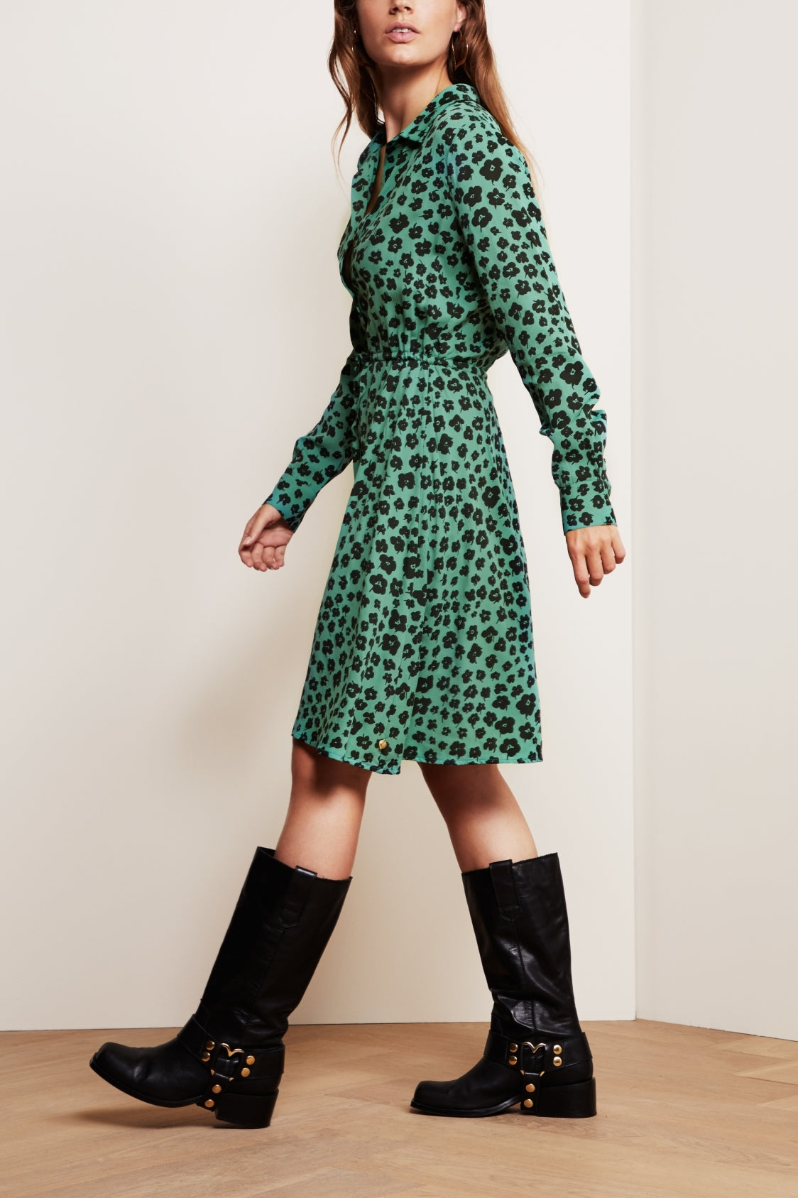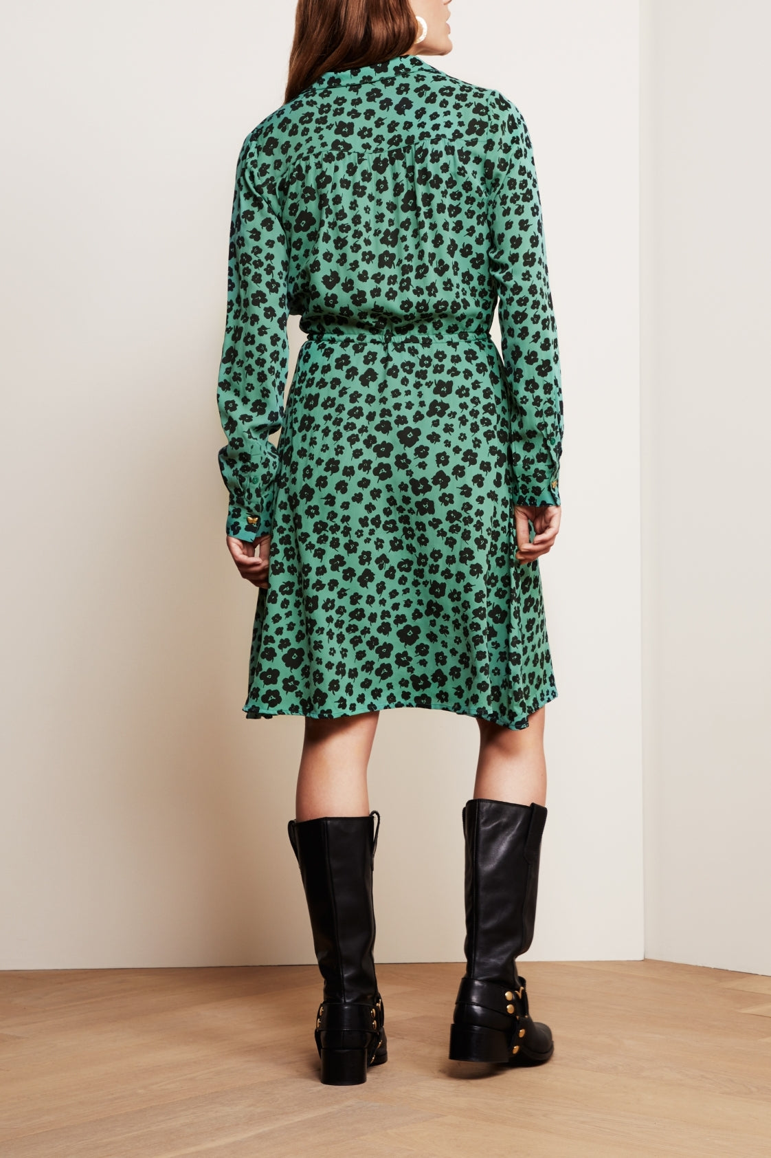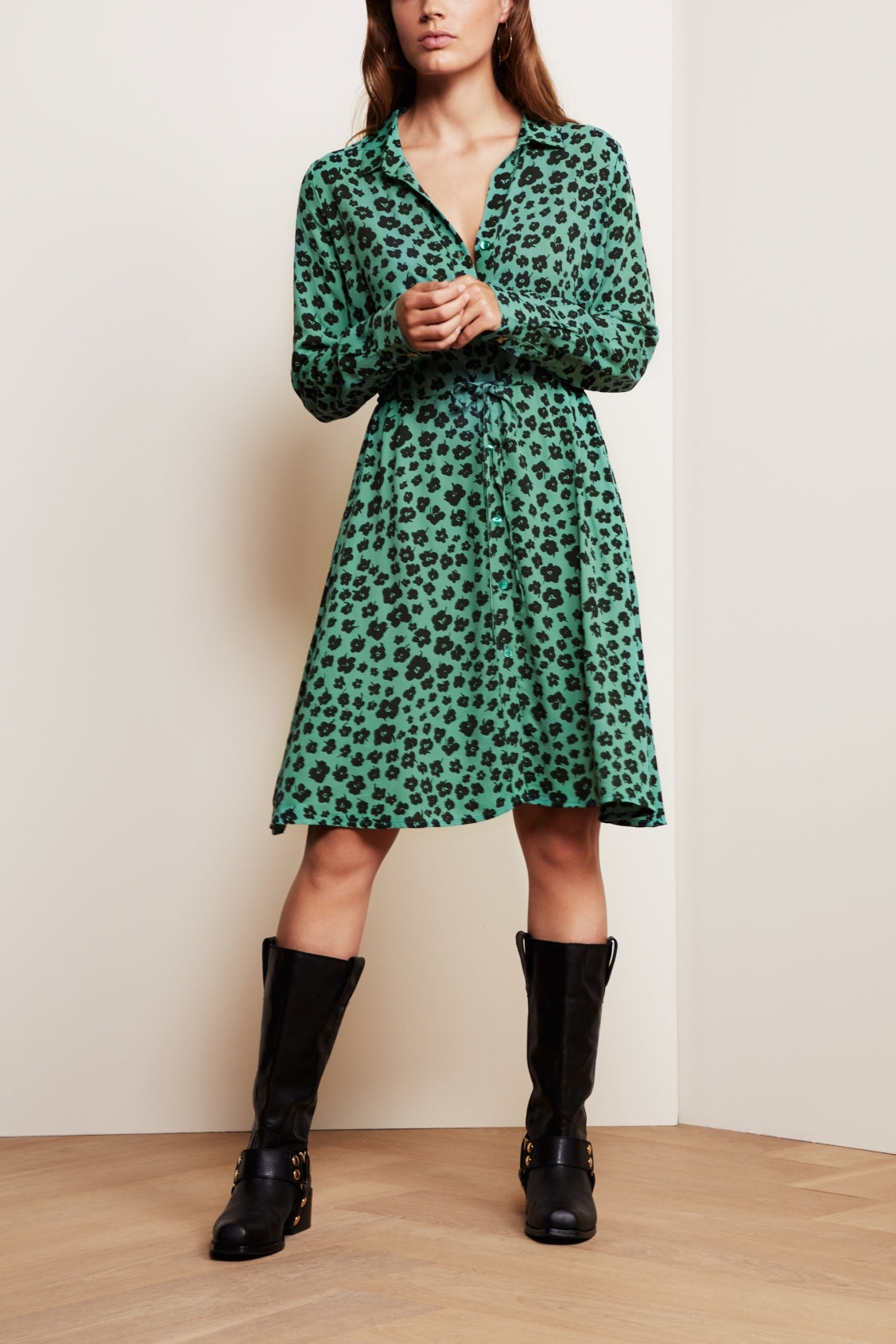 Flowing dress with V neck and tie belt. Ellen Dress has a button closure down the length of the dress. -