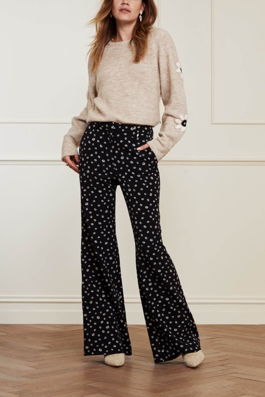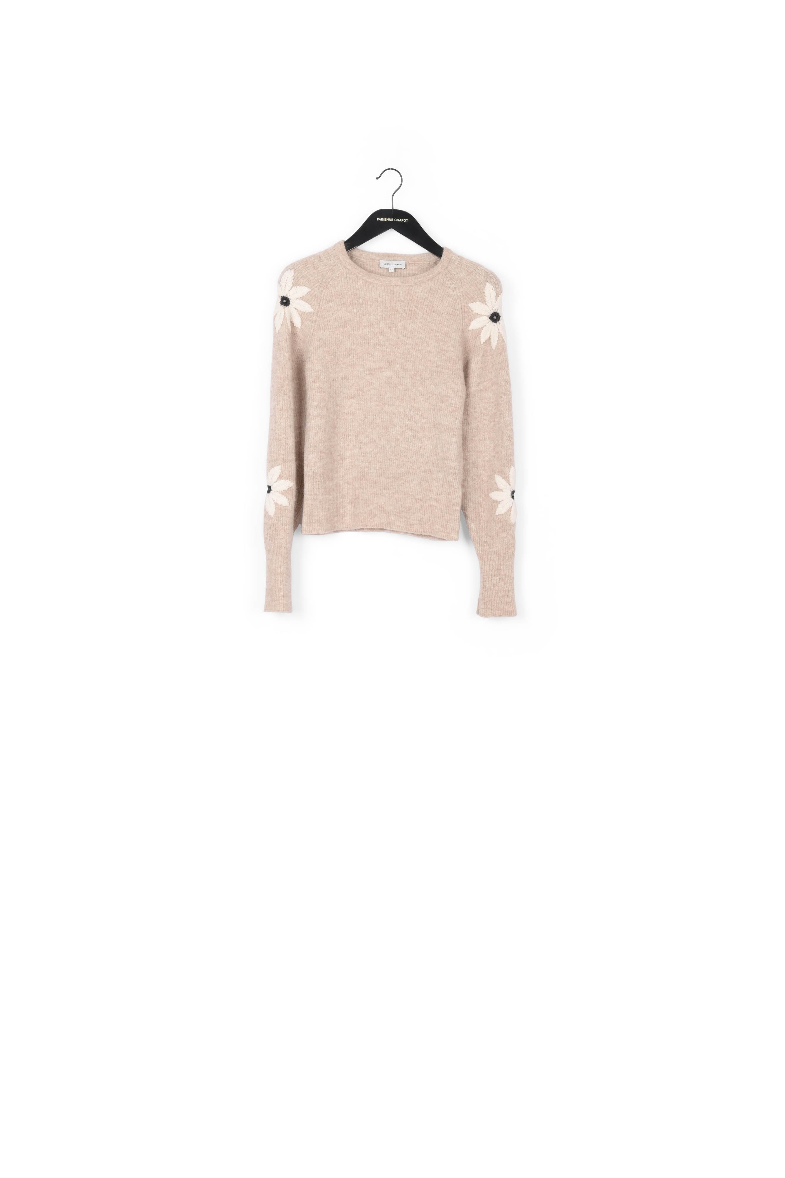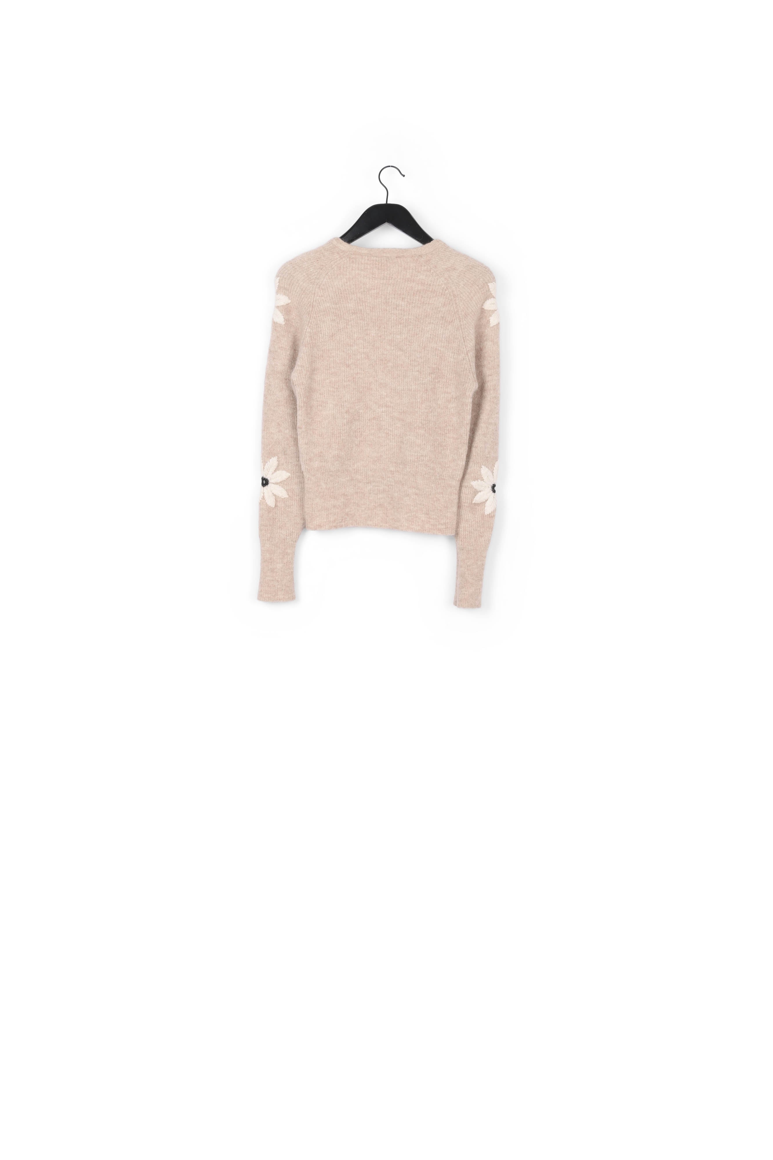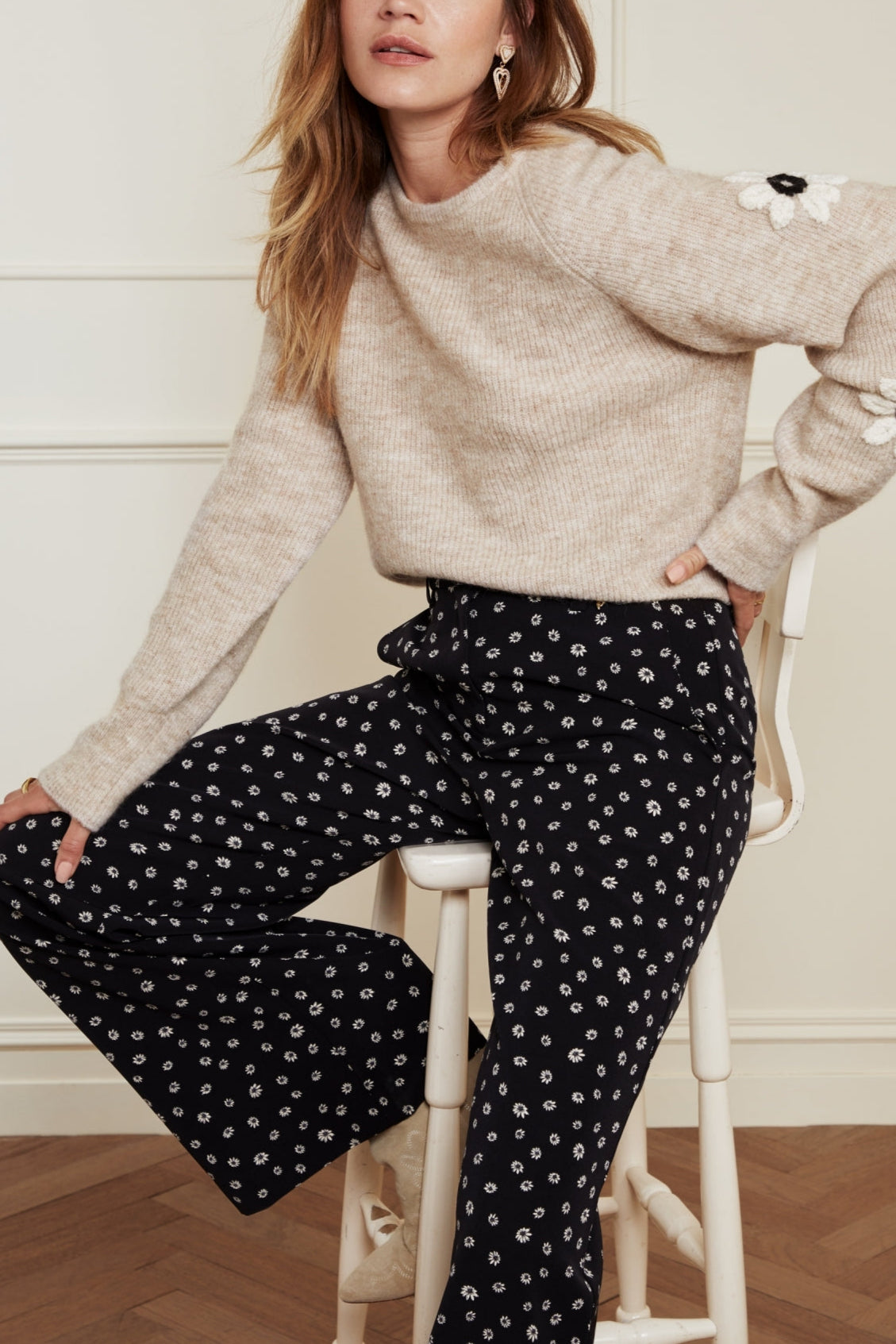 Fine knit pullover with a round neckline. Odillia Pullover has embroidered flowers on the sleeves. -