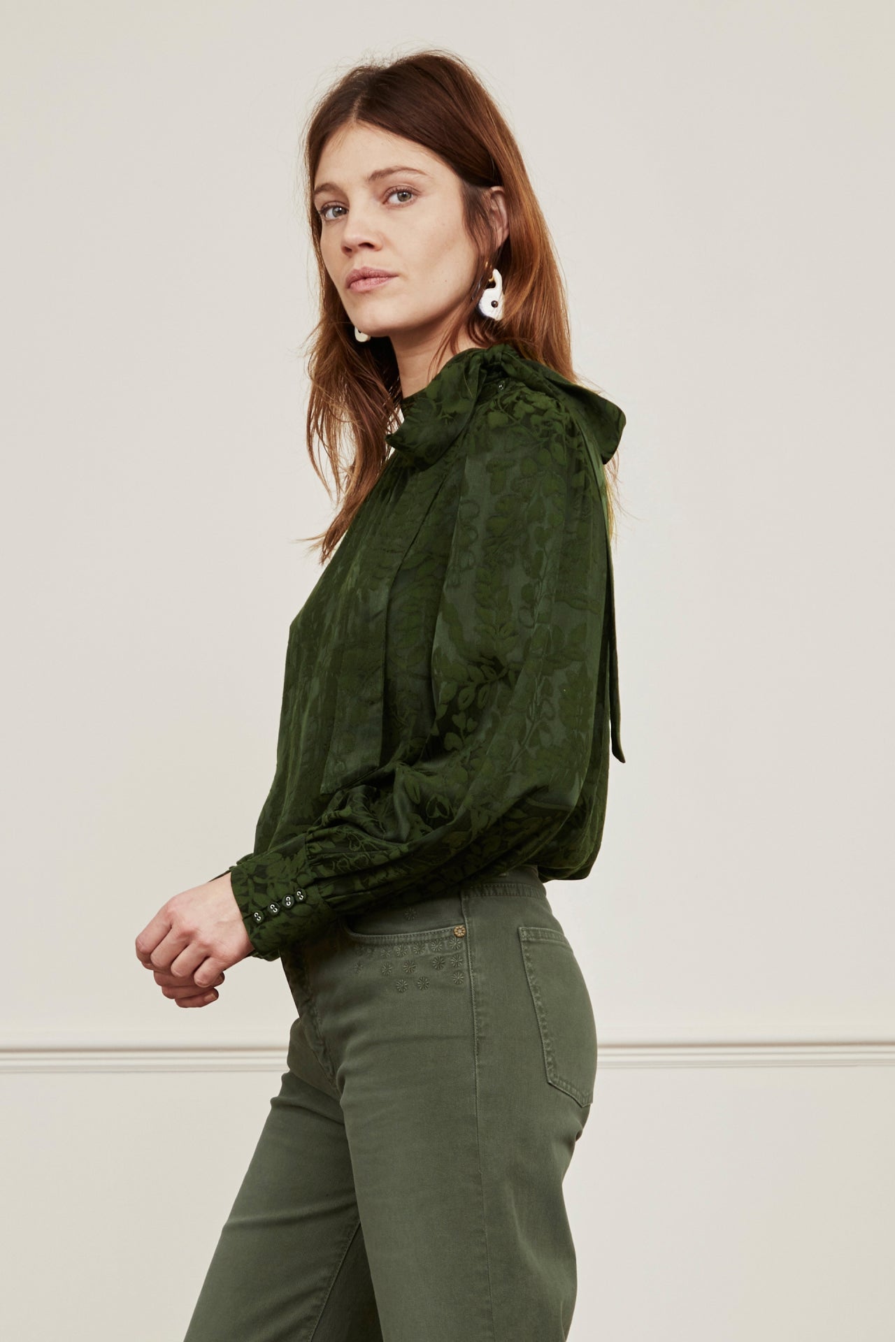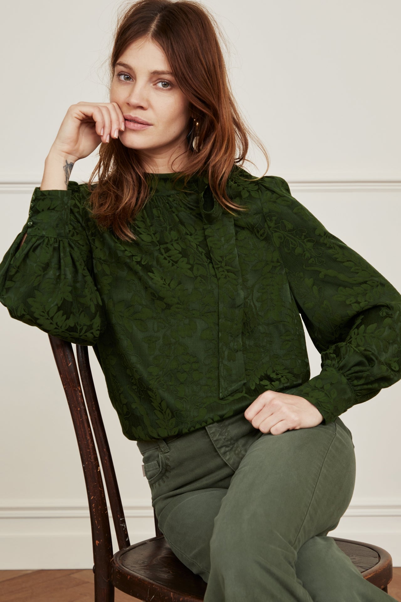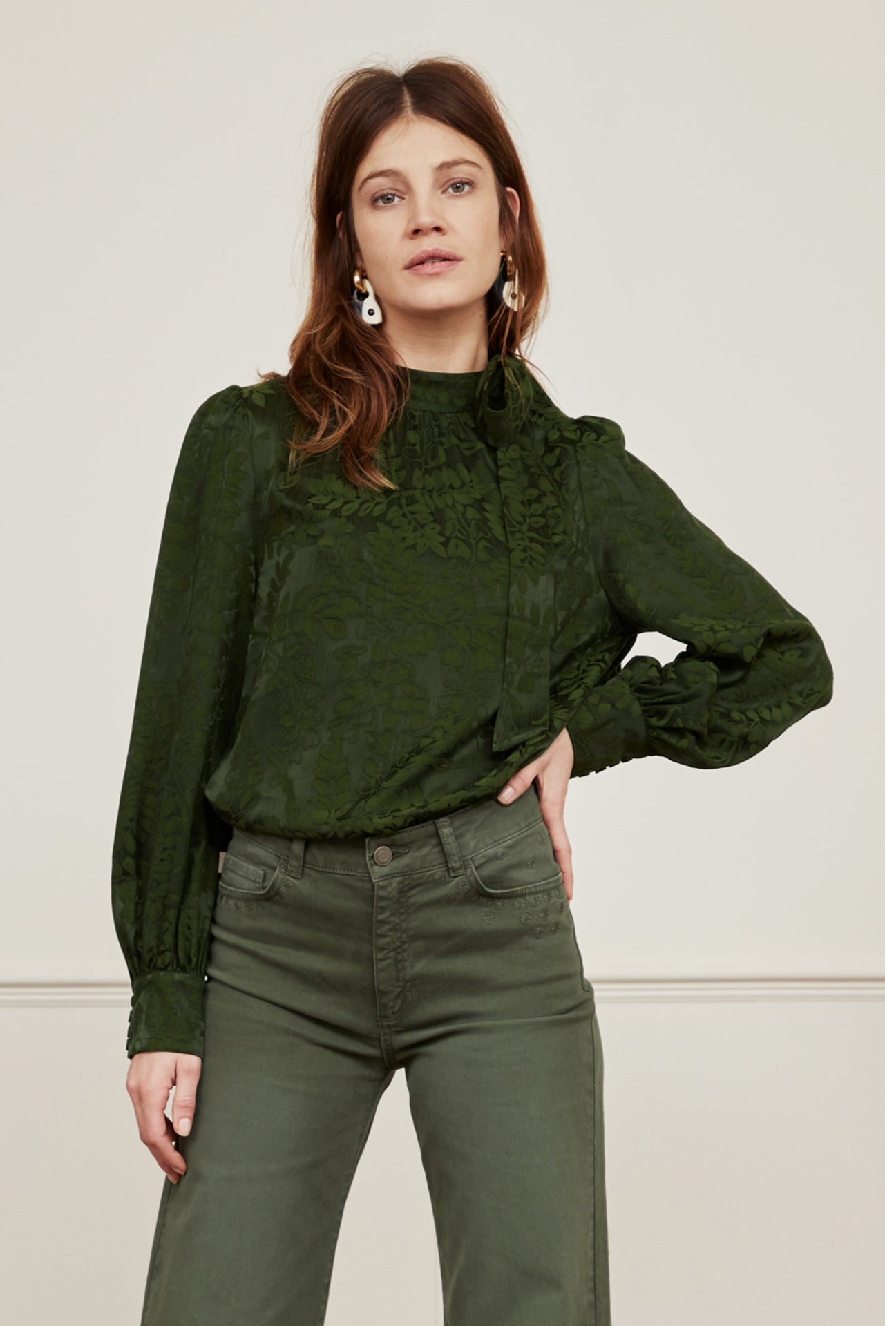 High neck top with tie detail at the neck. Michou top has balloon sleeves, fitted cuffs and a beautiful all over jacquard print with leaves. -