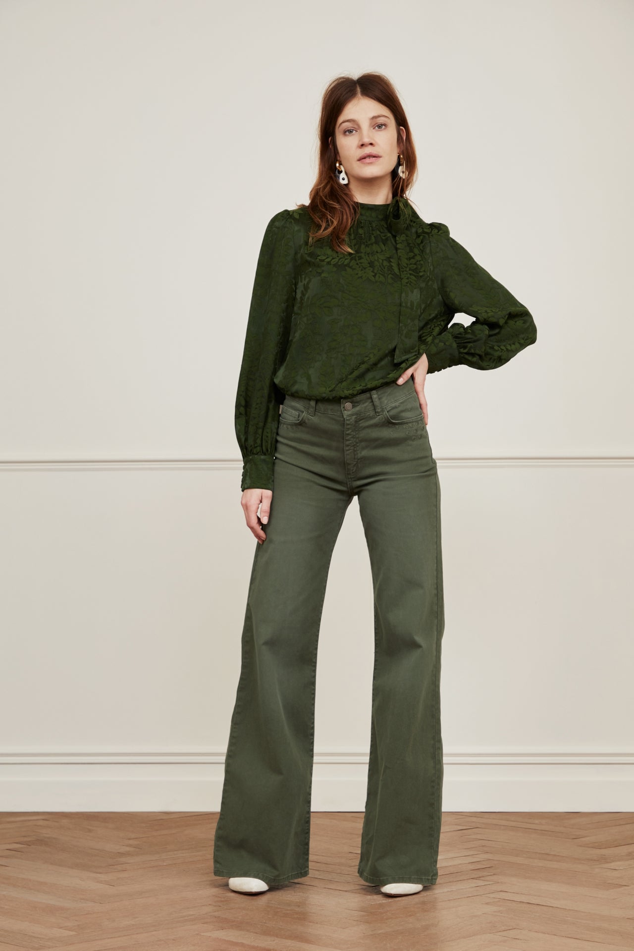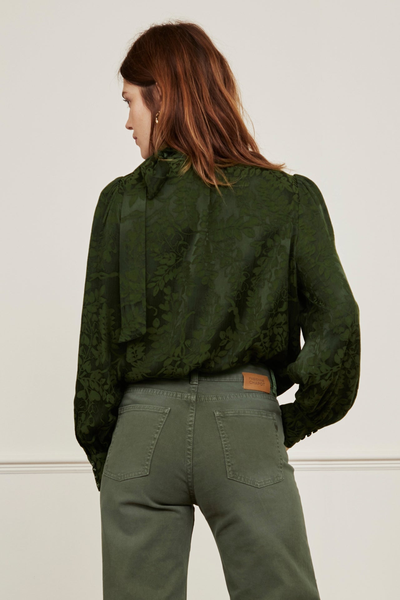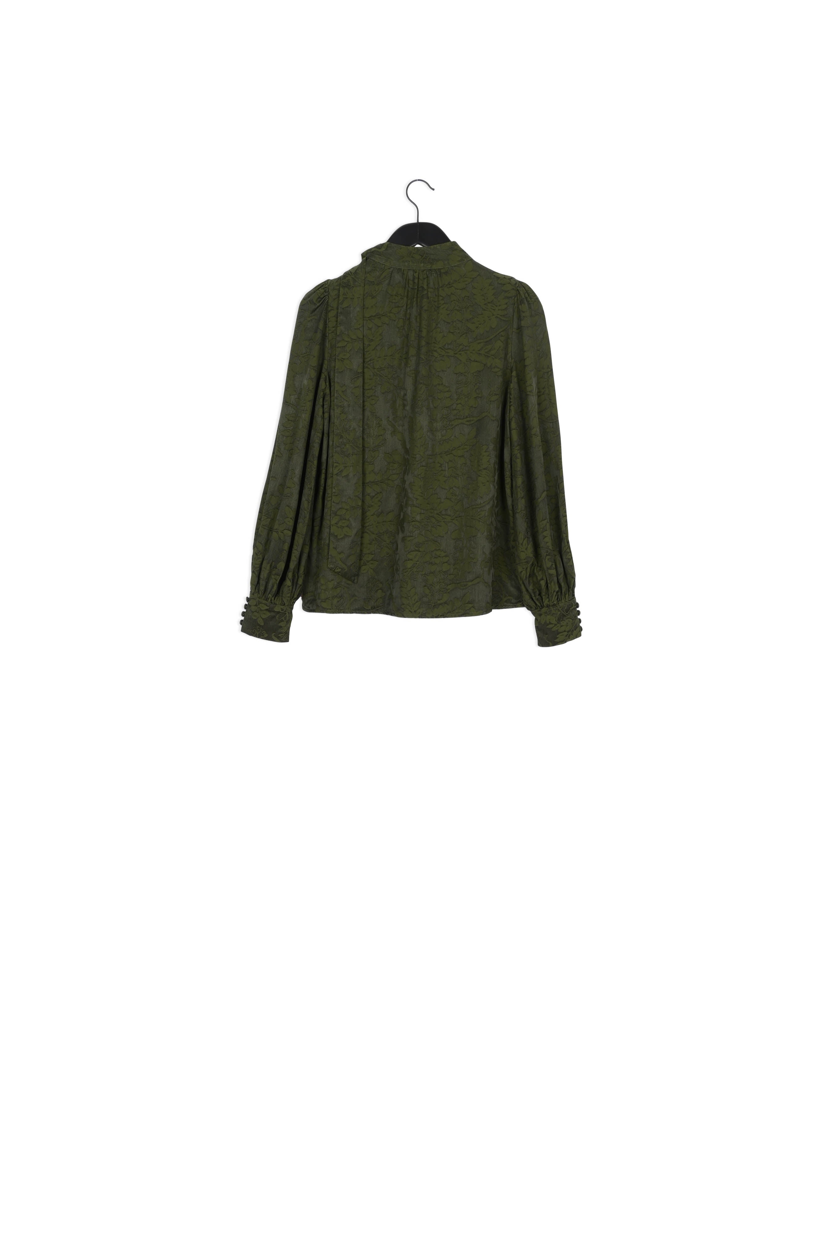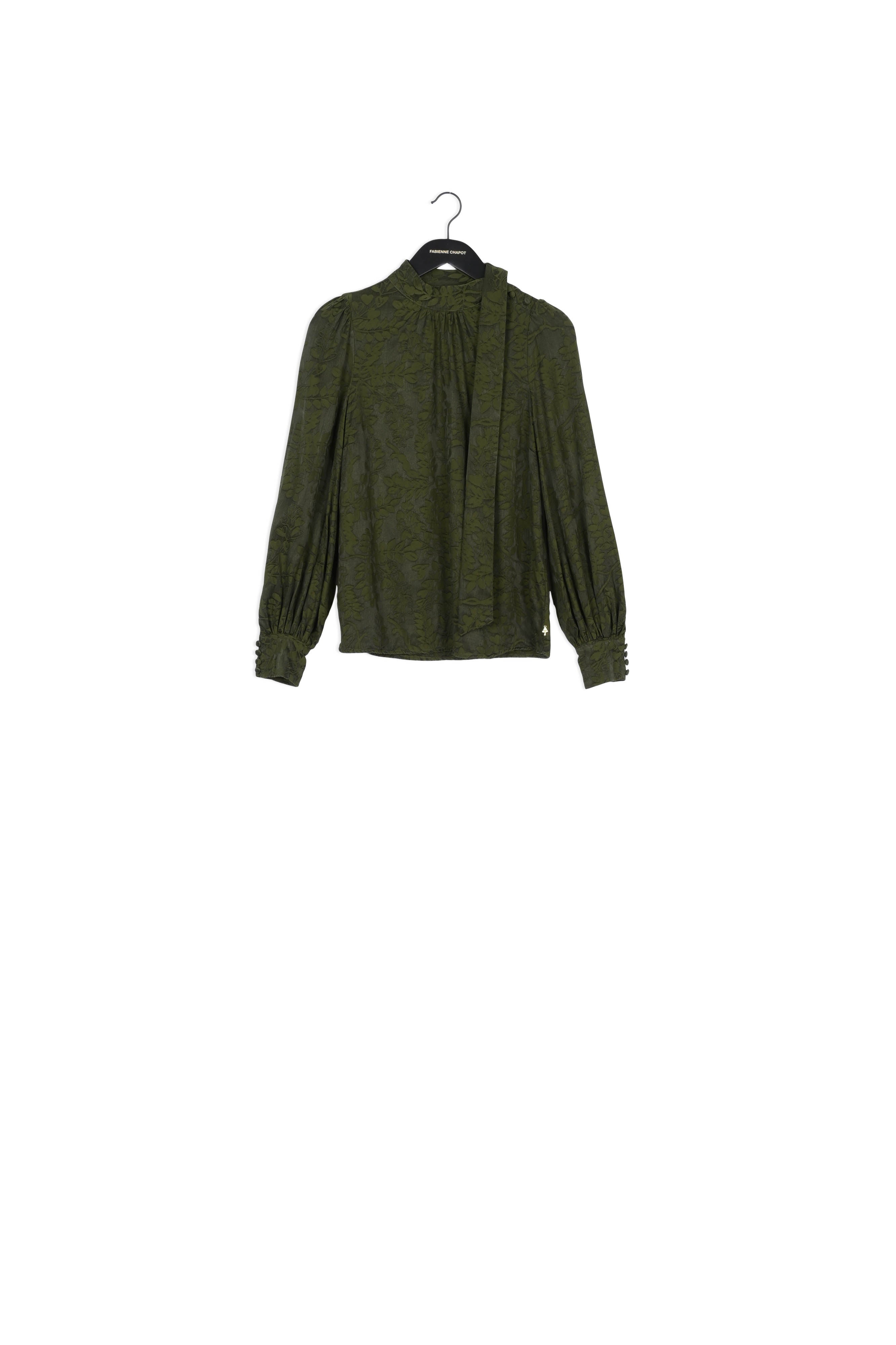 High neck top with tie detail at the neck. Michou top has balloon sleeves, fitted cuffs and a beautiful all over jacquard print with leaves. -