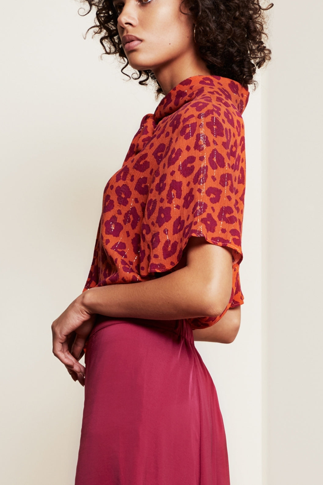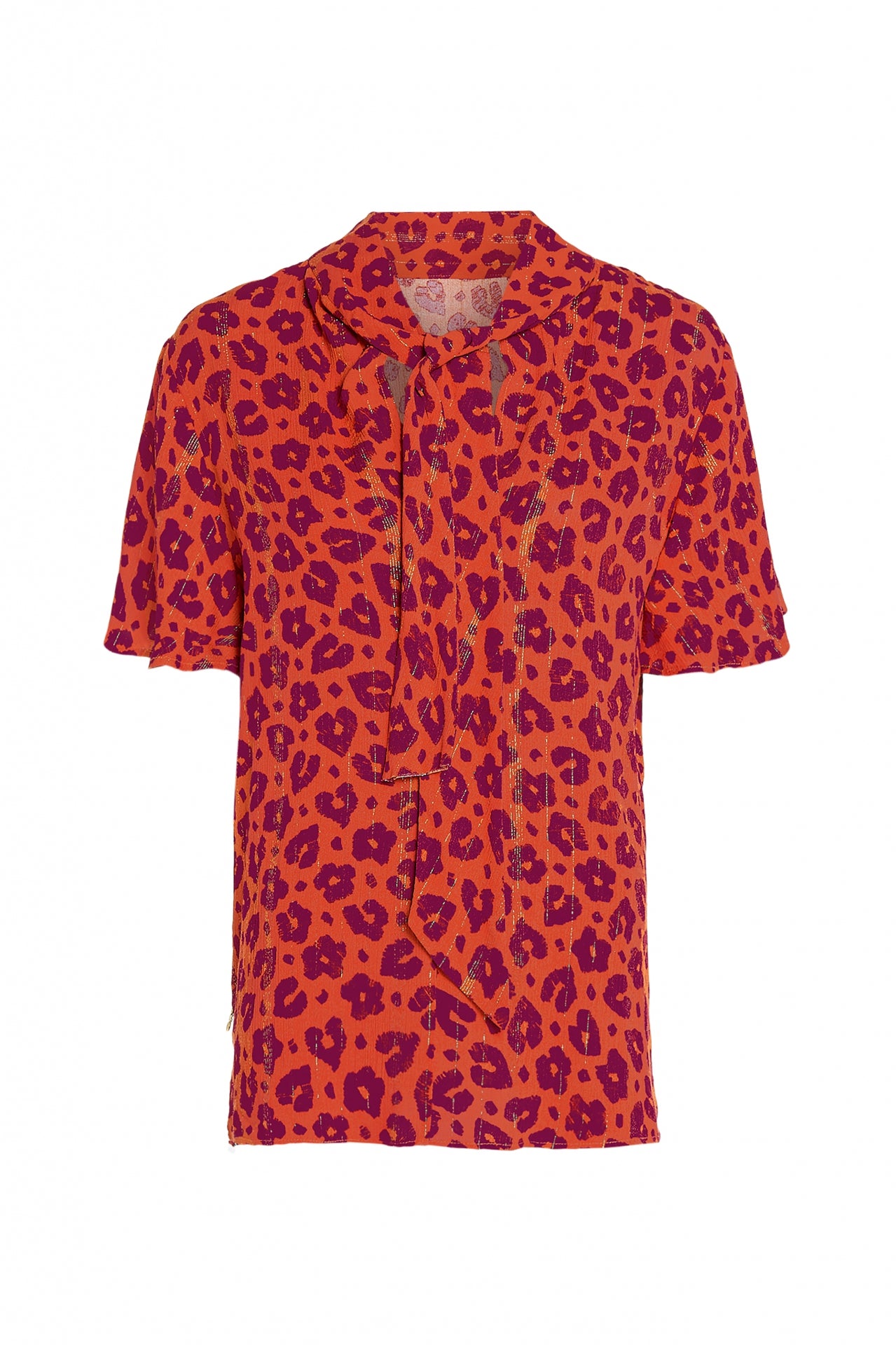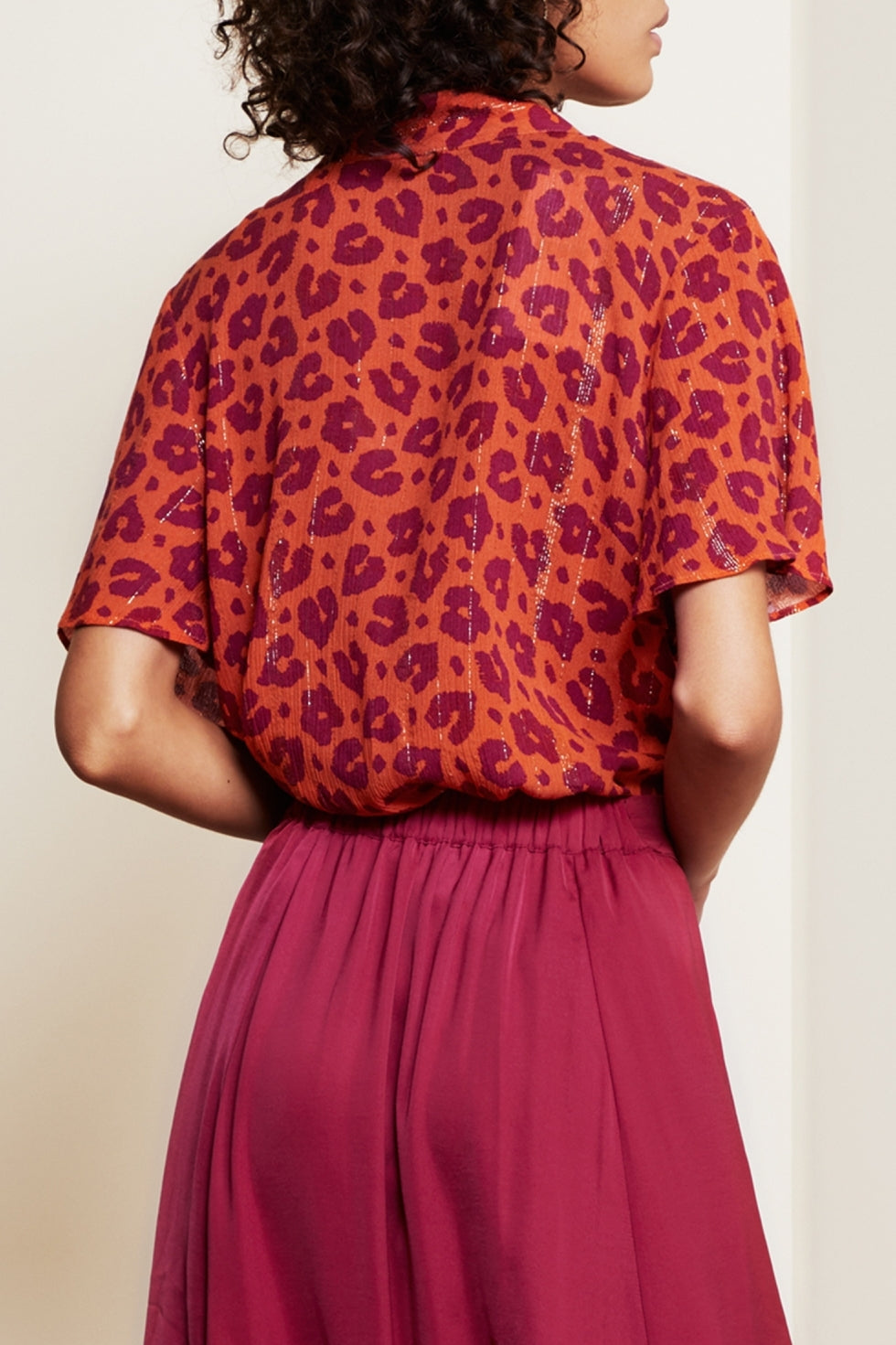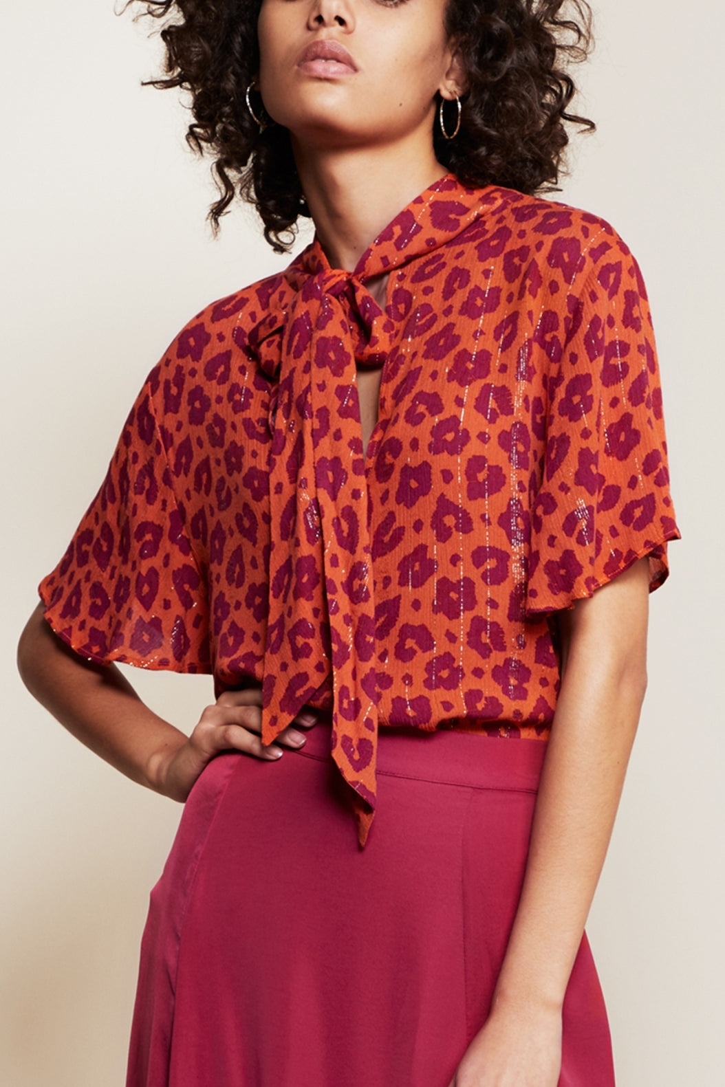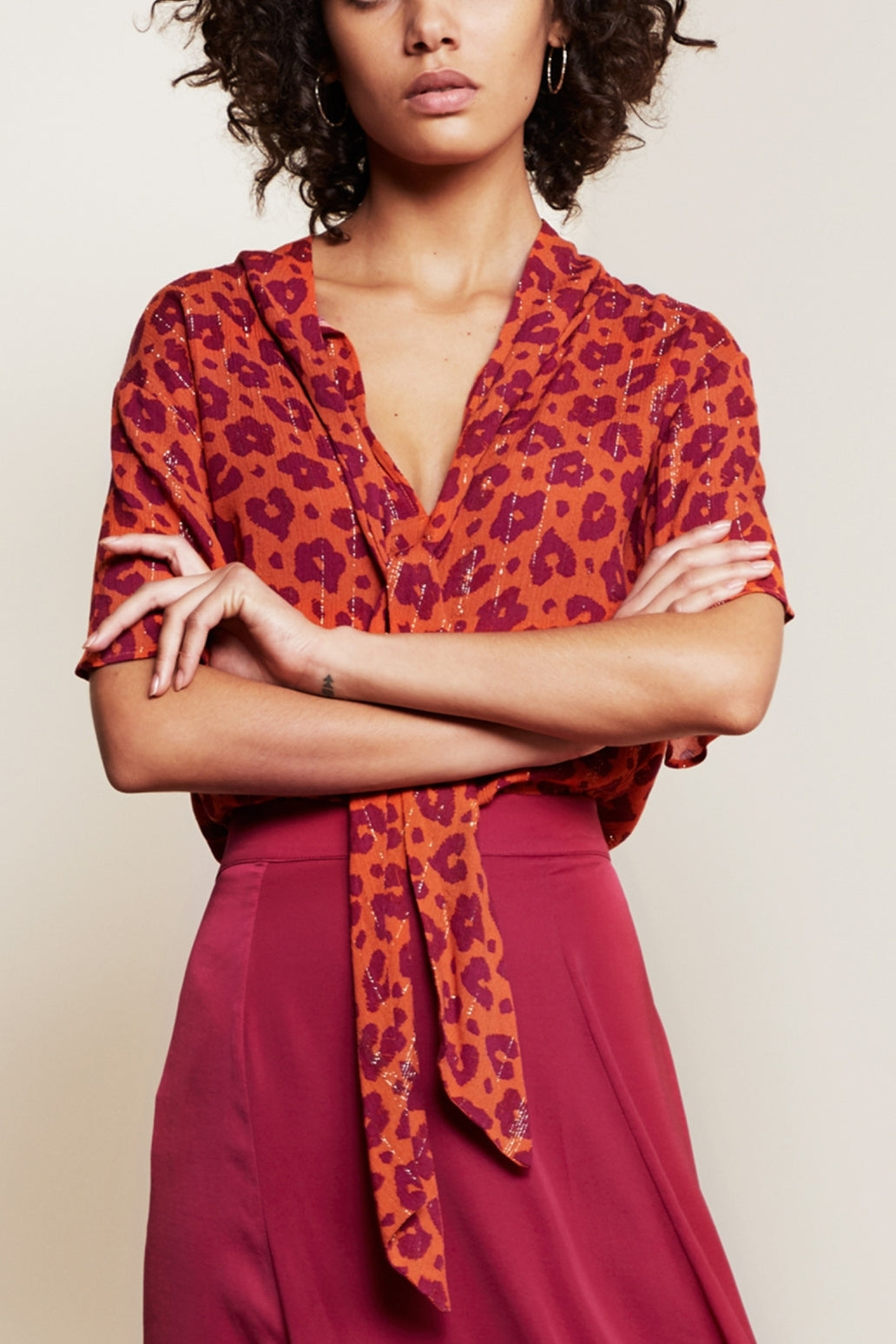 Flowing blouse with short sleeves, V neck and ribbons on the collar which can be tied. Fabienne Lou Top has a gold lurex thread woven through the fabric. -
