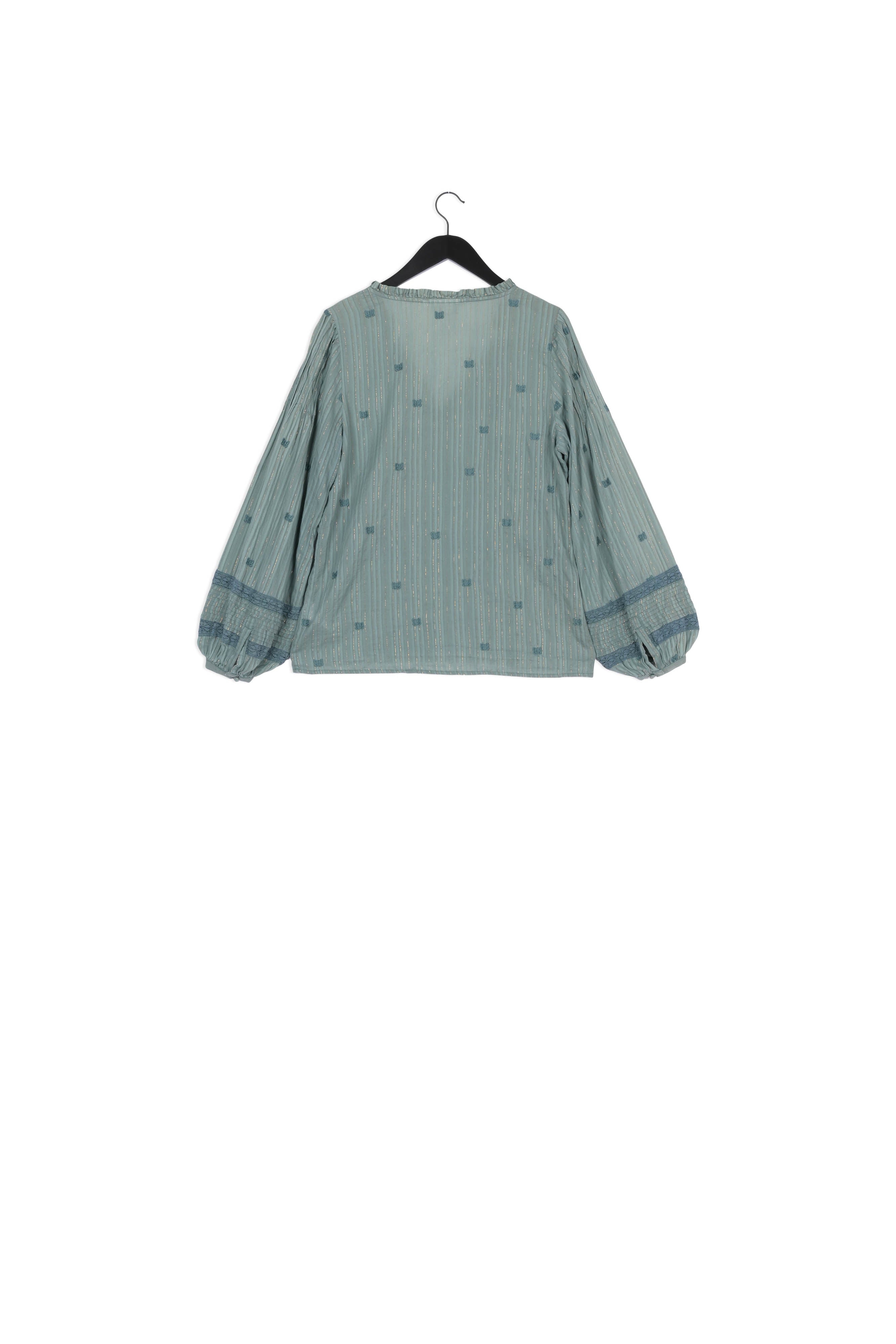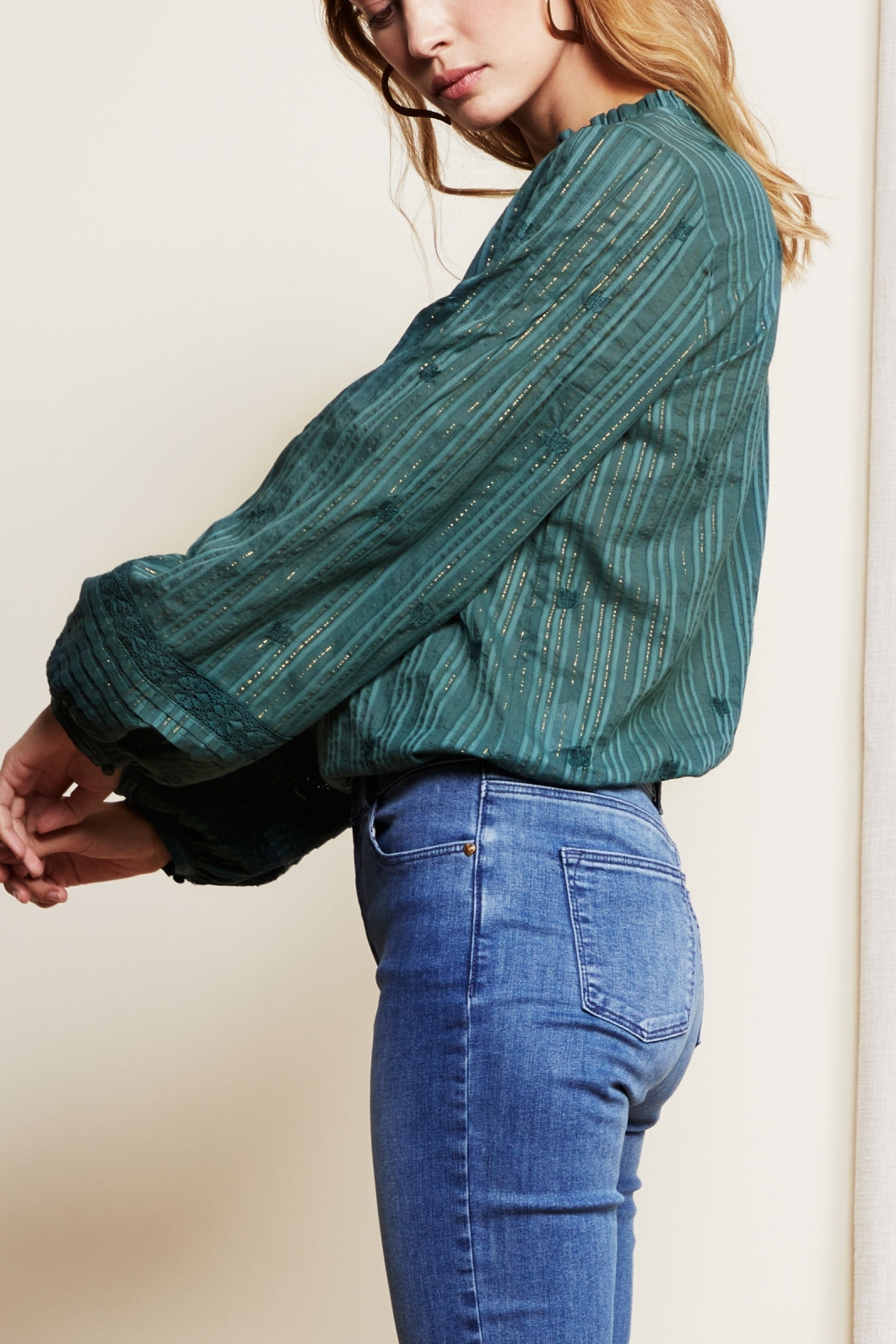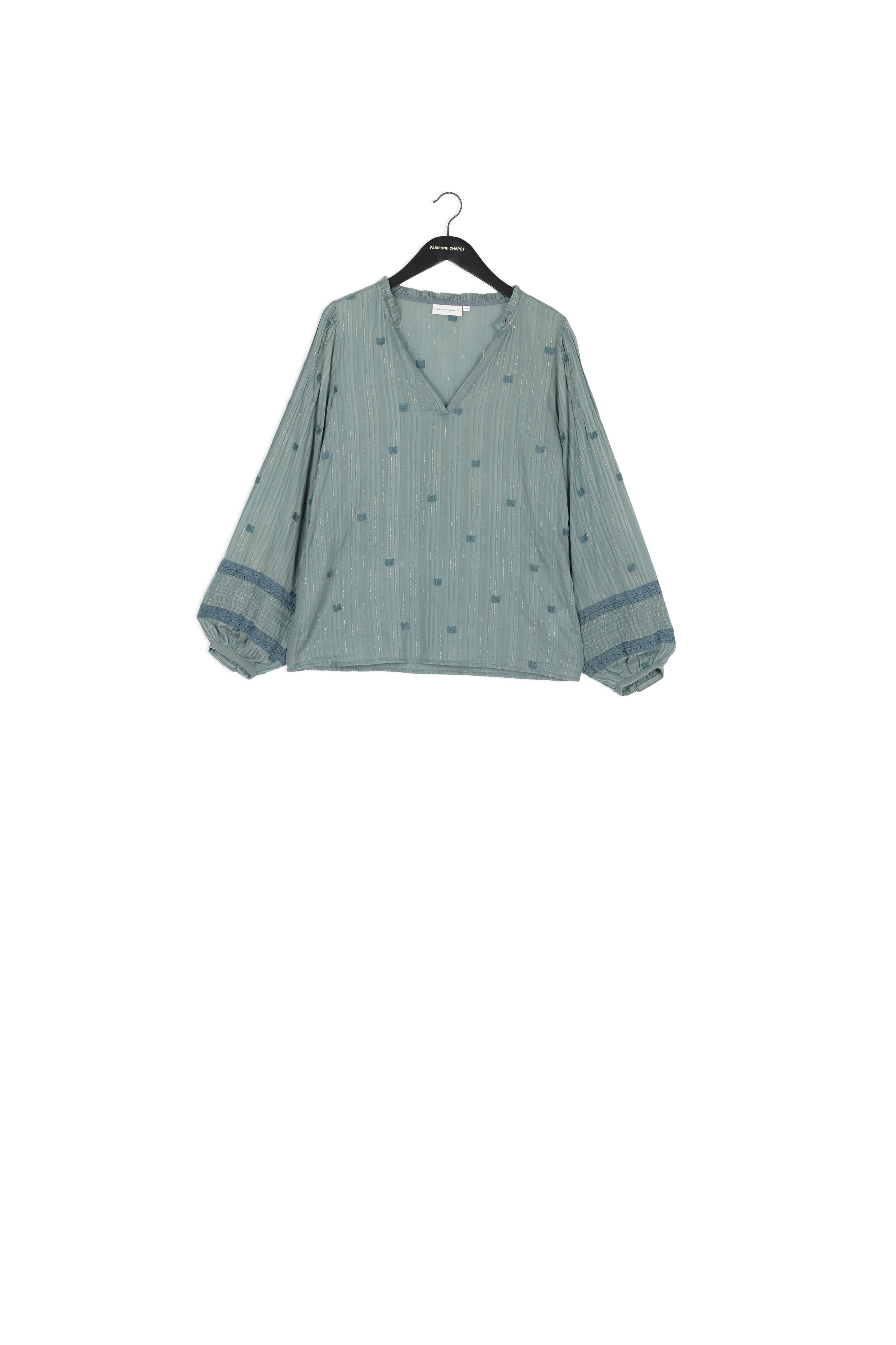 Flowing top with V-neck, small embroidered butterflies and a ruffle detail in the collar. Kenri Top has puffed sleeves and a golden lurex thread woven through the fabric. -