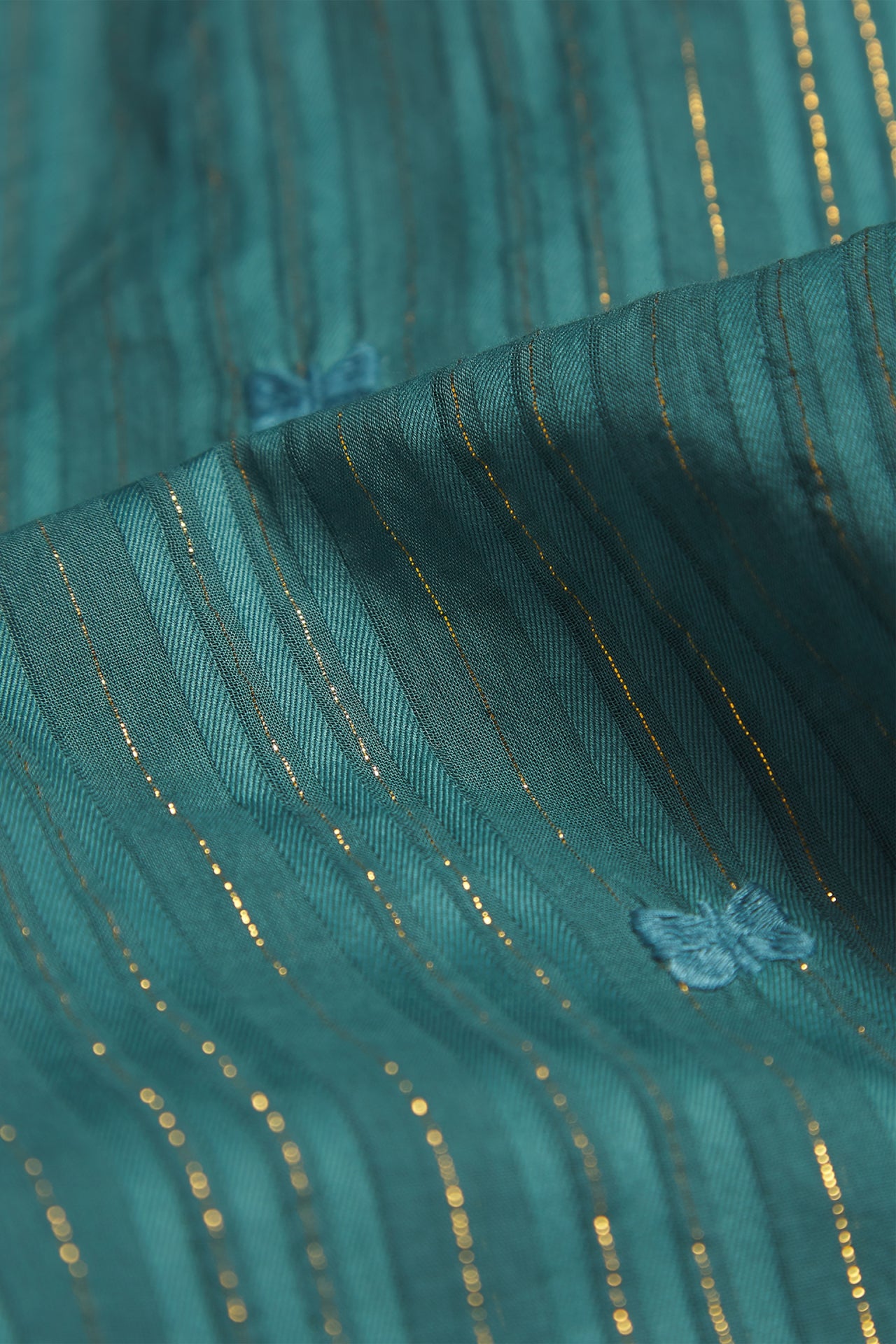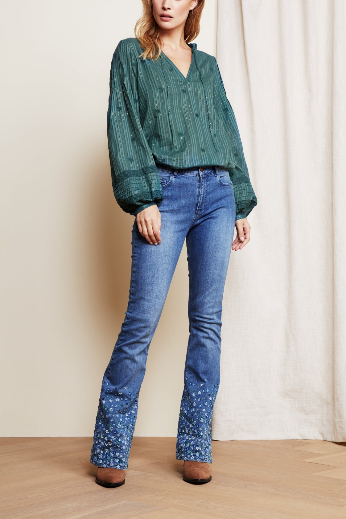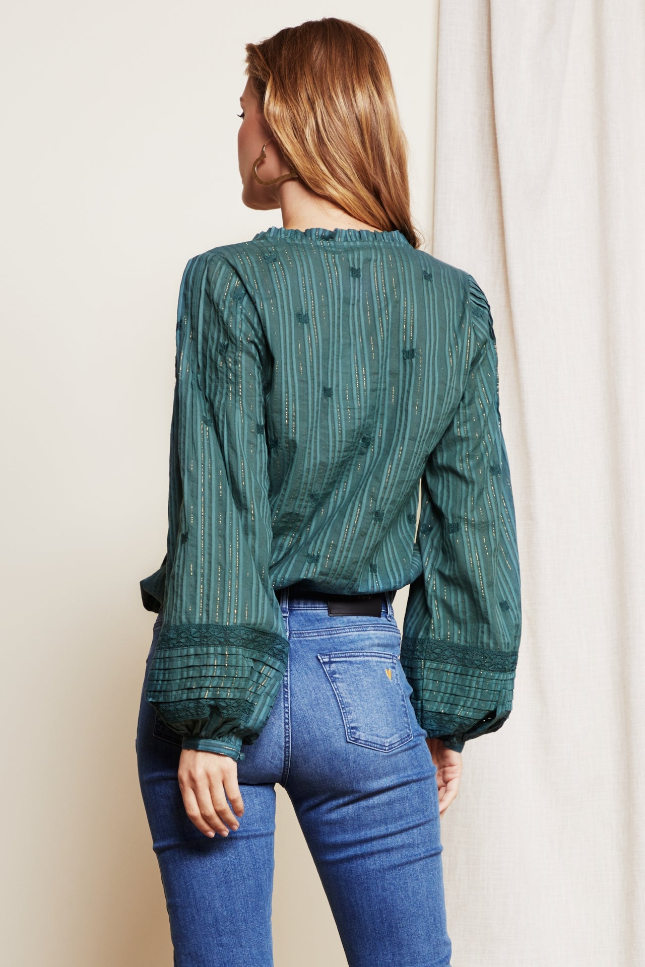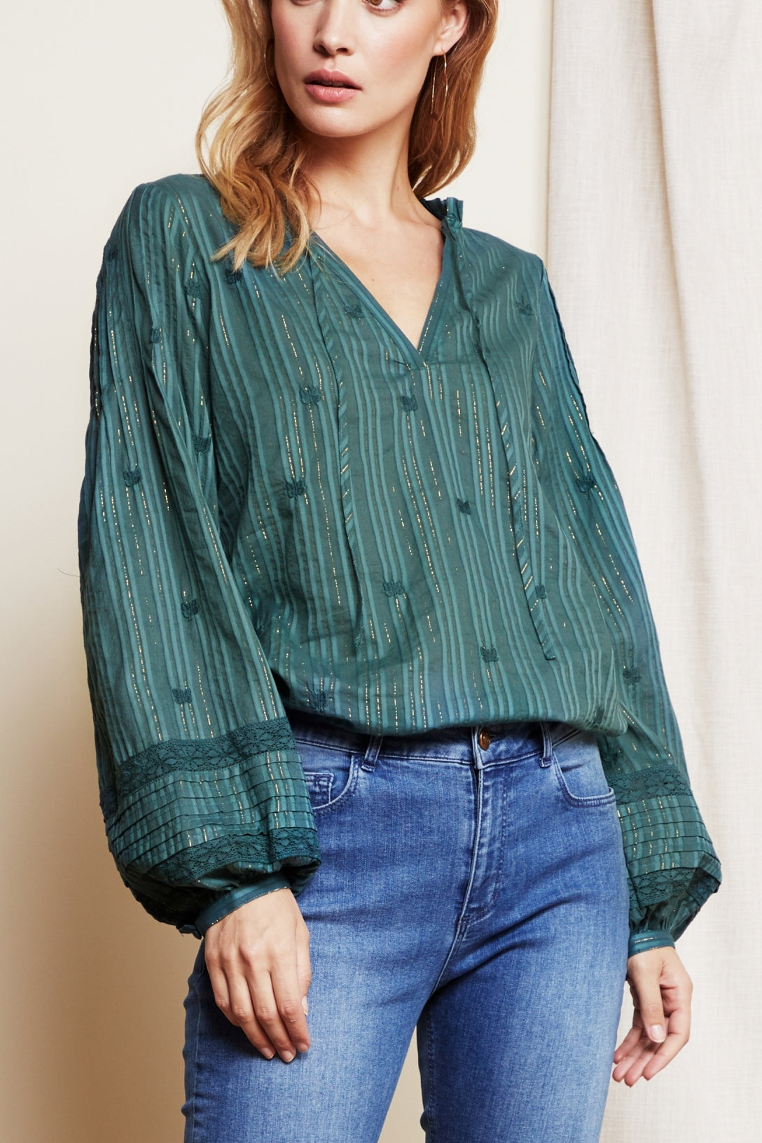 Flowing top with V-neck, small embroidered butterflies and a ruffle detail in the collar. Kenri Top has puffed sleeves and a golden lurex thread woven through the fabric. -
