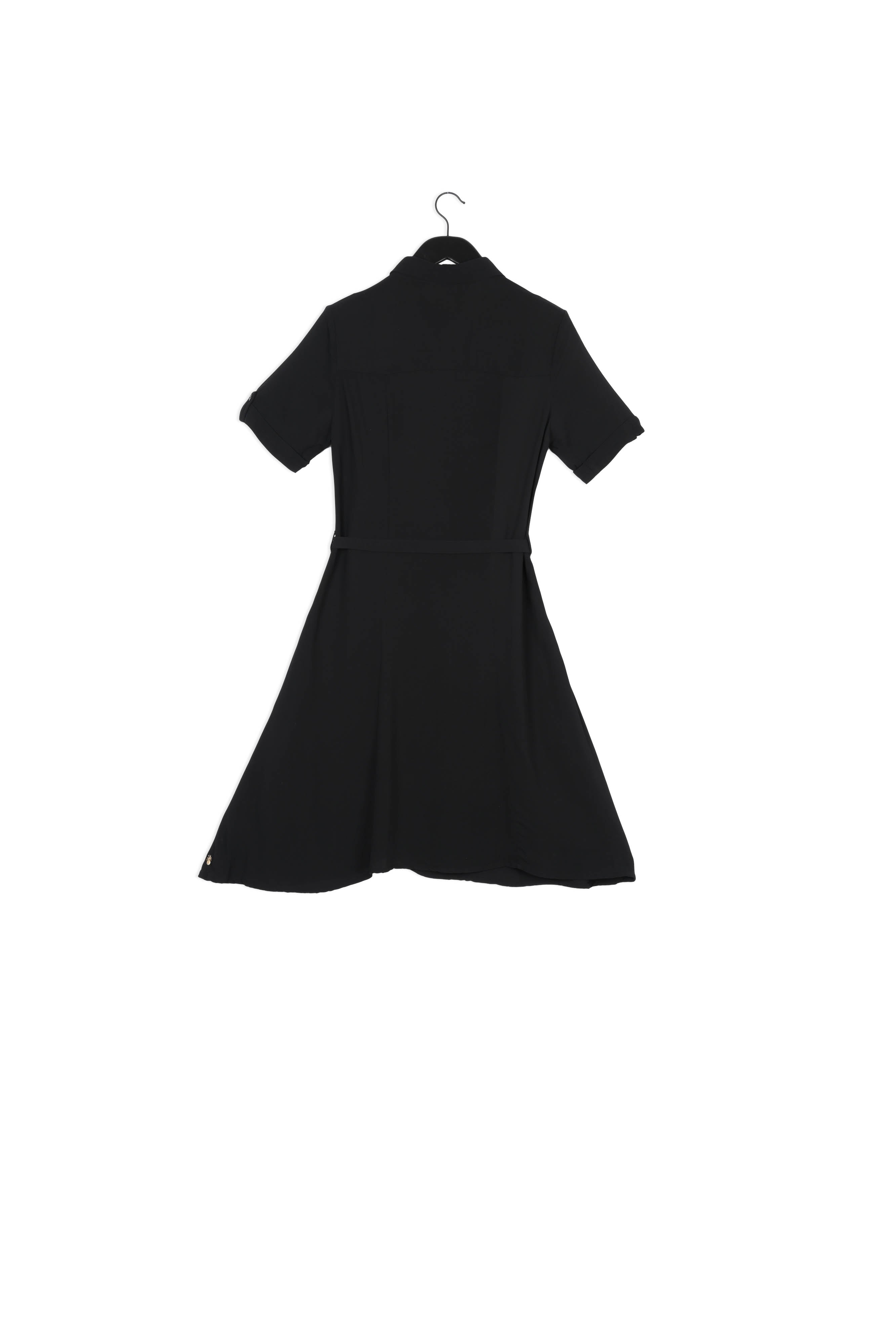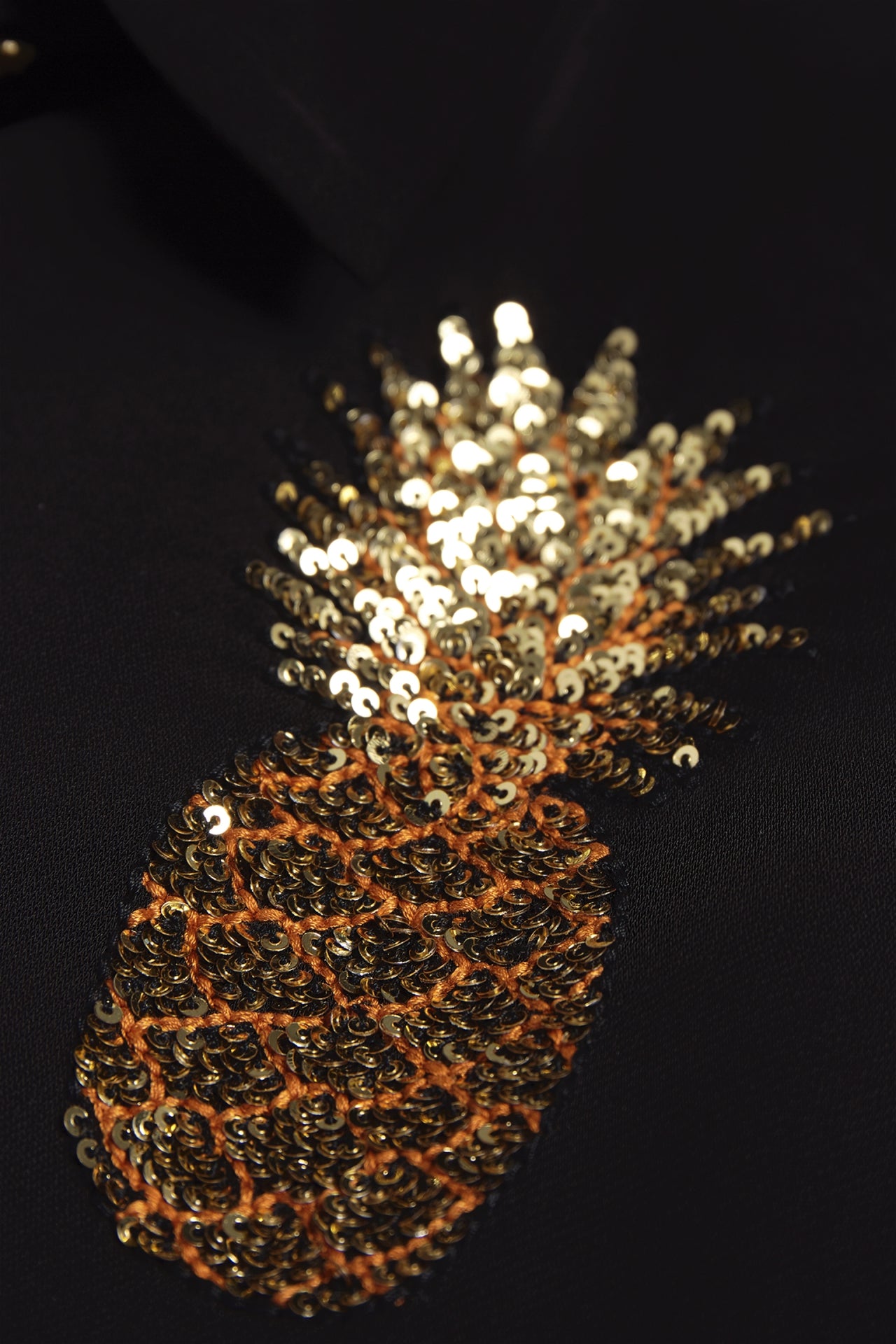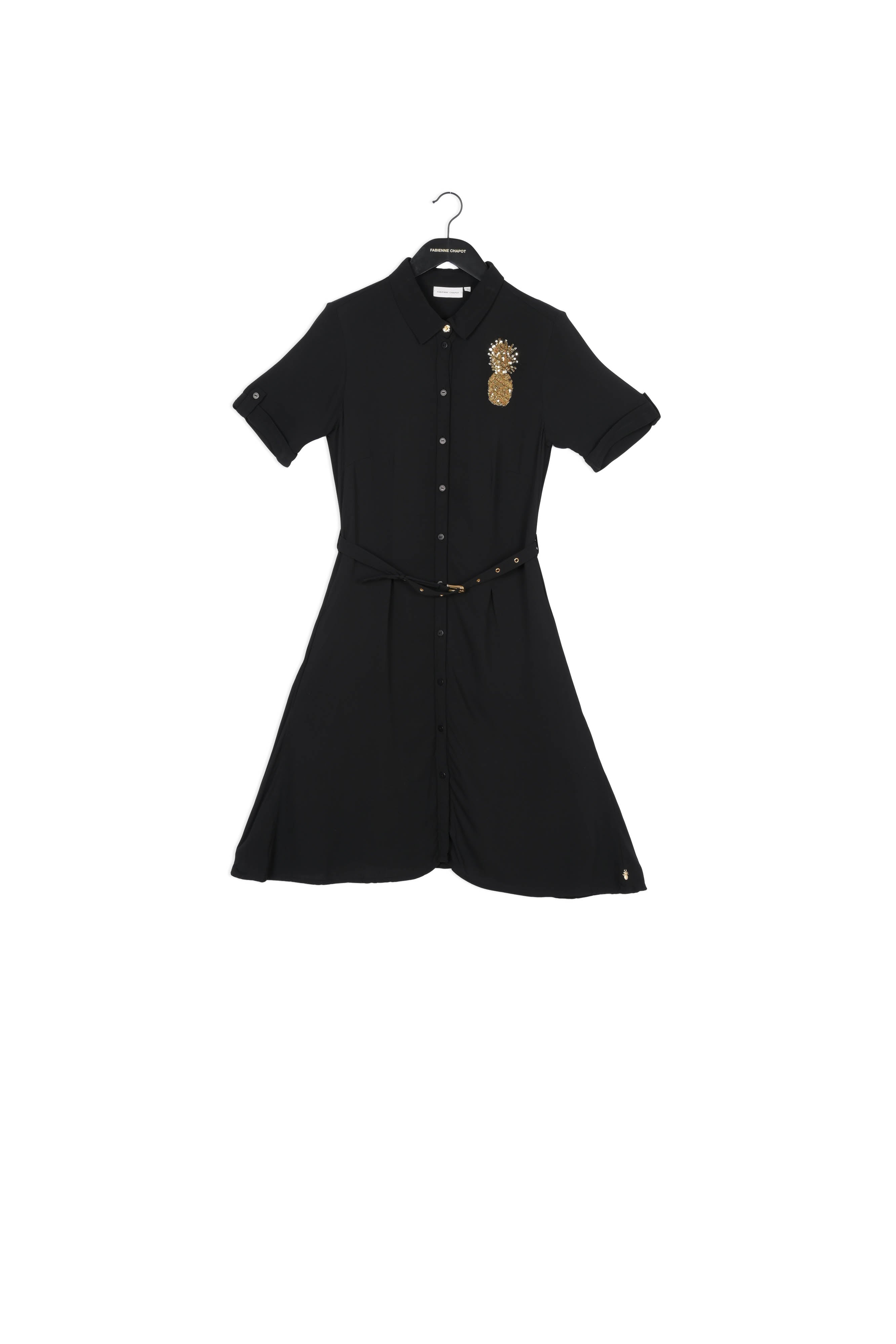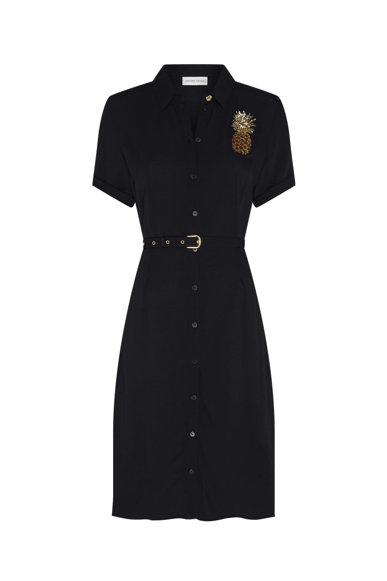 Short flowing dress with waist belt and short sleeves. Mila Dress has a button closure down the length of the dress and a gold-coloured button on the cuff and a sequinned pineapple on the chest.