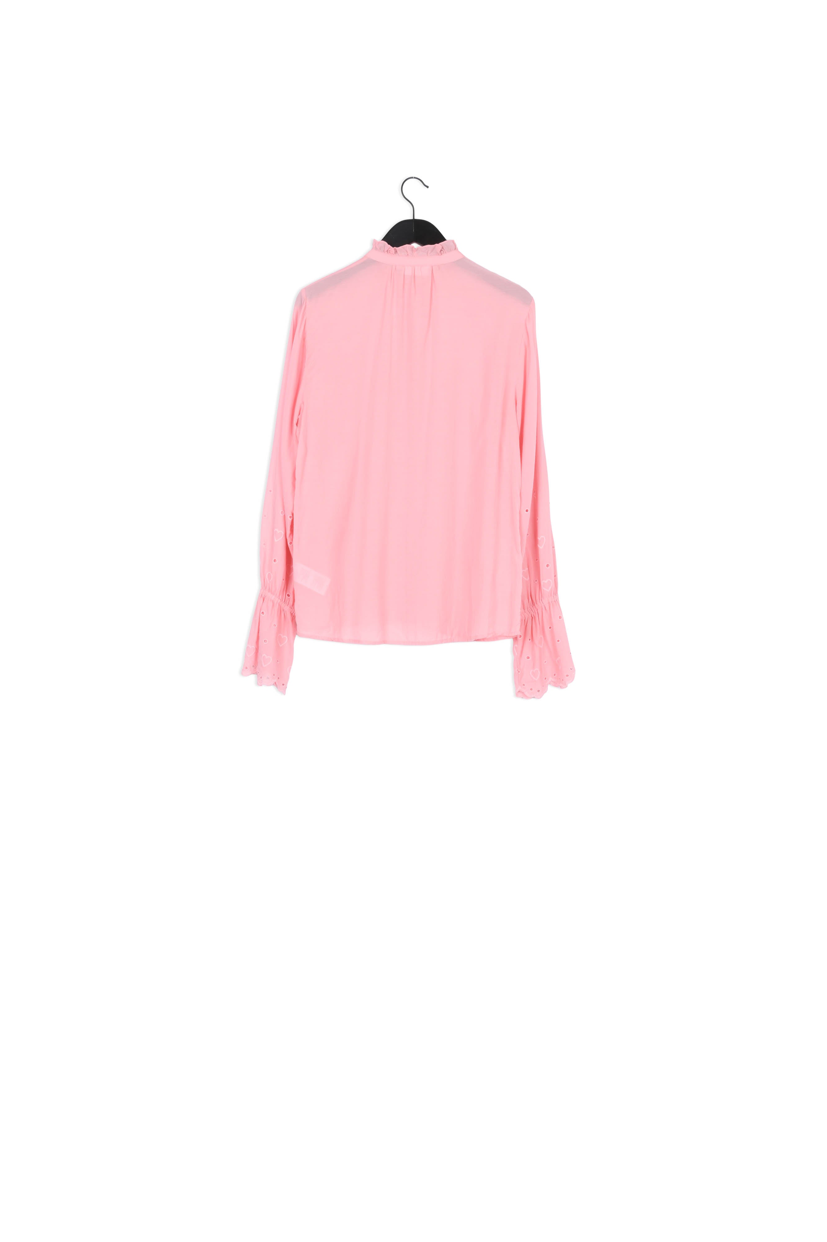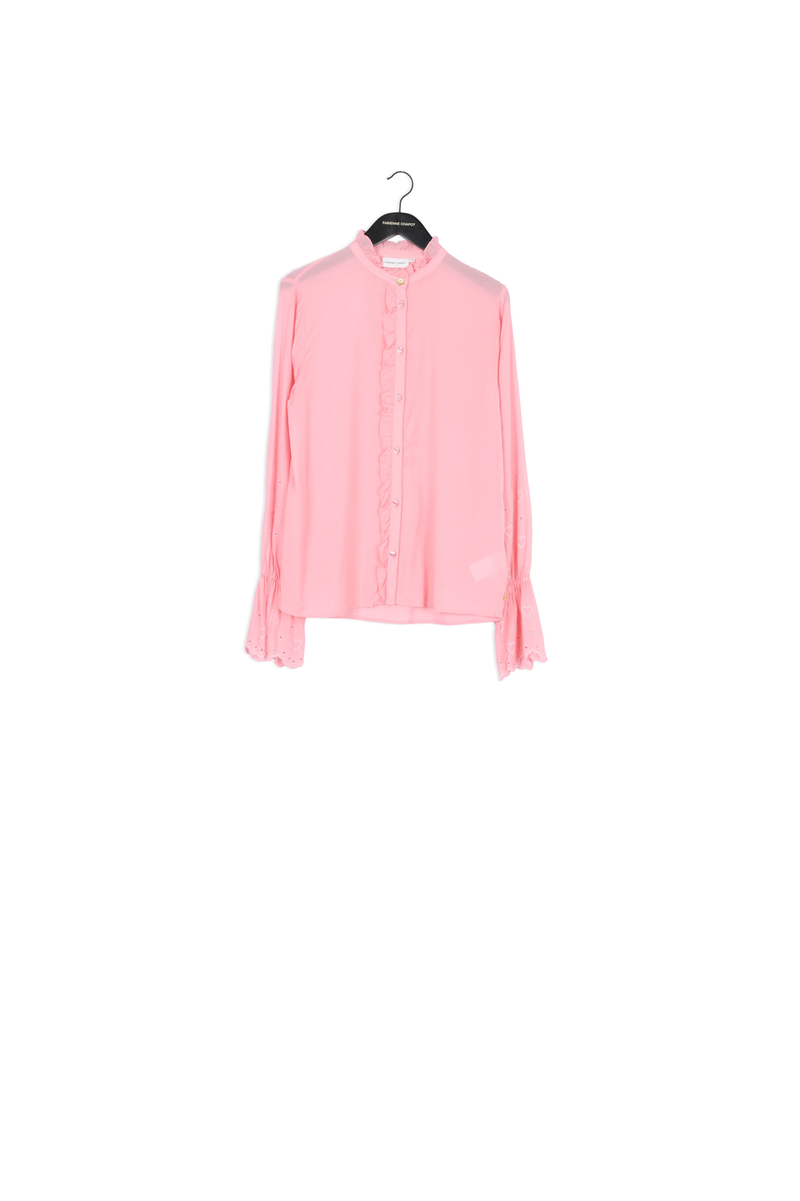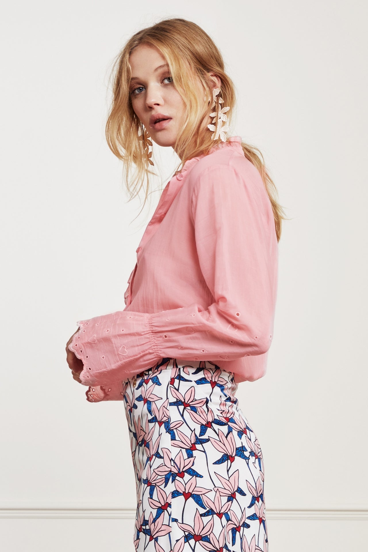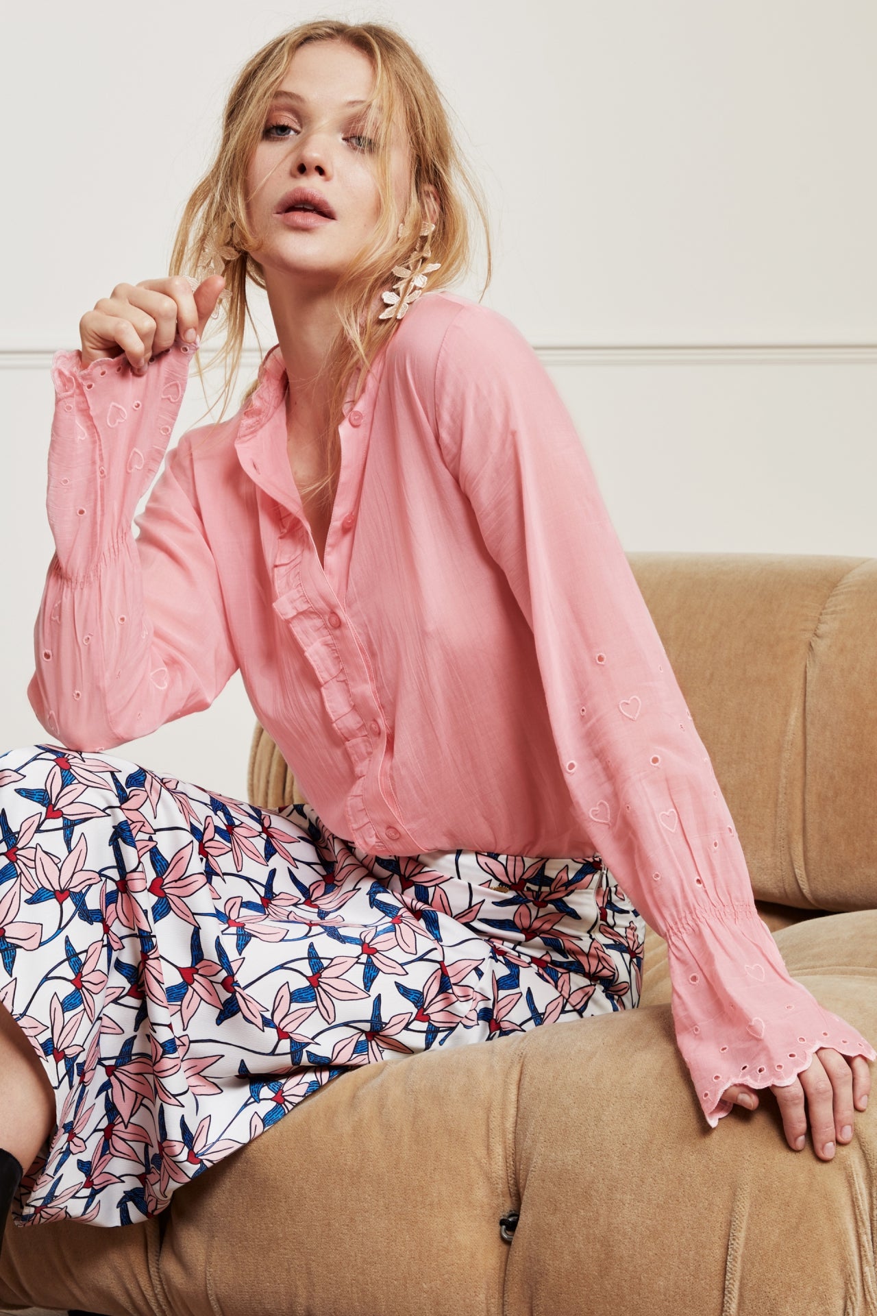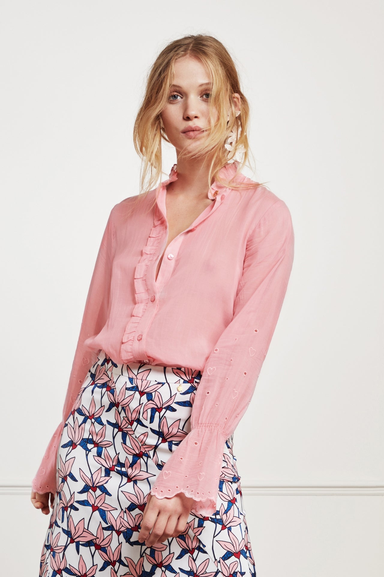 Blouse with ruffles along the button closure and collar. Clara Blouse has embroidered details on the wide flared sleeves. Note: The colours of the items in the video may vary slightly.