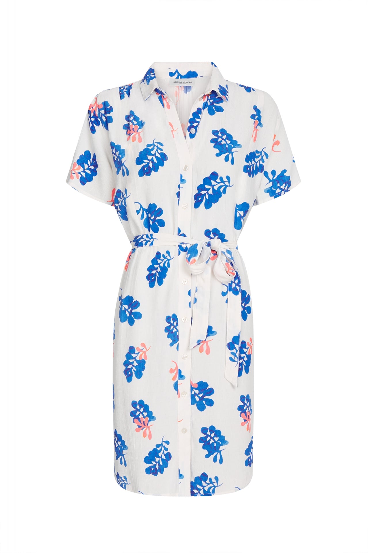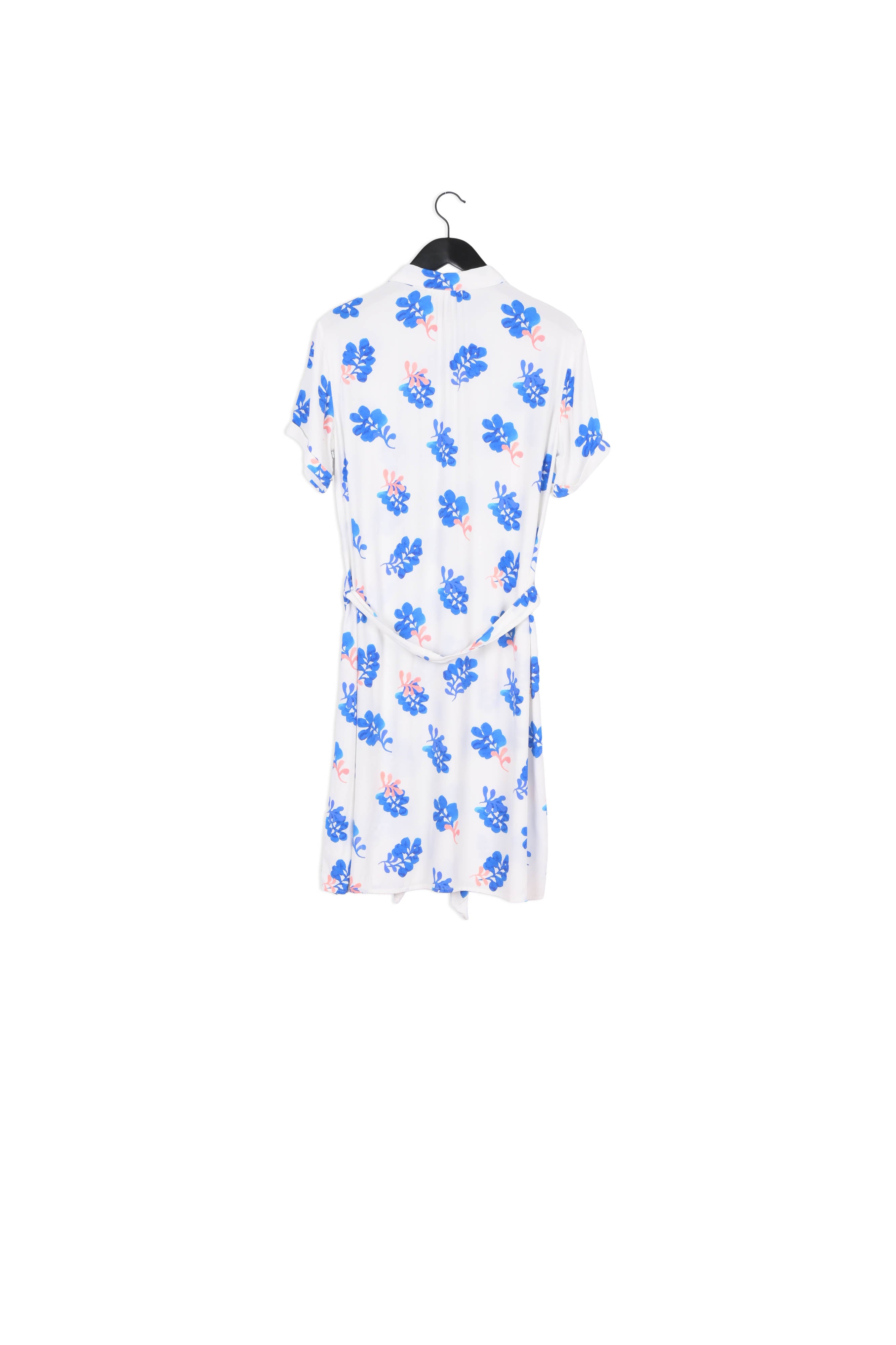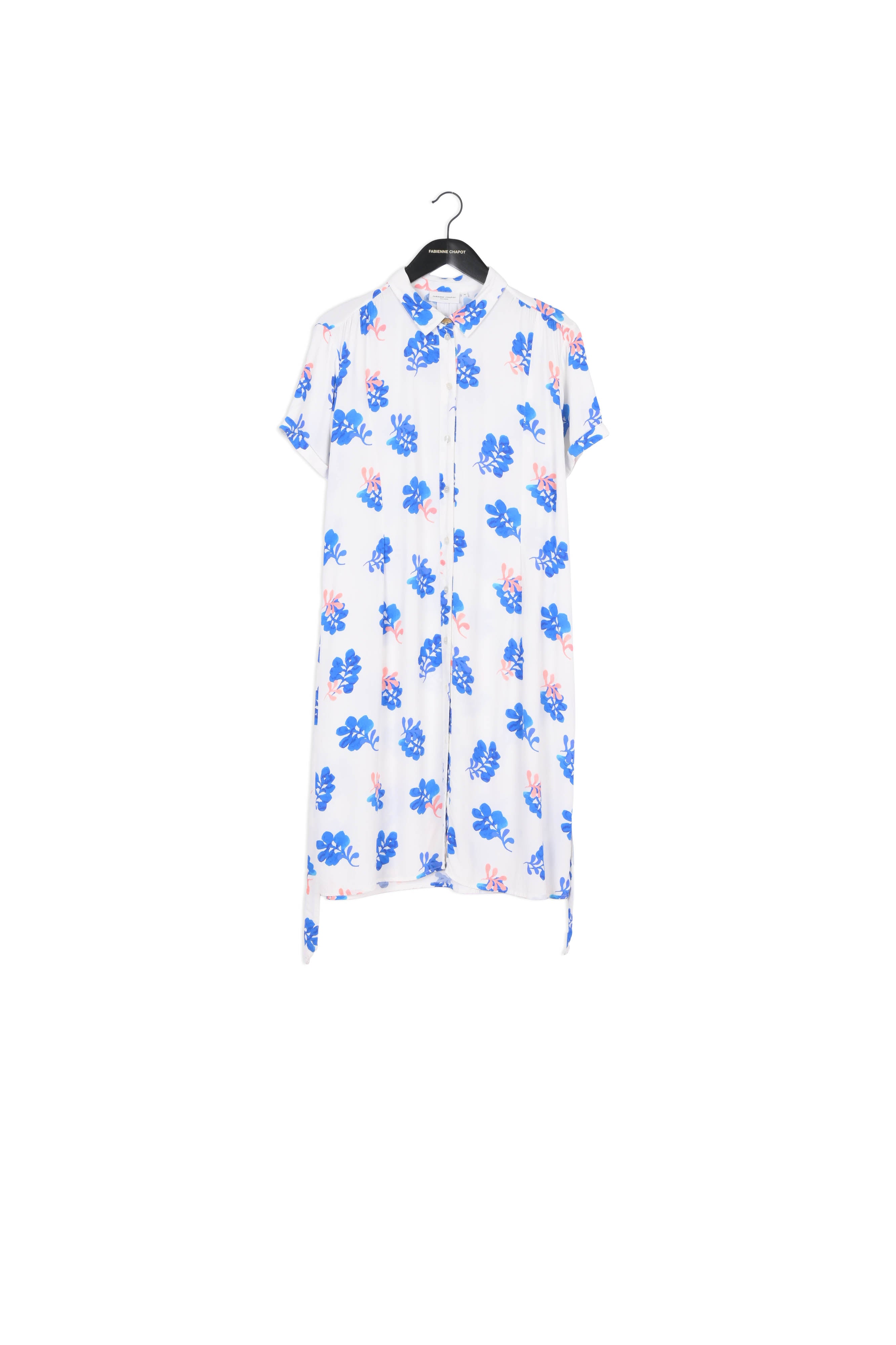 Oversized boyfriend dress with tie belt, button closure over the length of the dress and short turn-up sleeves. Boyfriend Lou Dress has a gold-coloured button on the neck trim. -