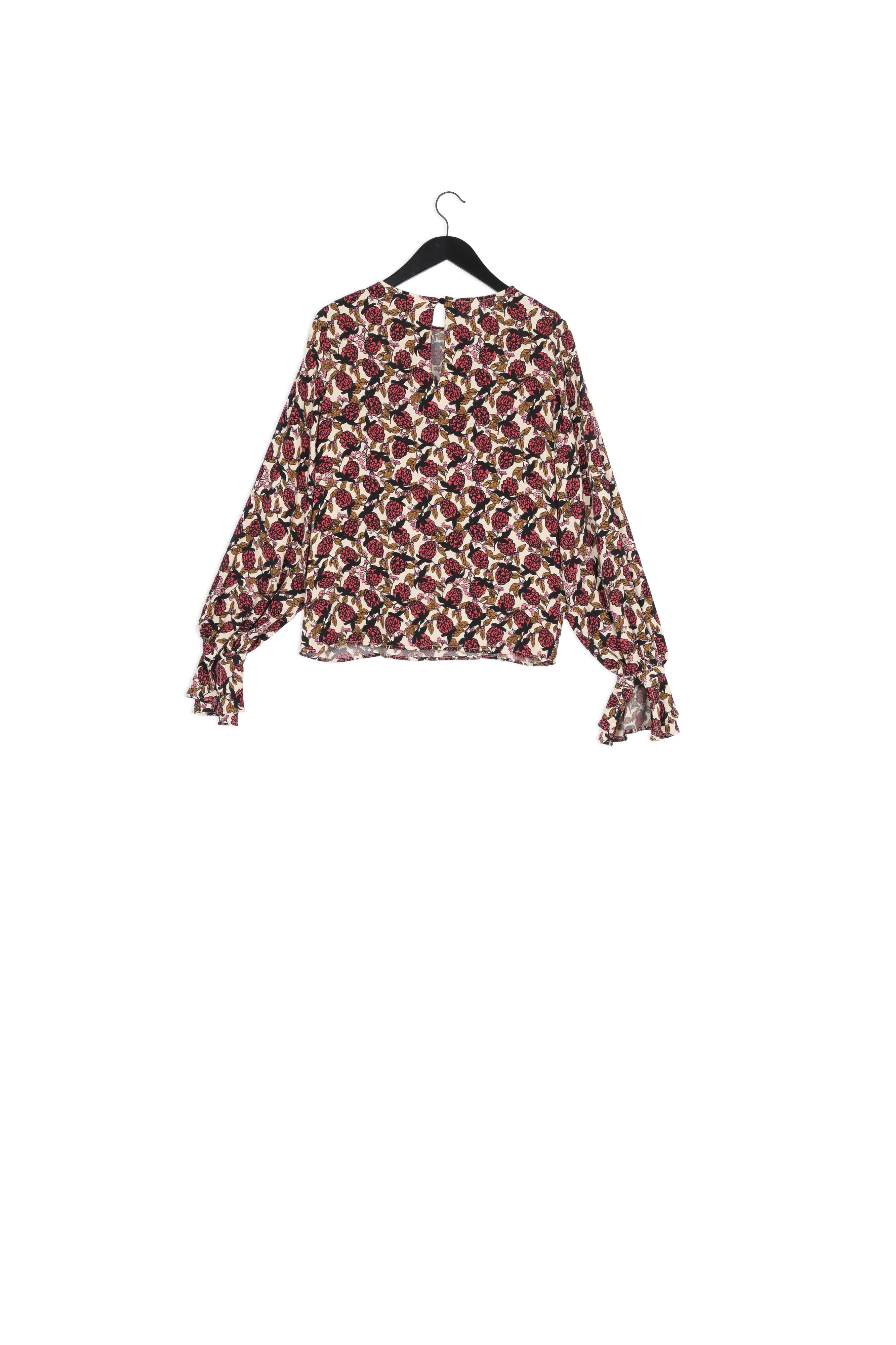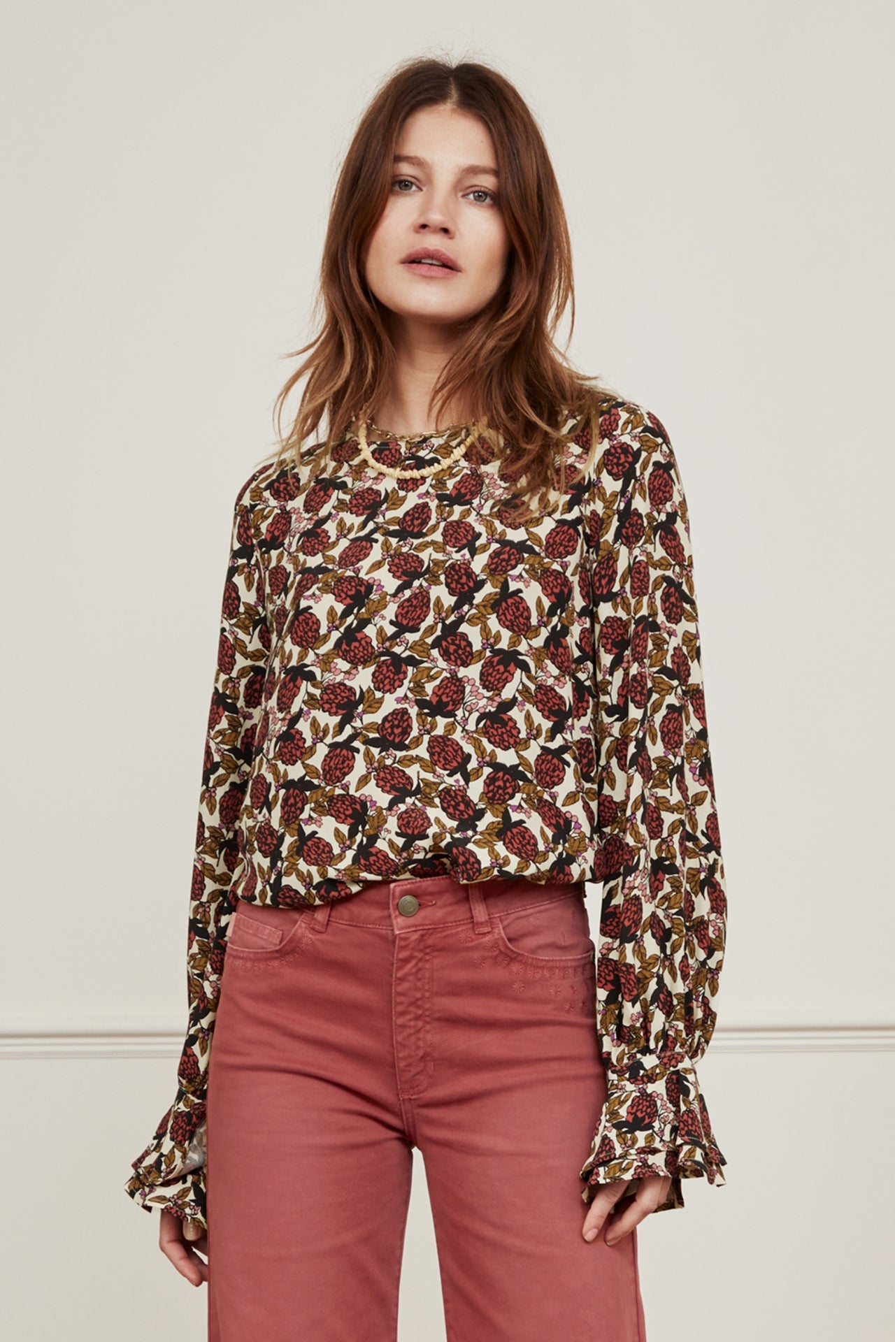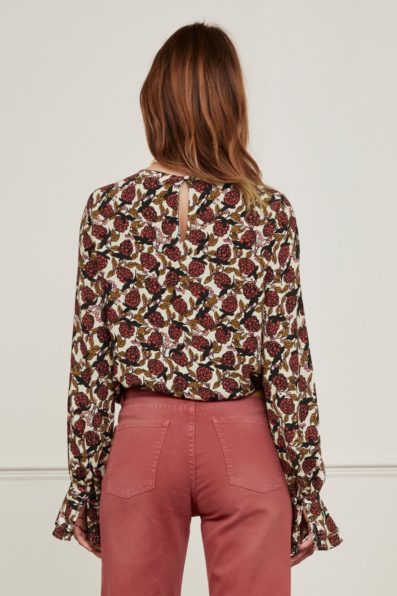 Flowing top with round neckline and button fastening at the back. Lia Tess Top features balloon sleeves and flared cuffs. -