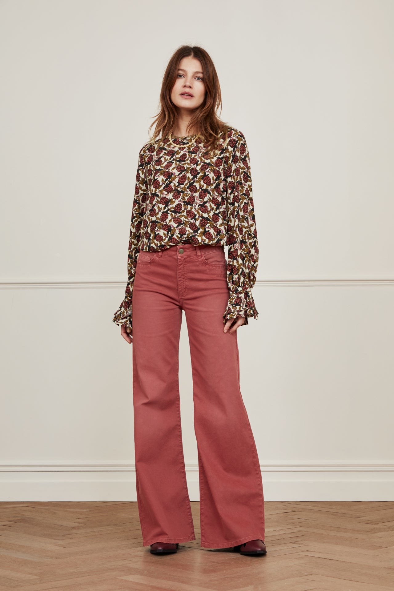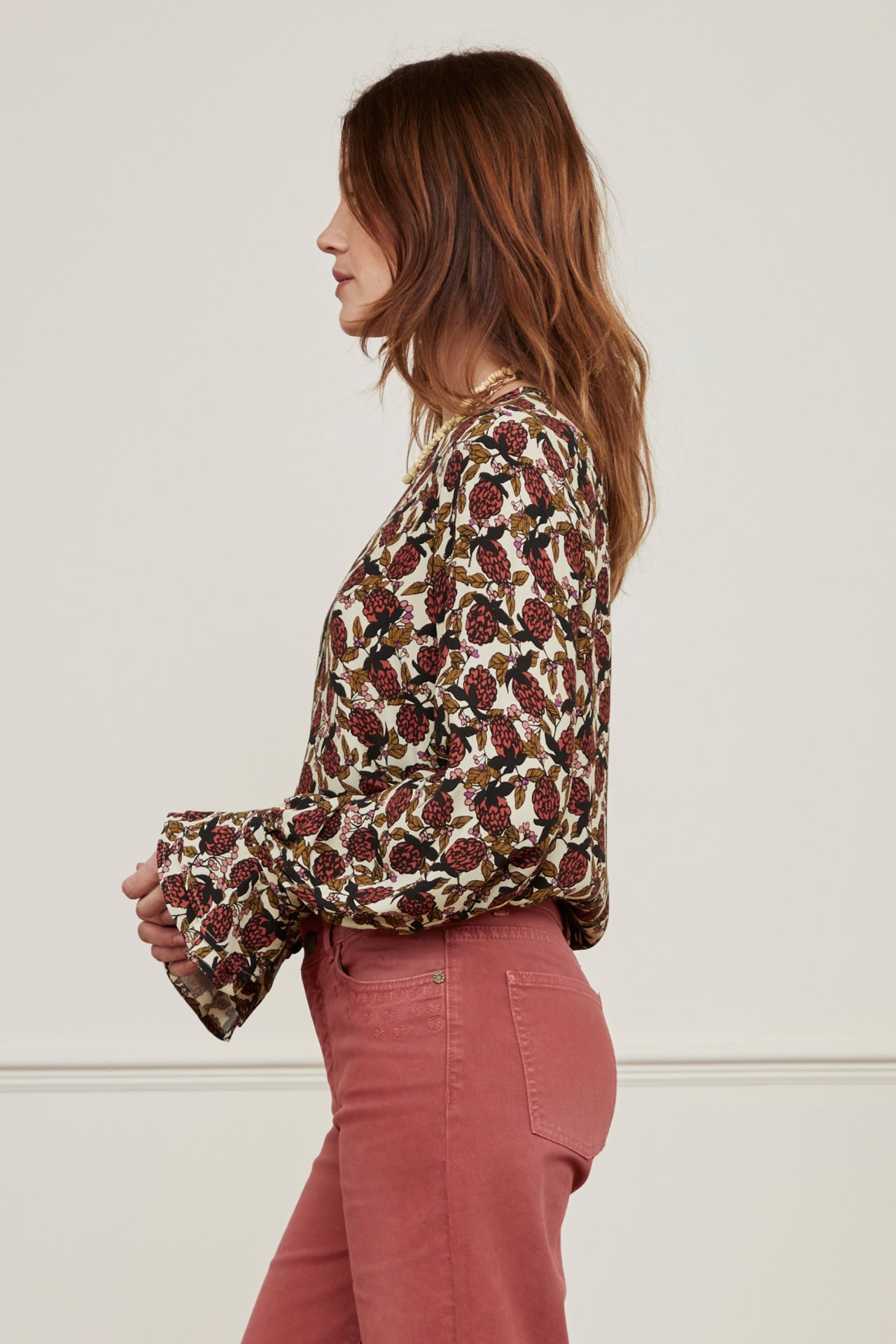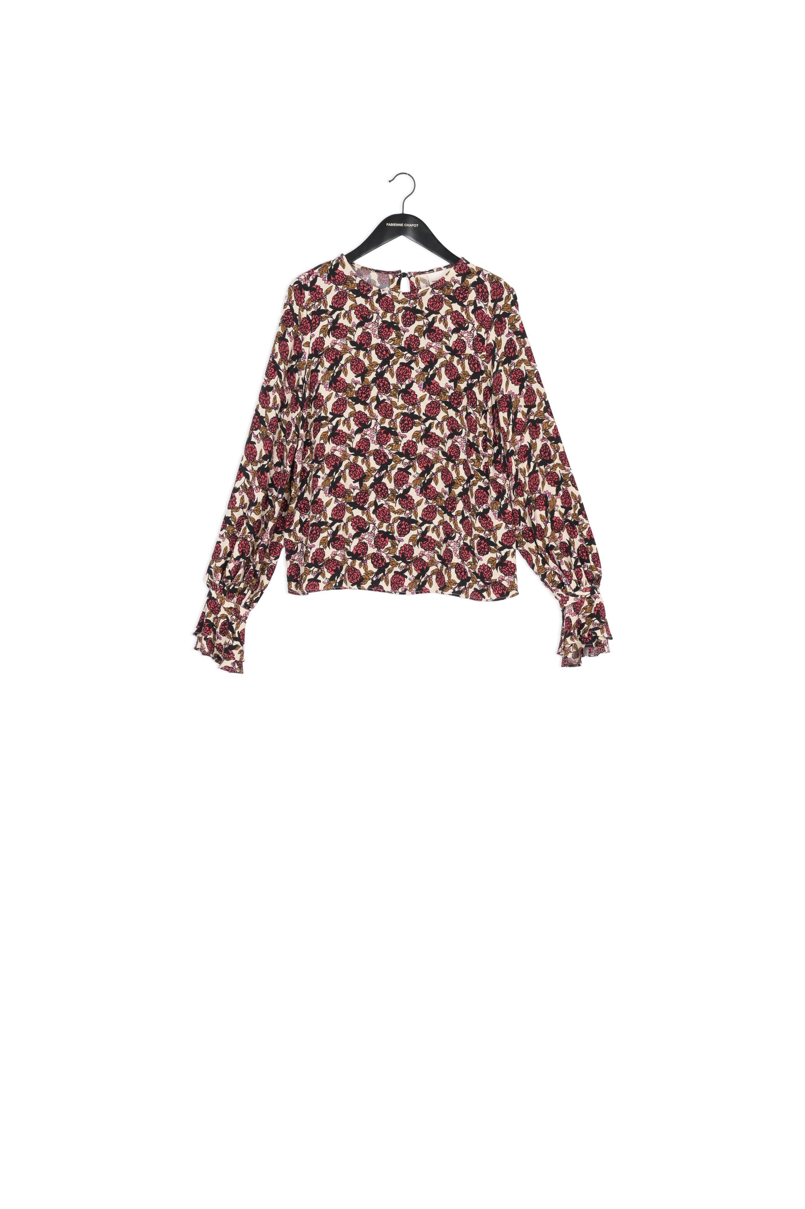 Flowing top with round neckline and button fastening at the back. Lia Tess Top features balloon sleeves and flared cuffs. -