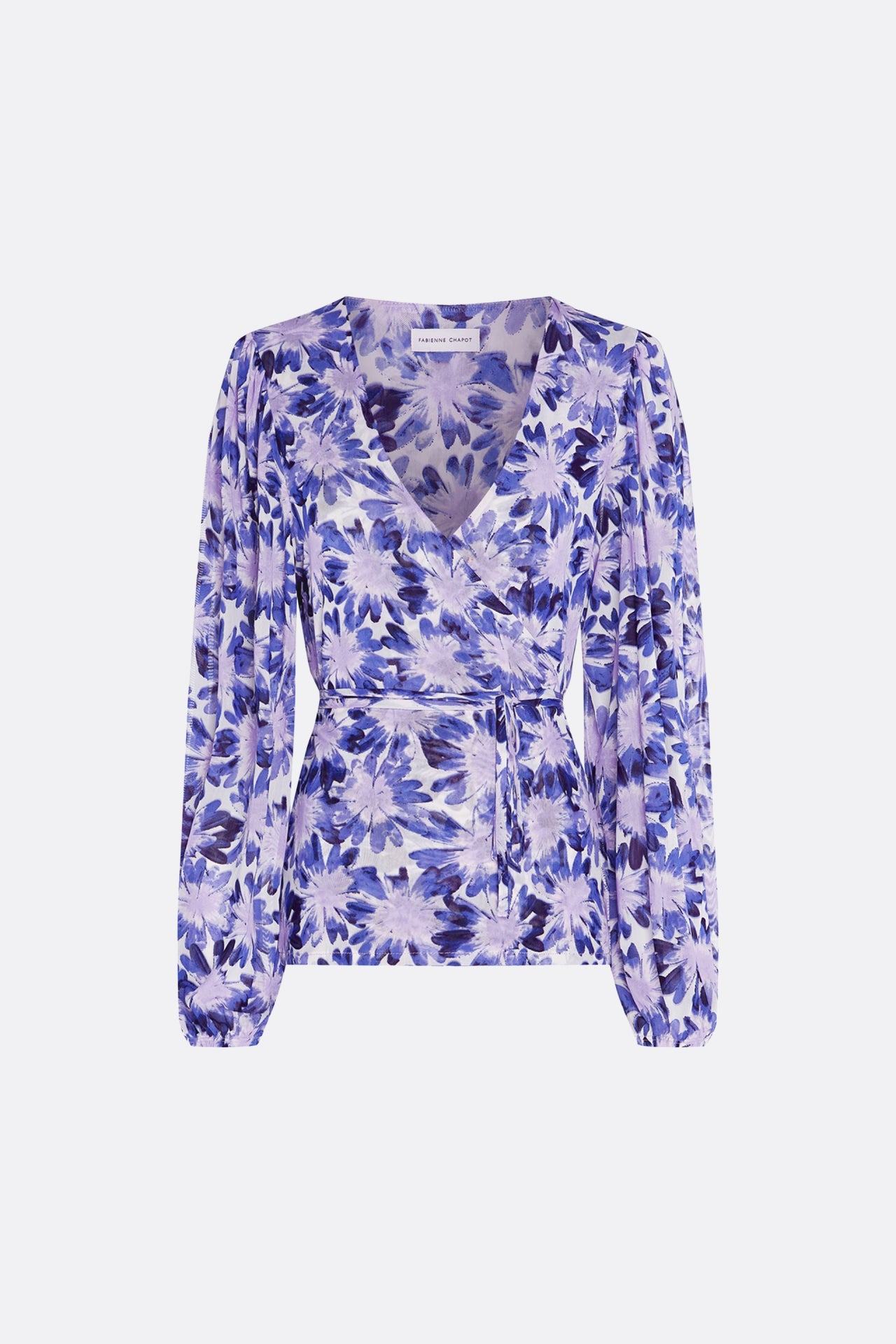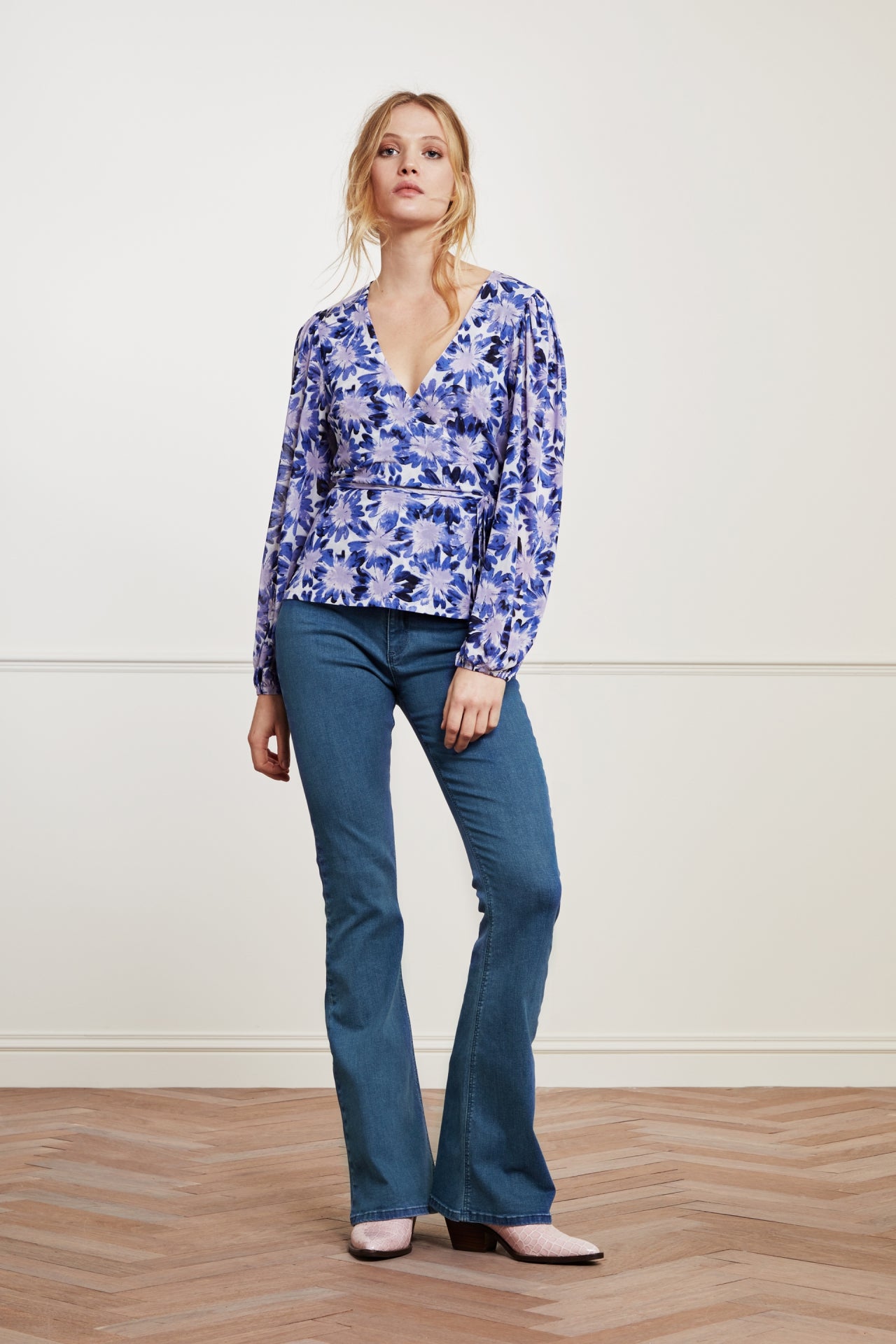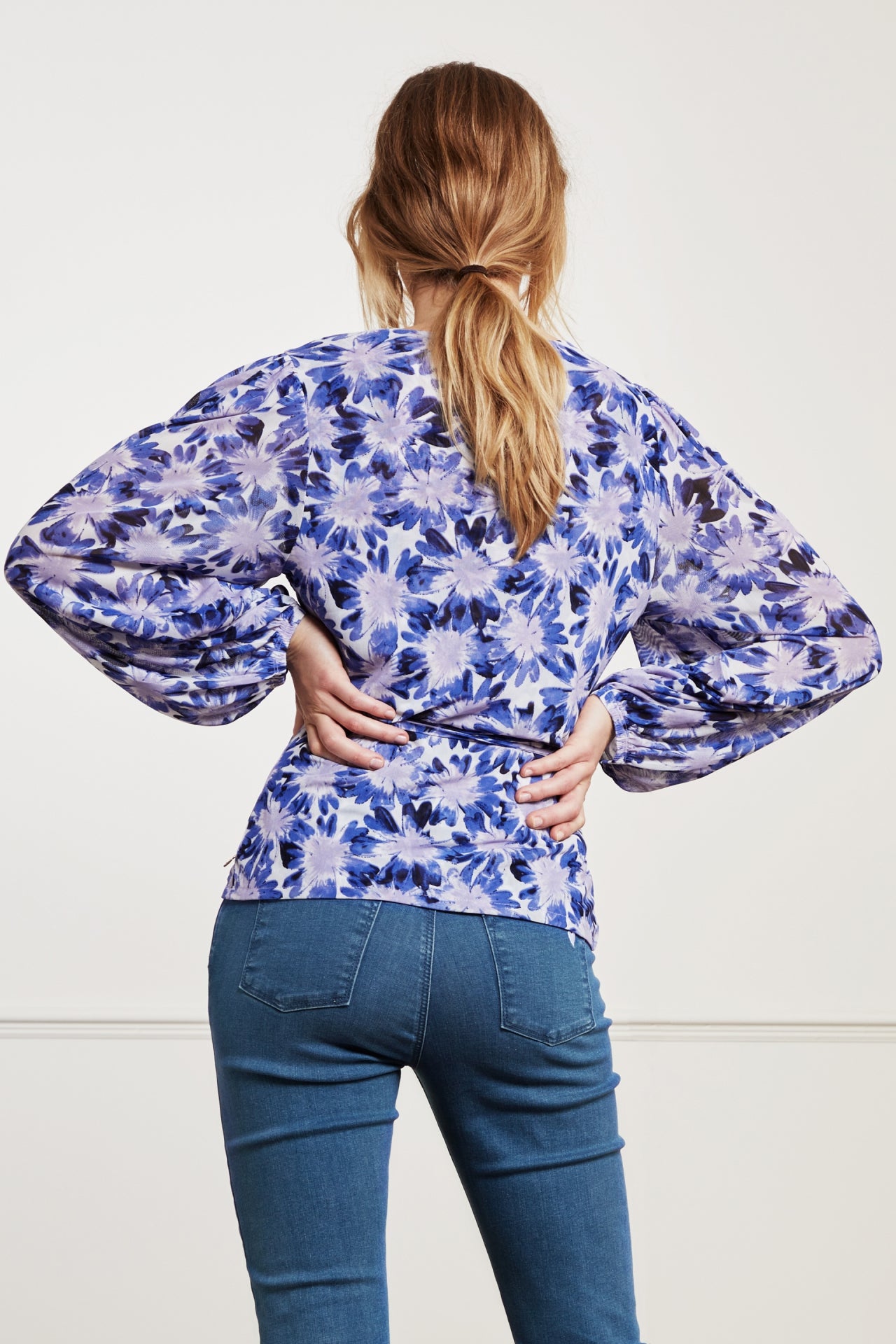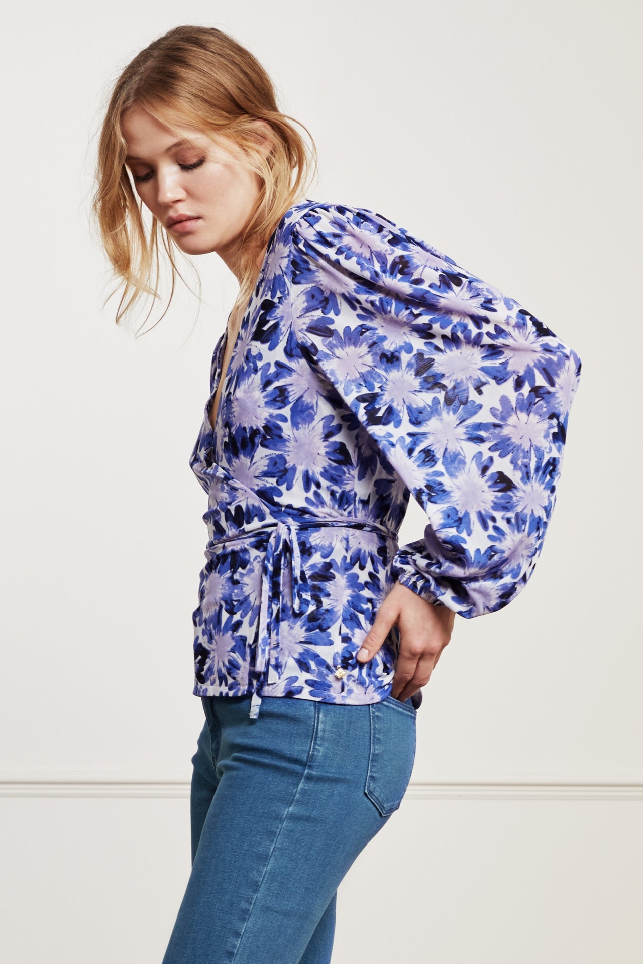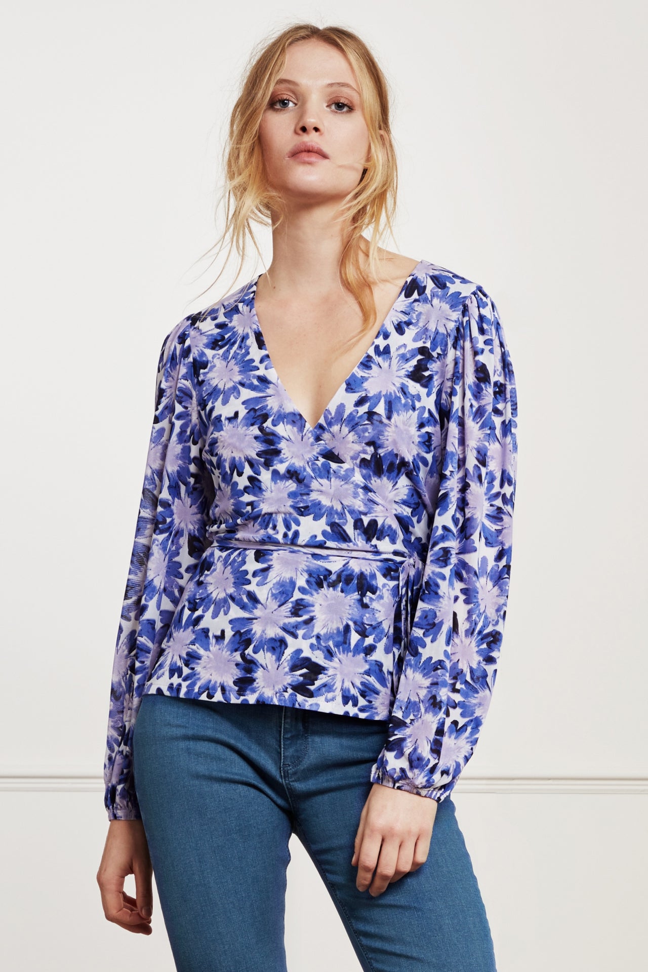 Feminine wrap top with V-neckline. Evi Top has charming wide sleeves with an elastic cuff that allows you to wear it above the elbow. This item is made of recycled Mesh: stretchy, creaseproof and conscious. Discover how many bottles are recycled to make your garment inside the care label.