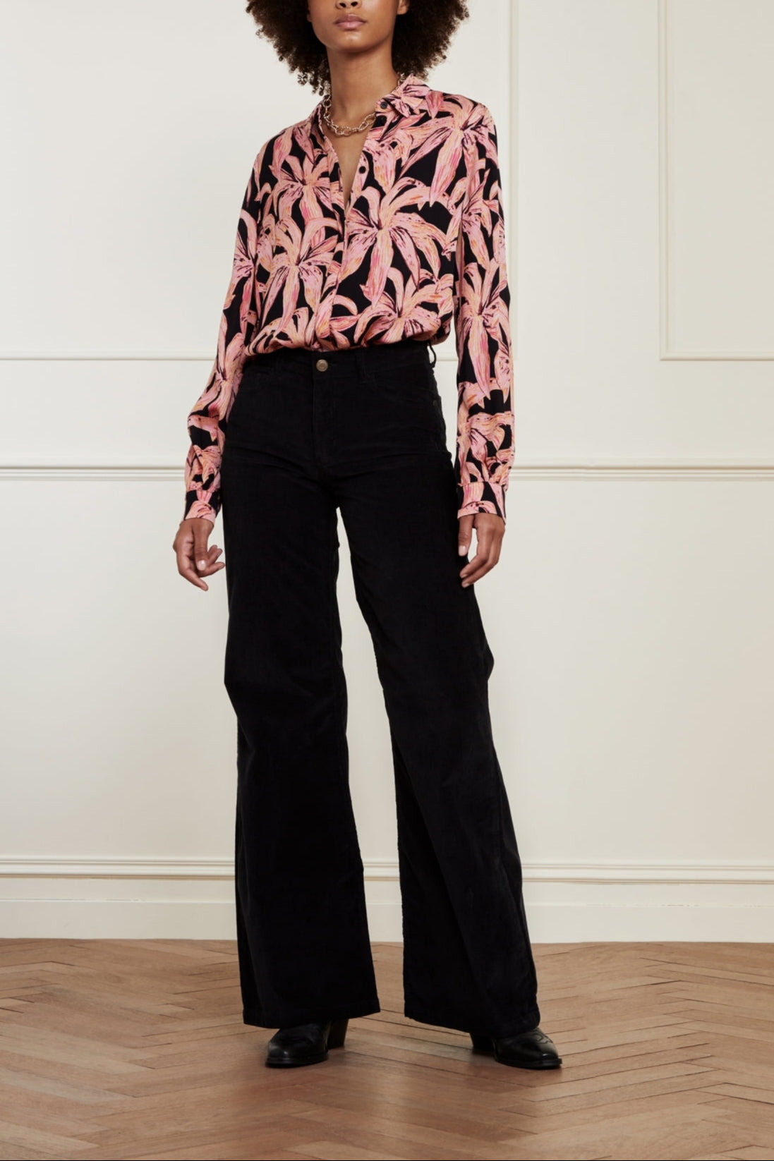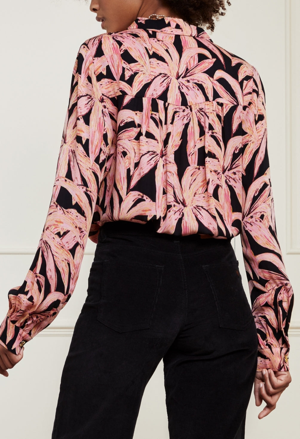 Blouse with classic collar and hidden button closure. Sophia Blouse has a gold-coloured button on the cuffs and a 'La La Leaves' print. -