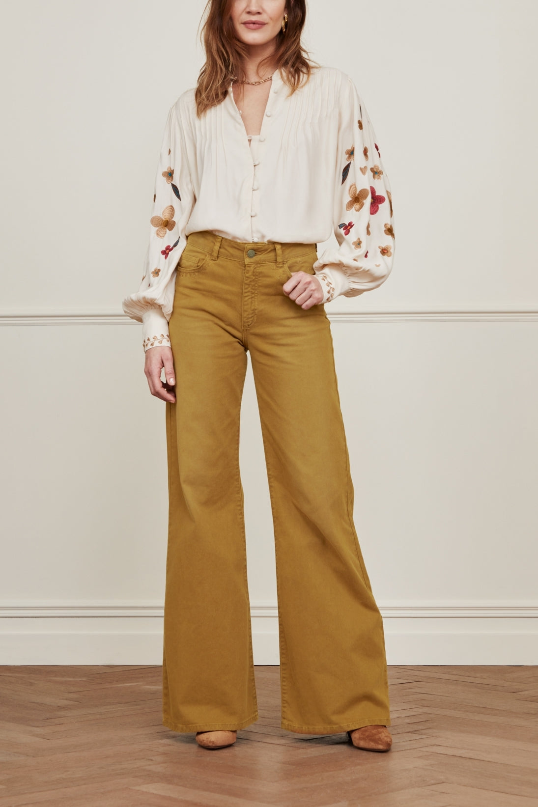 Flowing blouse with hook and button fastening. Heidi Blouse has pleated details on the chest and balloon sleeves with beautiful embroidered flowers.