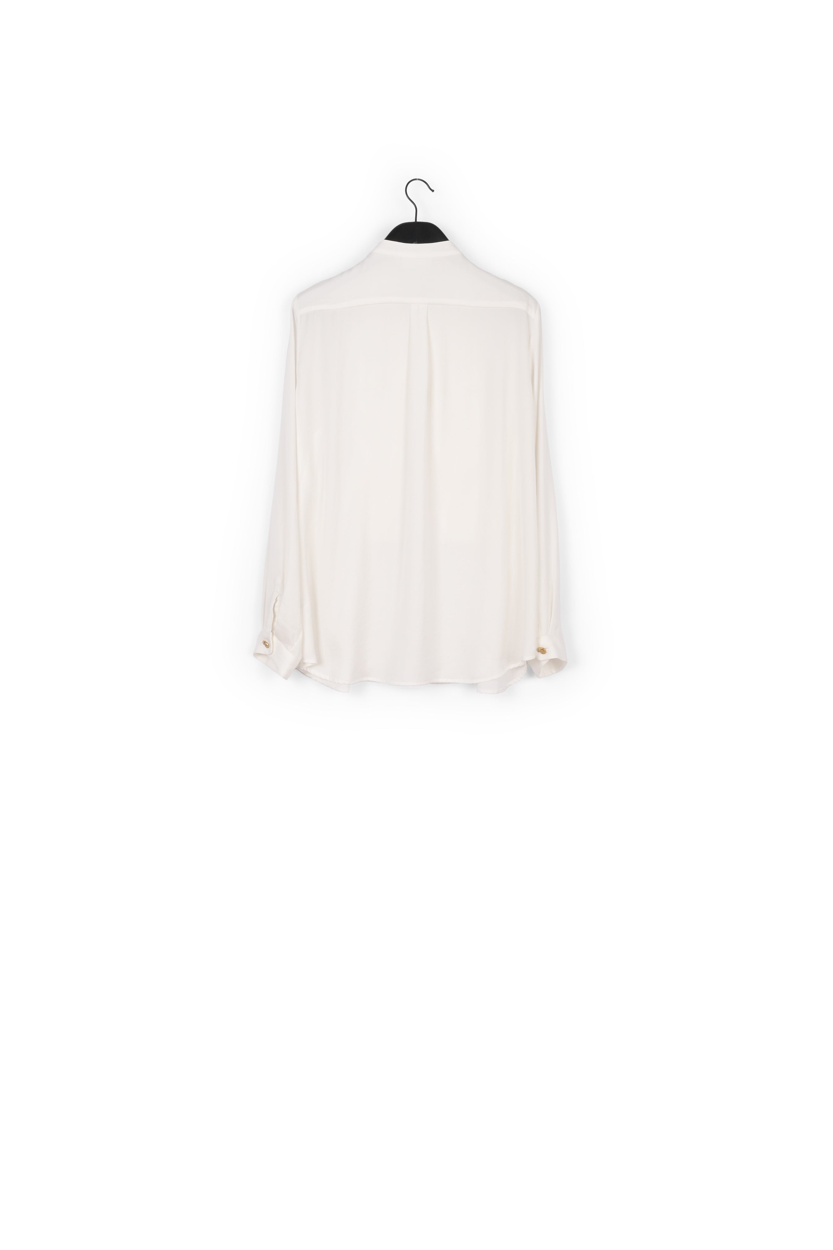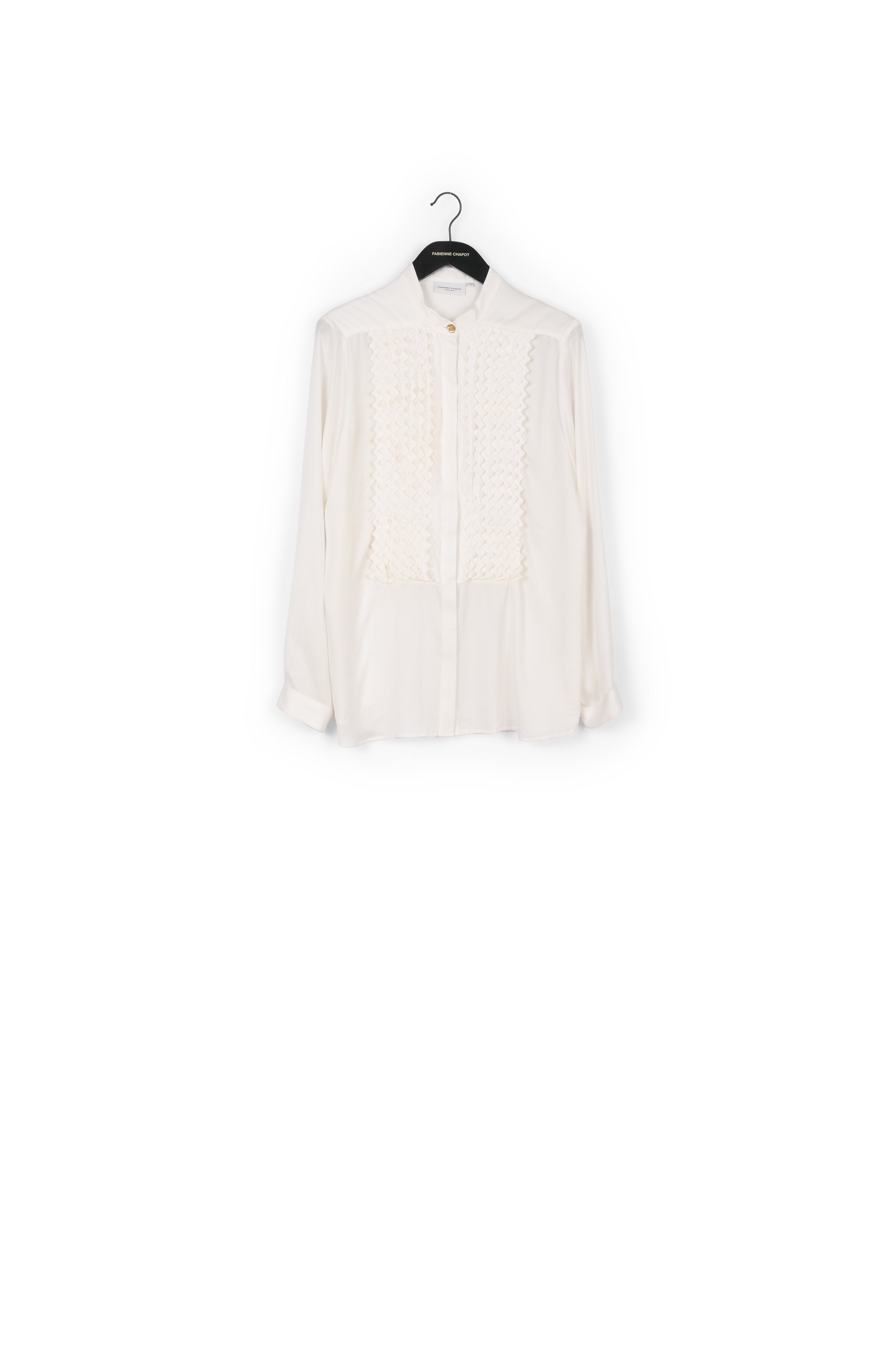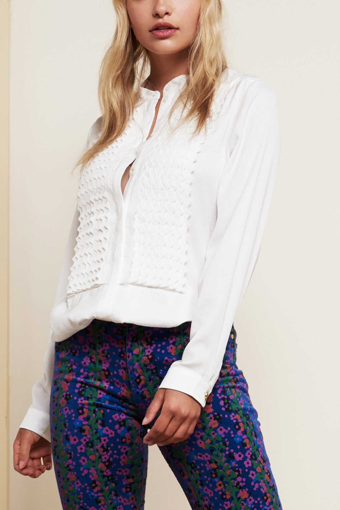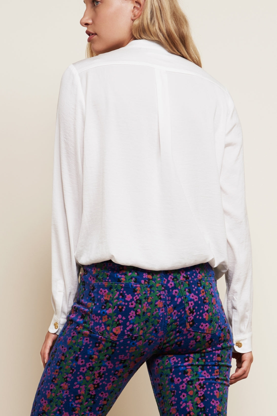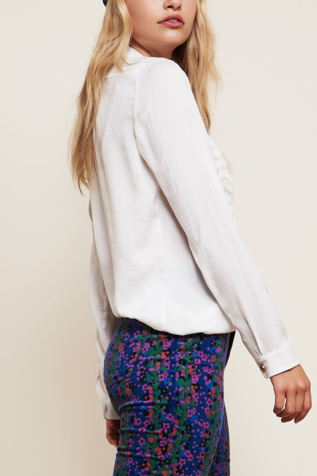 Blouse with Mao collar, ruffle details on the front and gold-coloured button on the cuffs. Sage blouse is made of 30% recycled polyester. -
