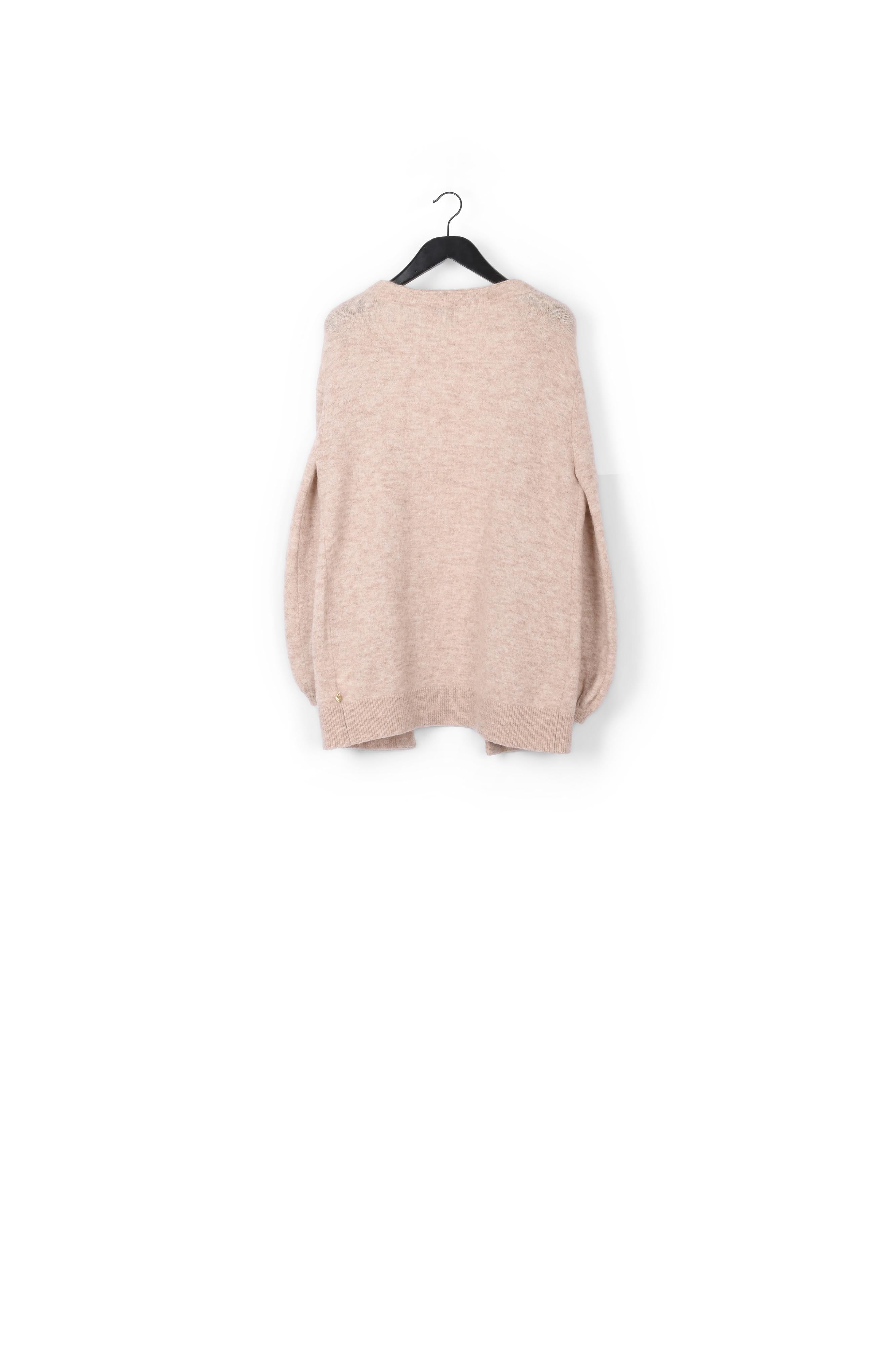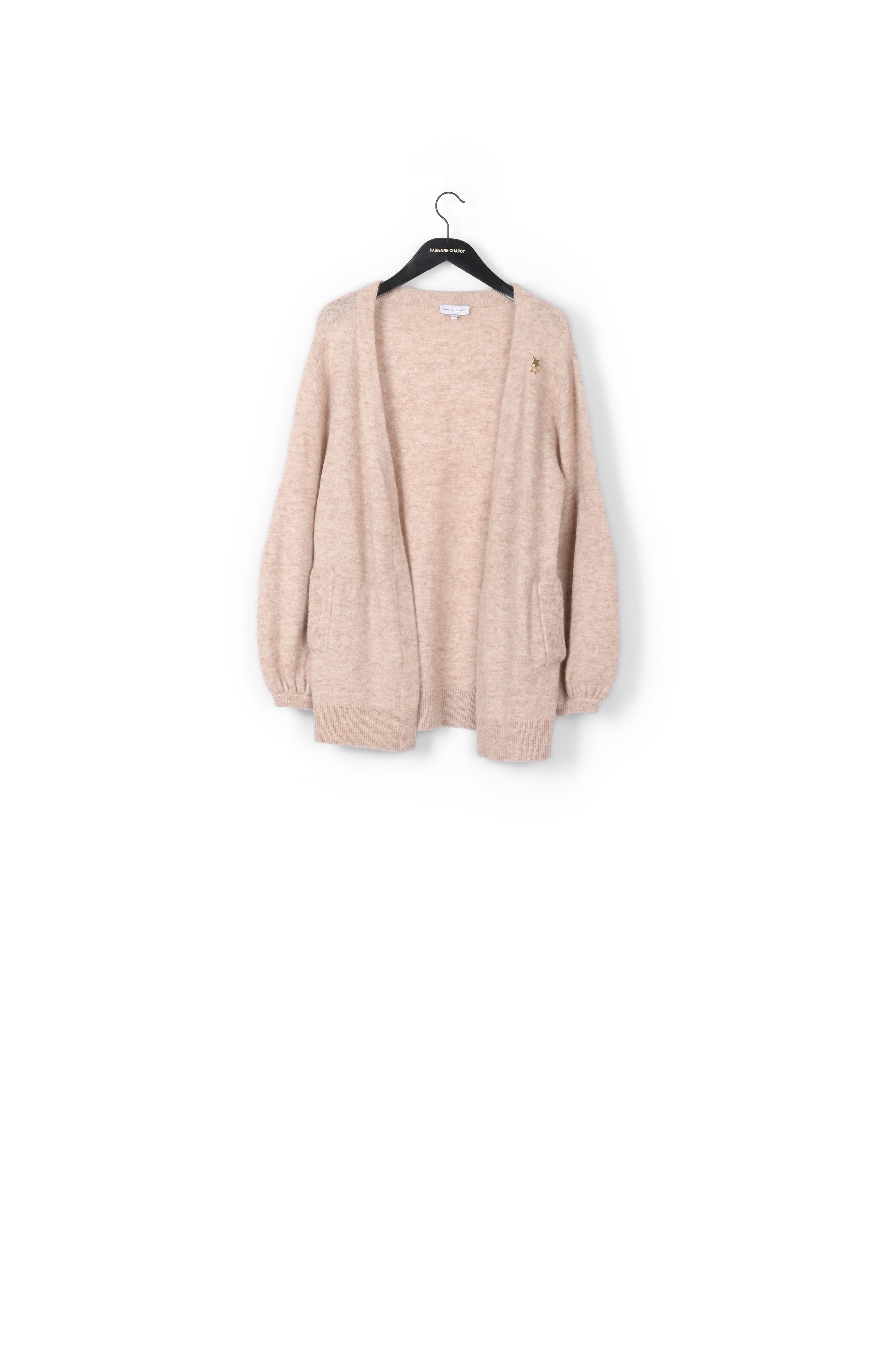 Long knitted cardigan. Kertu Cardigan has puffed sleeves and a detachable brooch on the left side chest. -