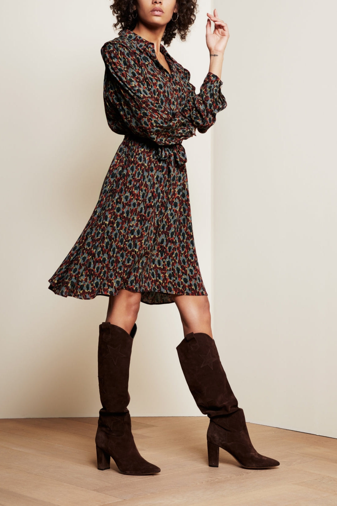 Flowing above the knee dress with classic collar, tie belt and an elastic waistband. Country Dress has a beautiful pleated detail on the shoulders and a button closure to the waist. -