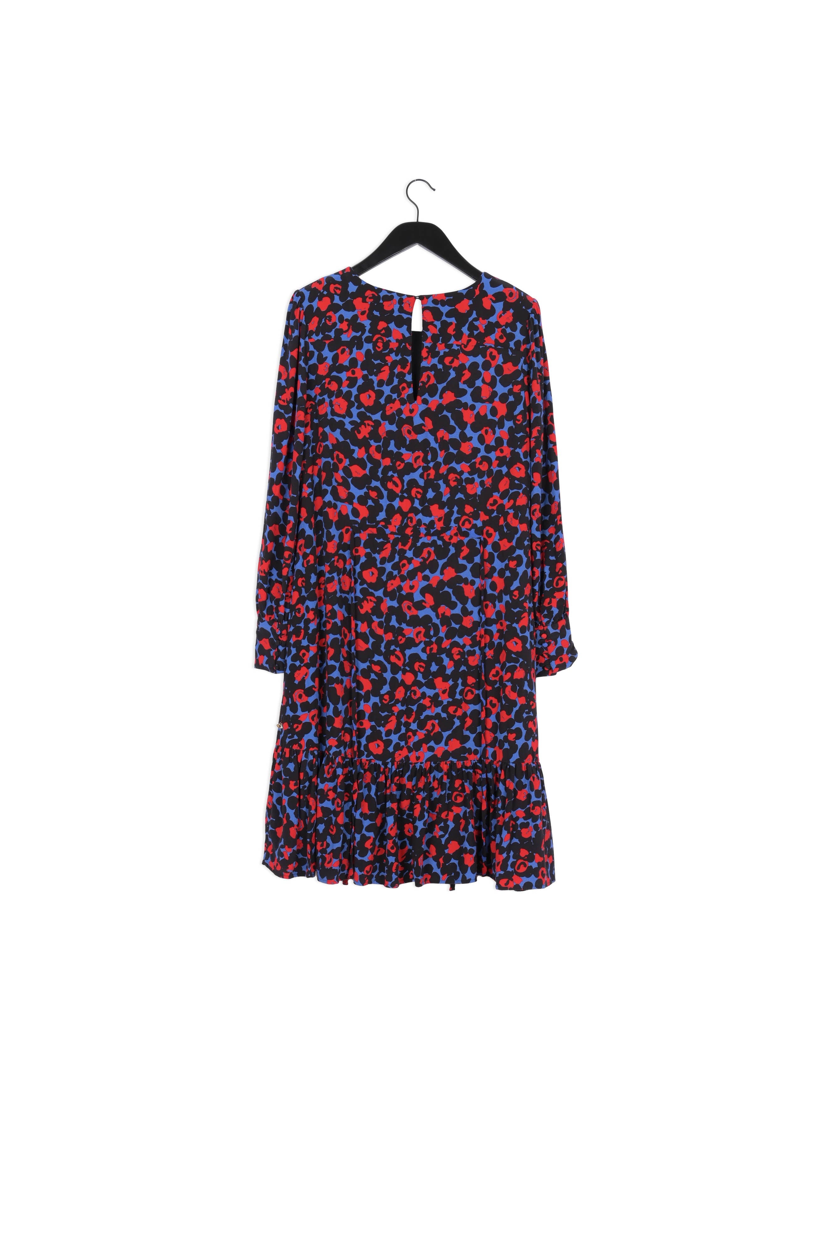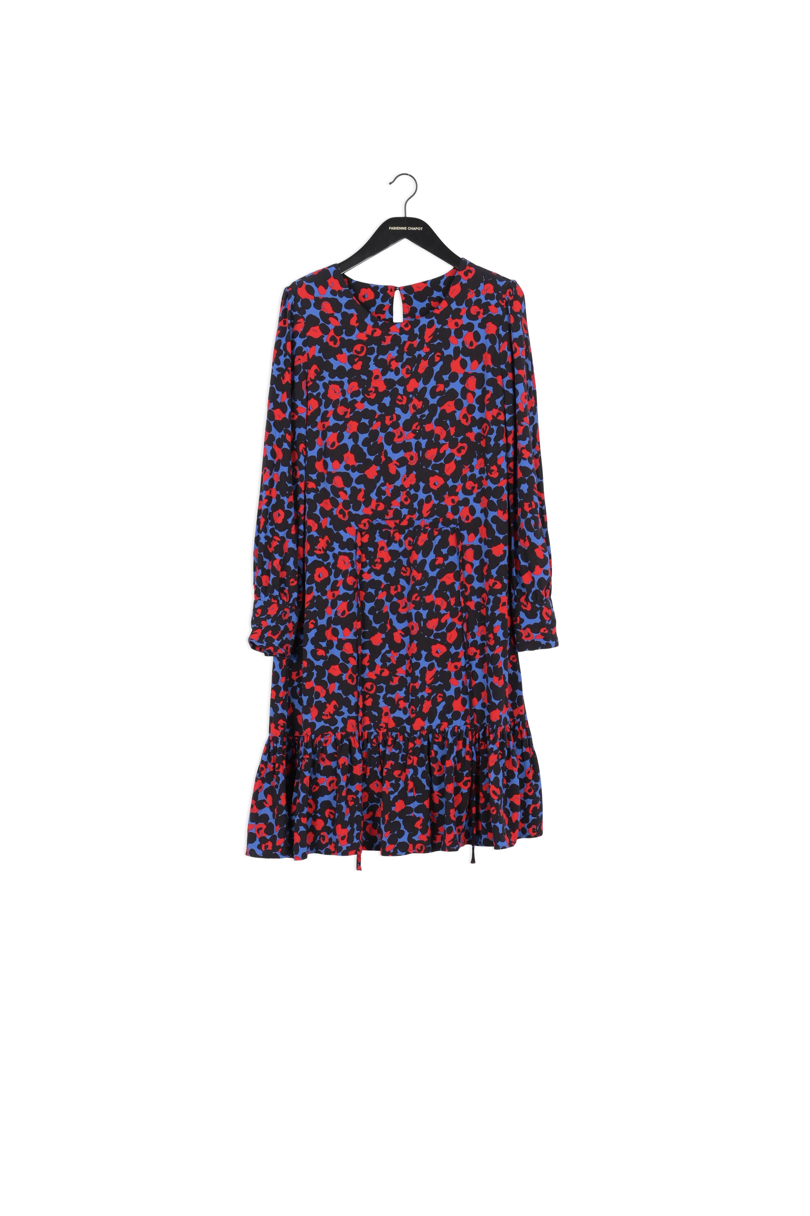 Midi-length flowing dress with high, round neck, long sleeves and ruche details at the bottom. The Bonnie Dress has a tie belt around the waist.
