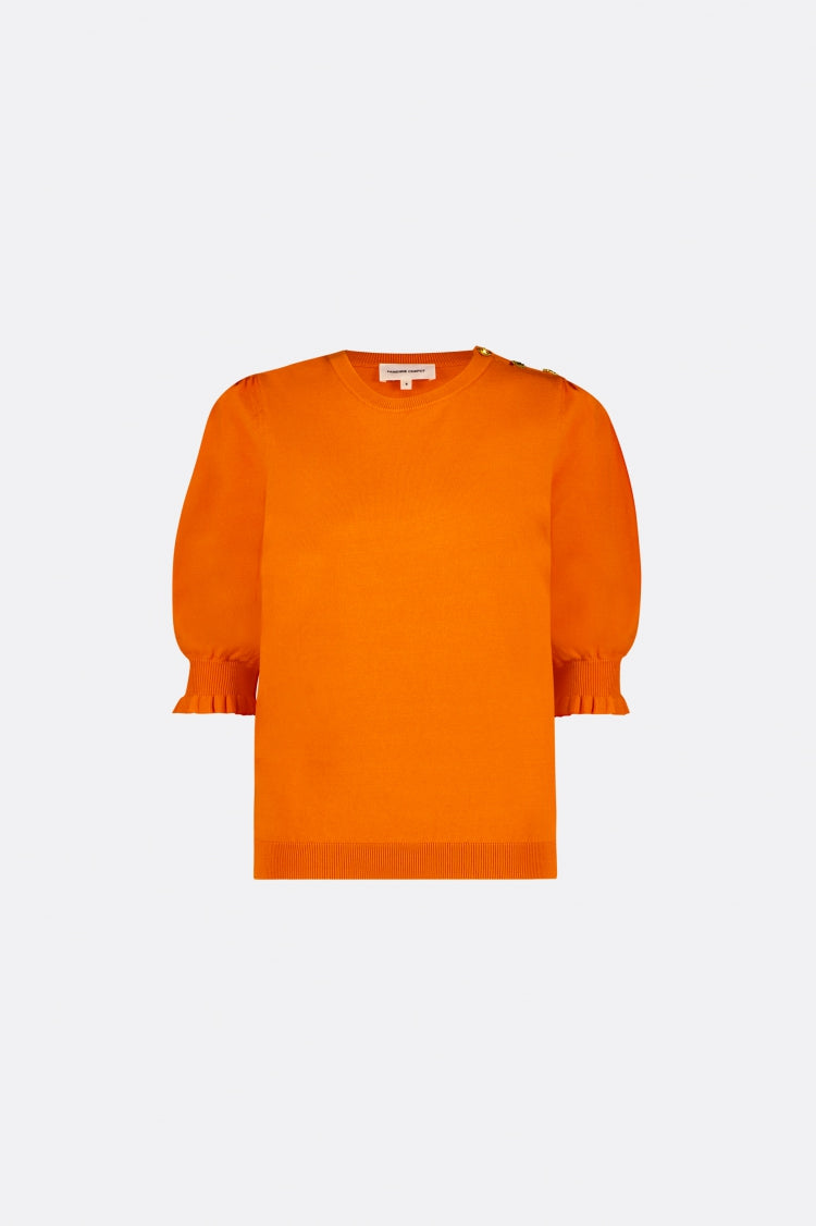 Fine- knit sweater with round neckline and three-quarter sleeves with ruffles. Jolly Pullover has three signature Fabienne Chapot buttons on the left shoulder. -