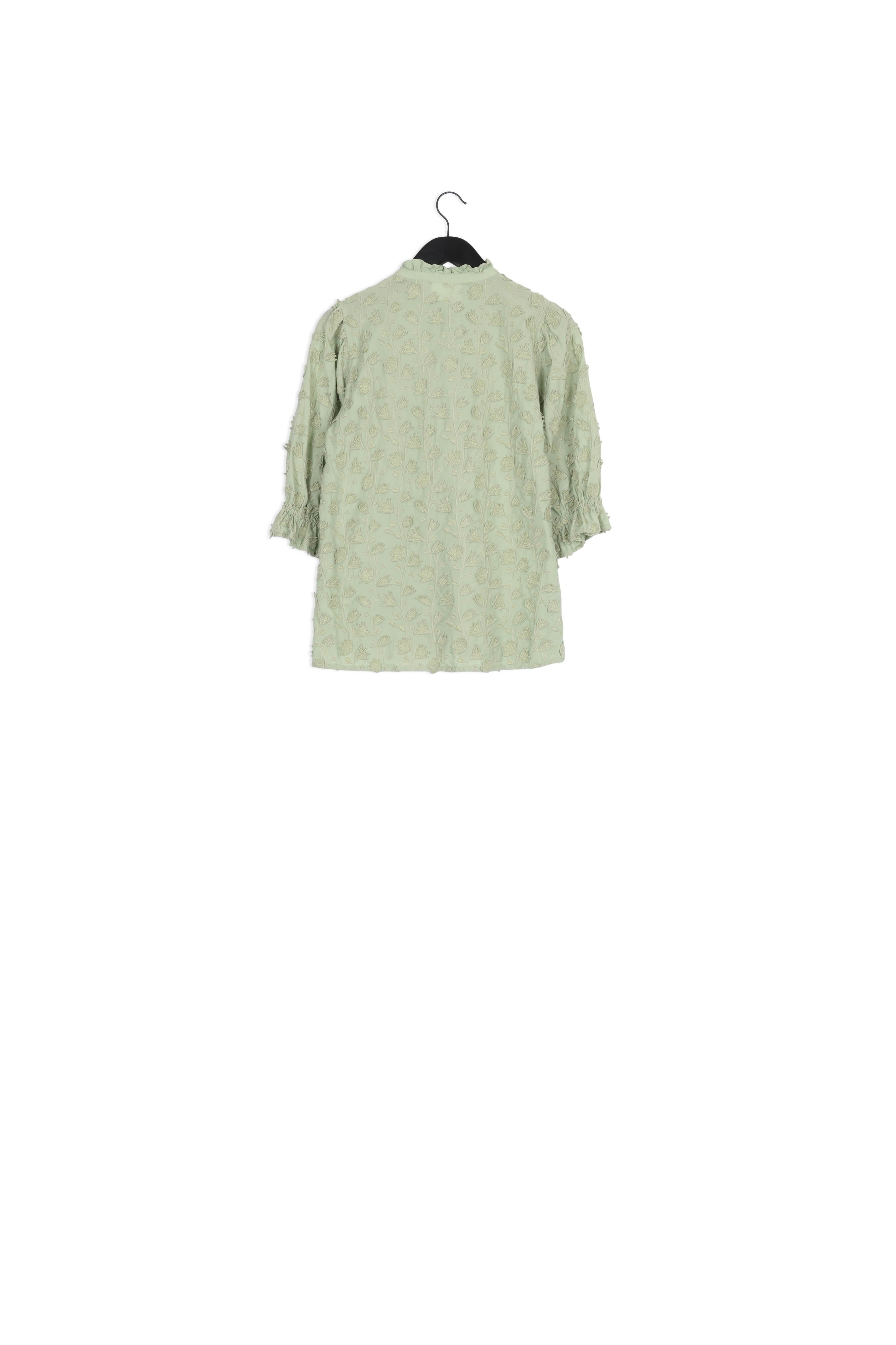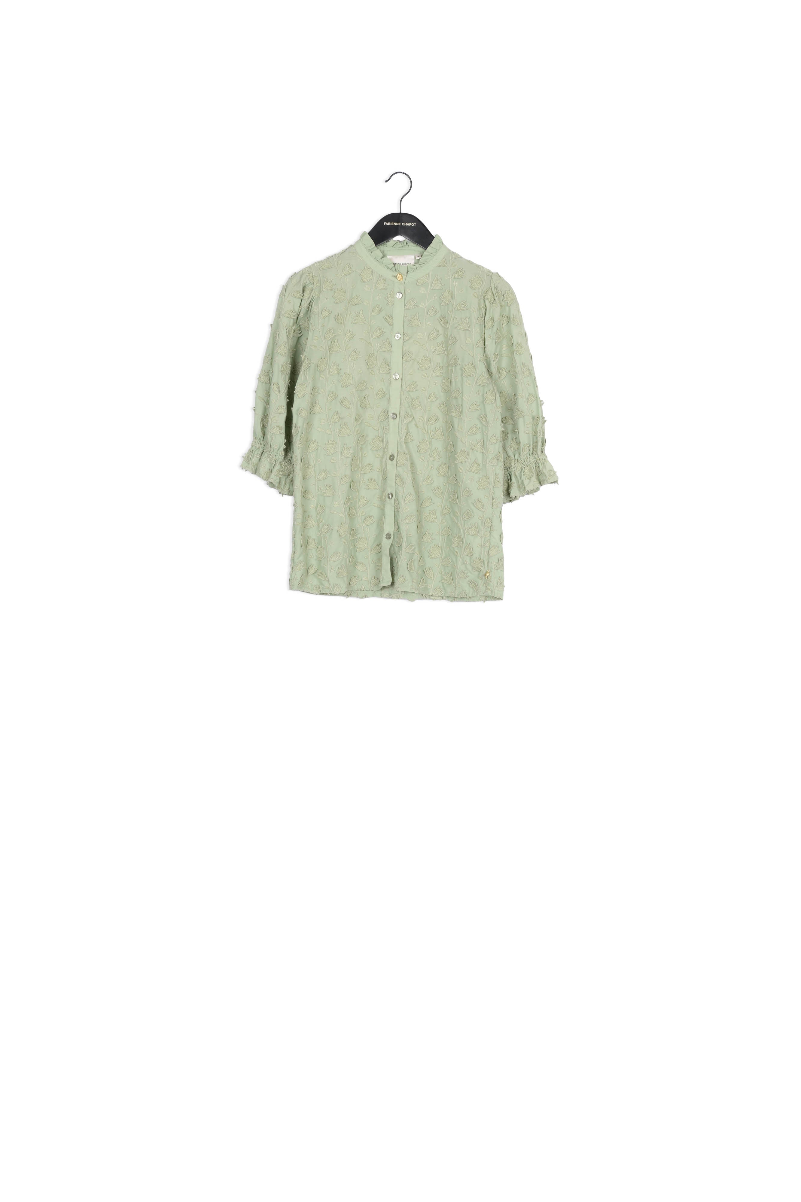 Blouse with short puff sleeves and a golden button and ruffle details on the collar. The Meggie Short Sleeve Blouse has openwork details, elastic at the ends of the sleeves and a beautiful allover embroidered print. -