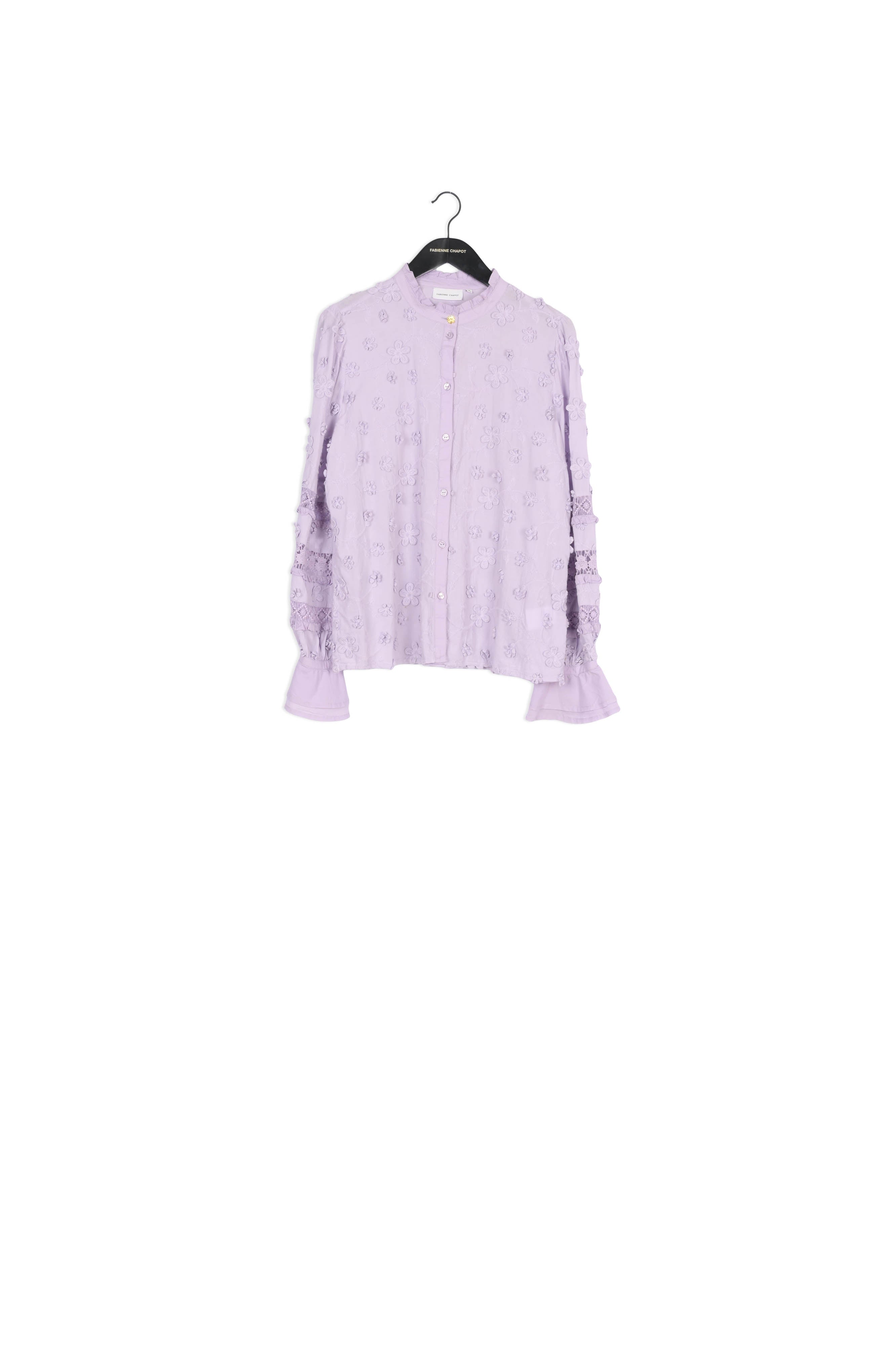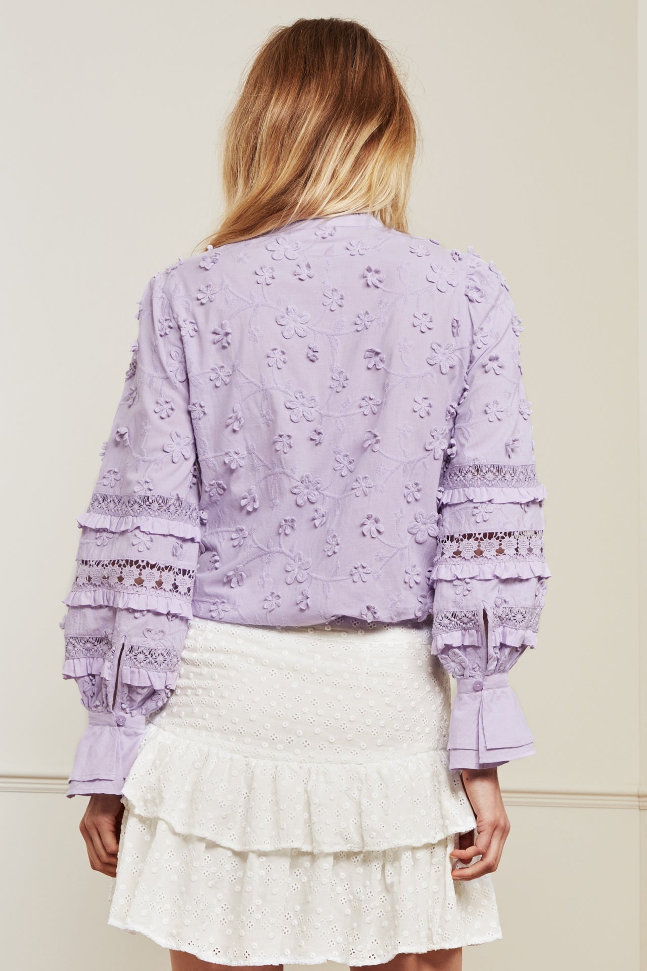 Blouse with ruffle and lace details. Leo Blouse is made of a beautiful fabric. It is a 3D translation of our unique prints in a beautiful embroidery technique, making the flowers seem to grow out of the fabric. -