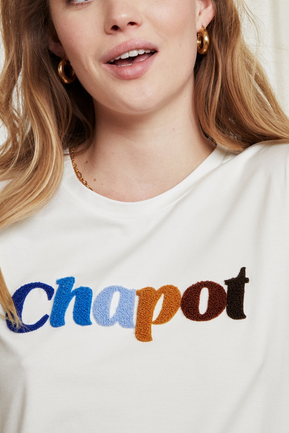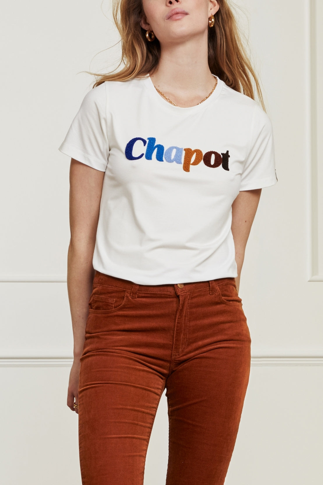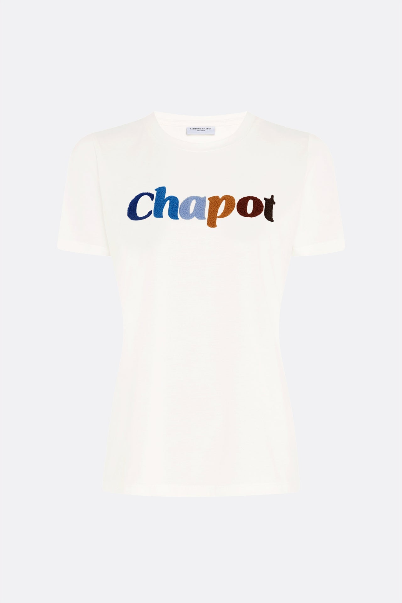 Cotton T-shirt with a round neck and short sleeves. Terry T-shirt has a 'Chapot' terry cloth print.
