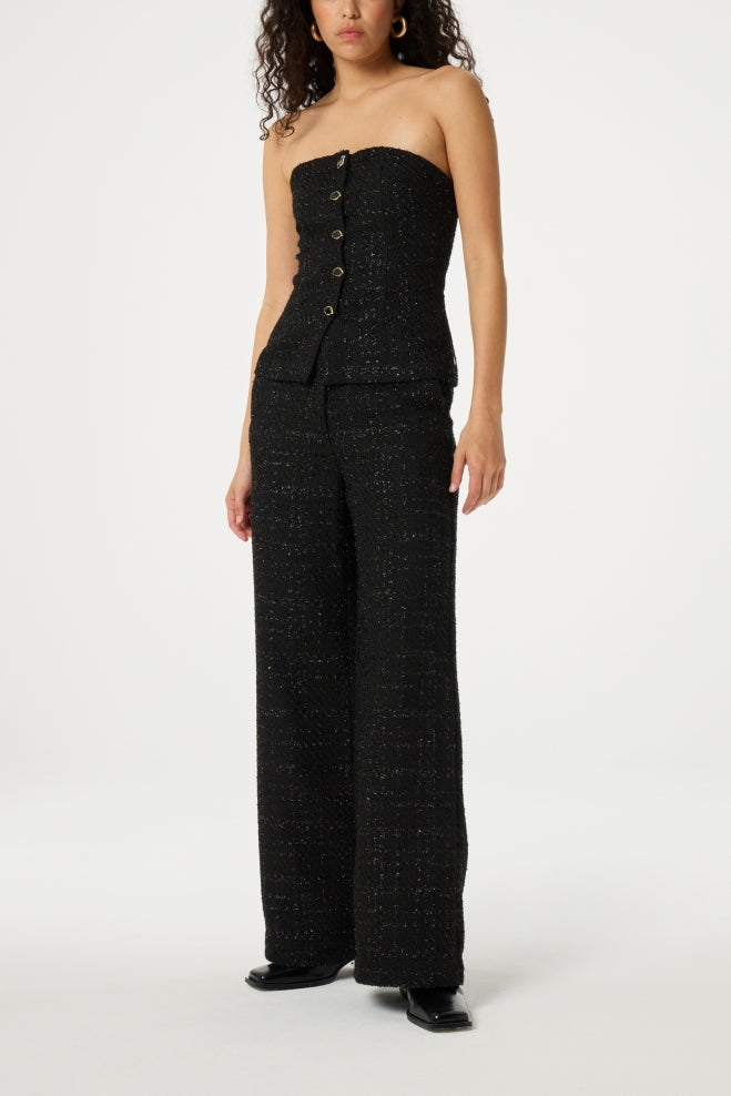 This strapless women's top in black features a slim fit with elegant buttons on the front, the perfect choice for evening occasions. Crafted from 100% recycled polyester making it a more responible choice. Pair it with the matching Remi Tweed Trousers for a sleek and sophisticated look.
