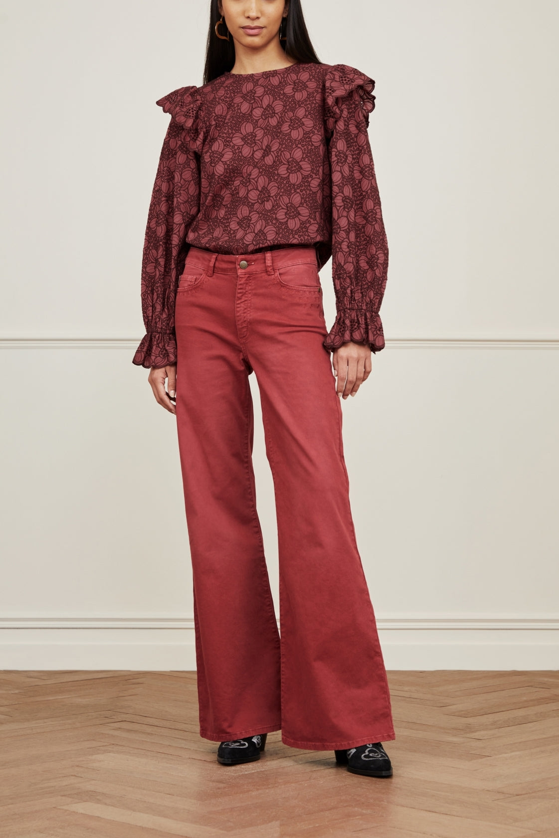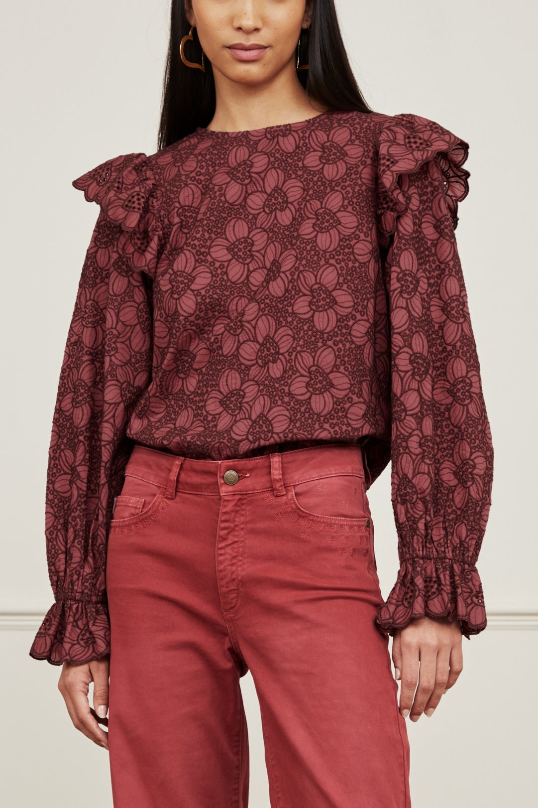 Top with beautiful embroidery print. Kasja Top has raised shoulders and lace cuffs with elastic.