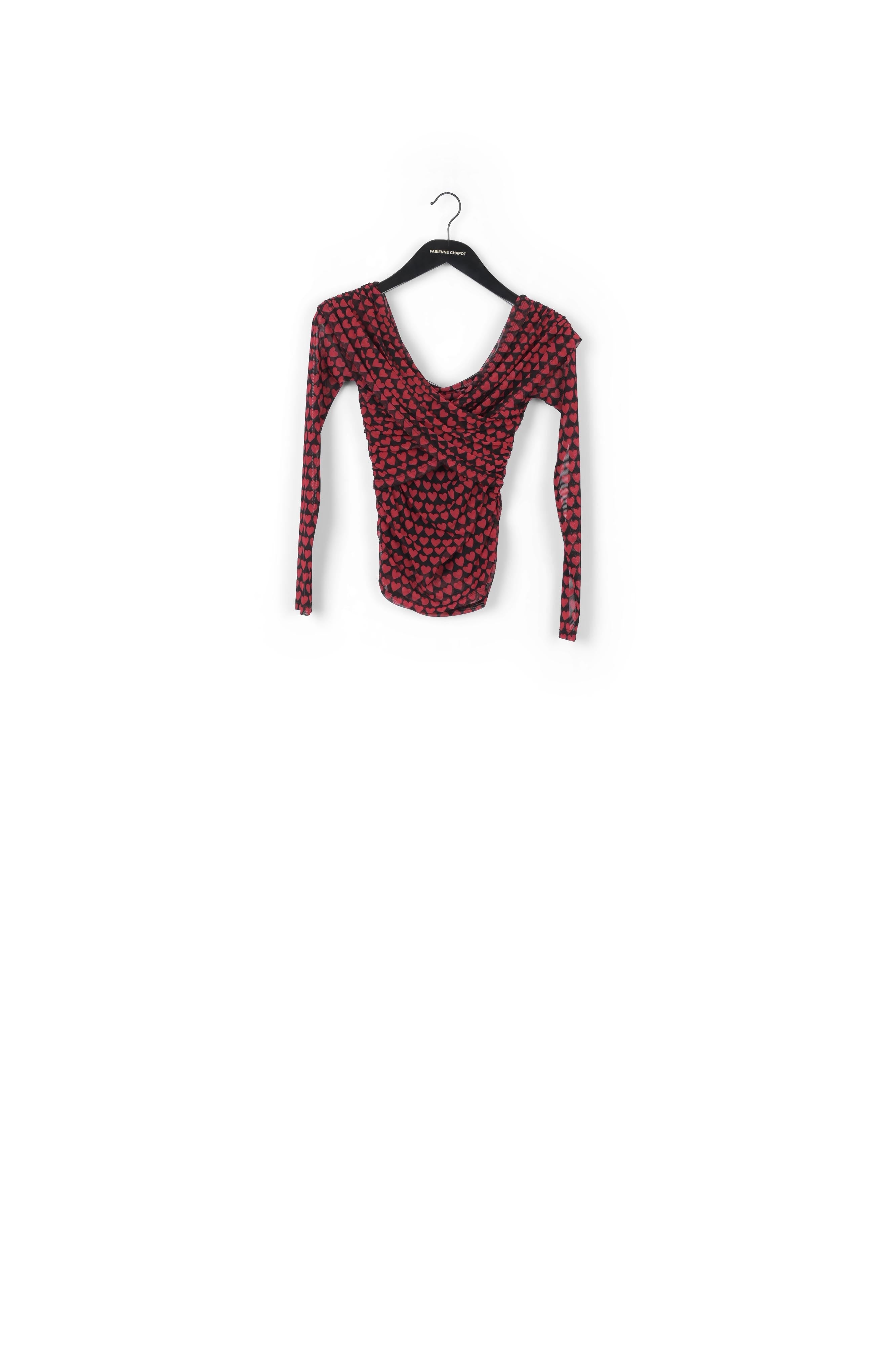This women's off-shoulder top with long sleeves featuring a slim fit and has small red hearts all over. Pair it with the Puck Trouser to match the heart print and coordinate the look.