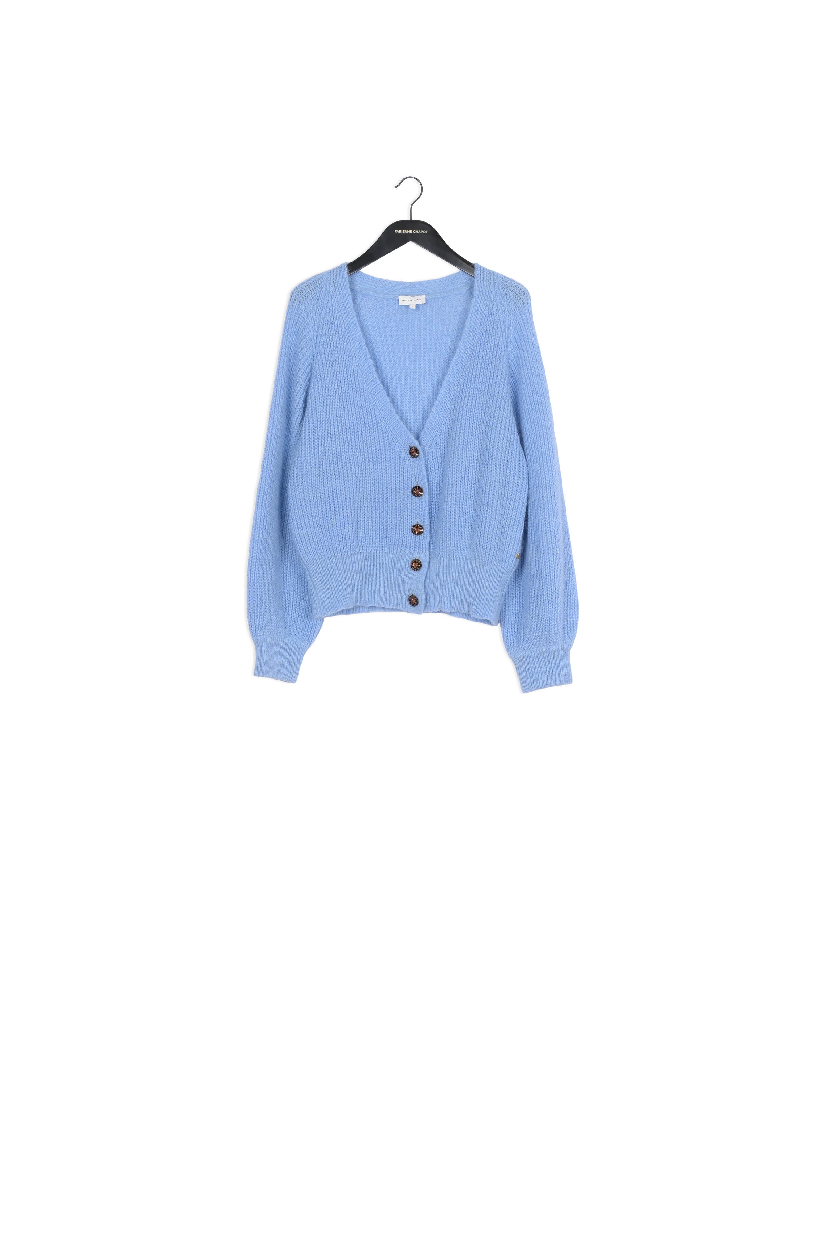 Knitted cardigan with V neck and button closure. Starry Cardigan has fancy bronze buttons with a shiny layer.