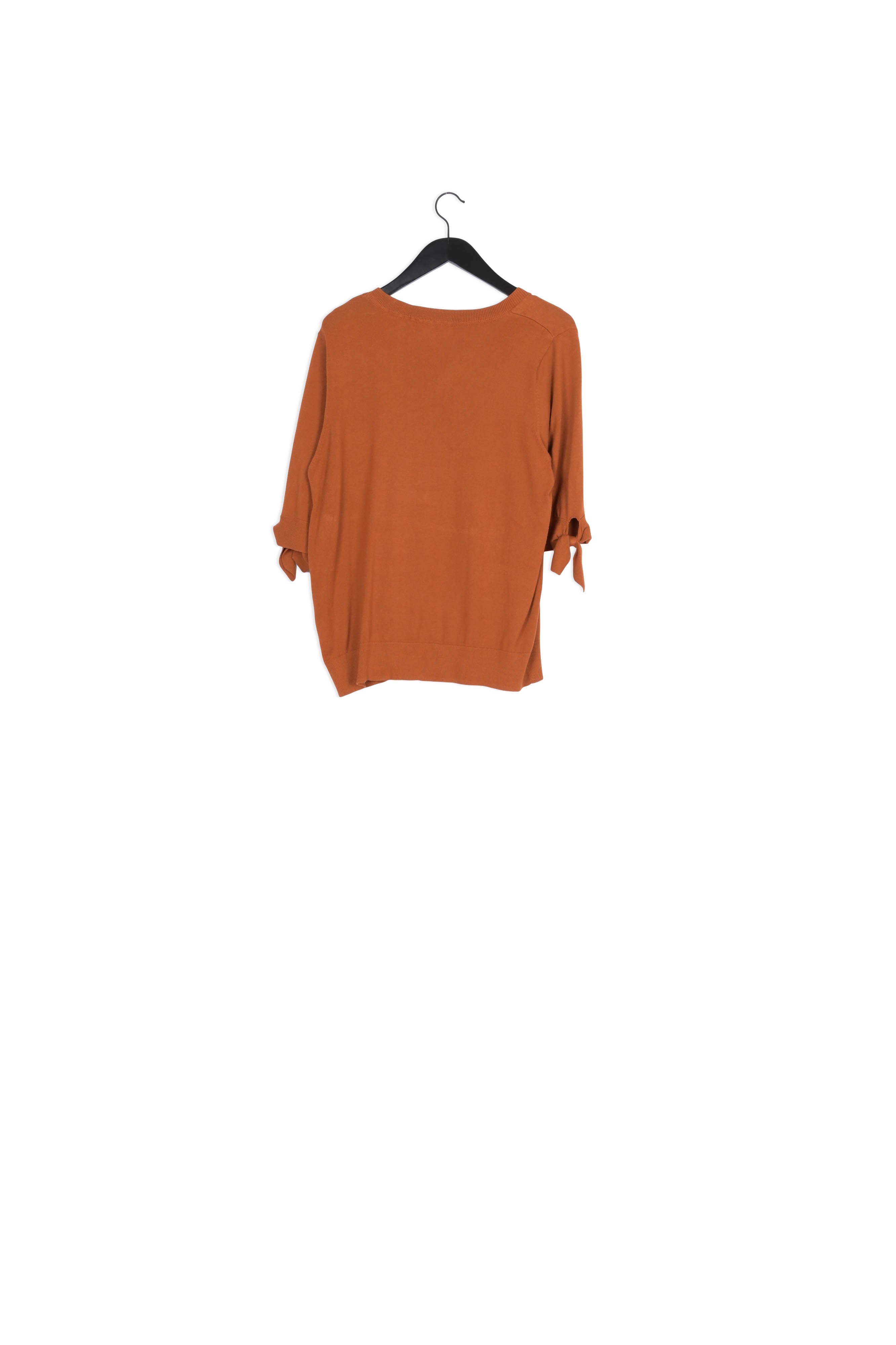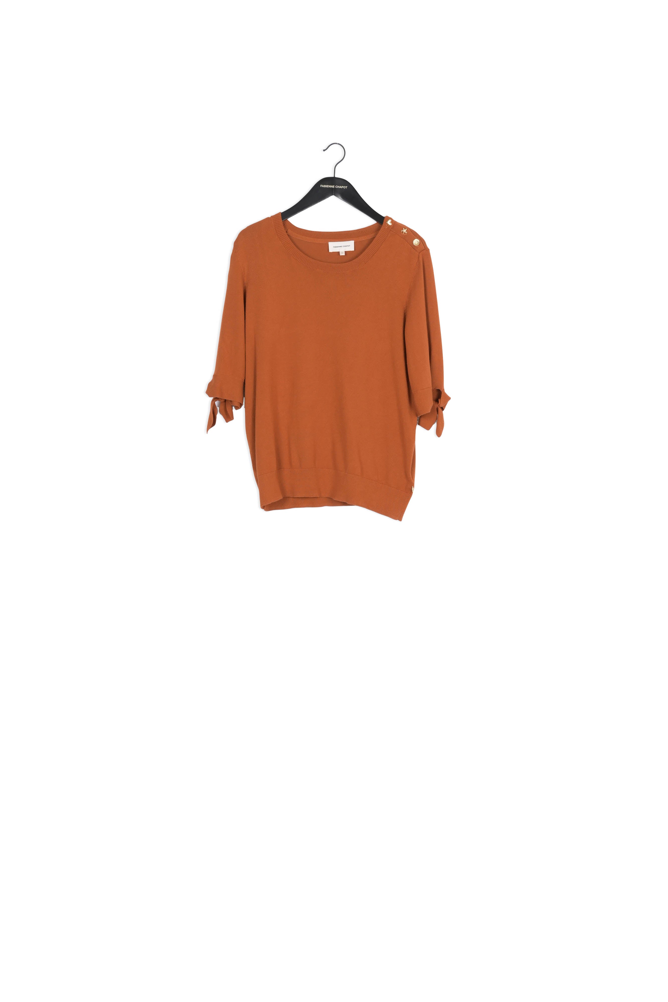 Fine-knit pullover with a high, round neckline and short sleeves. Molly Short Sleeve Pullover has gold-coloured buttons on the left shoulder and a bow detail on the sleeves. -