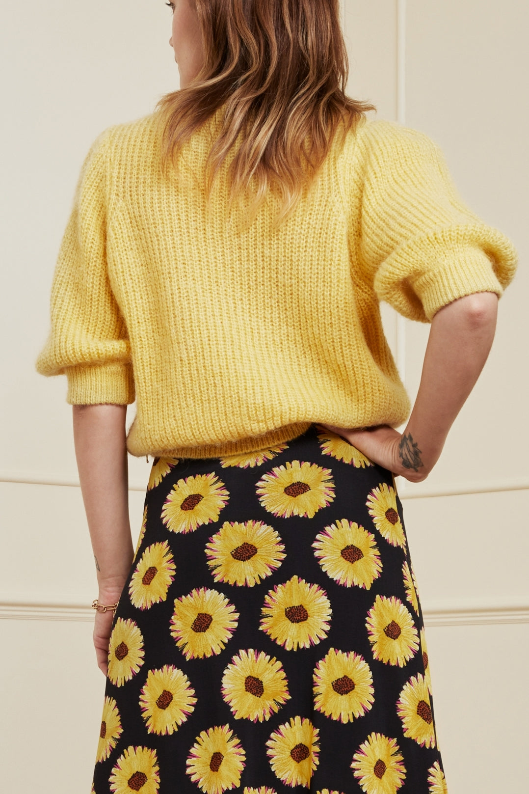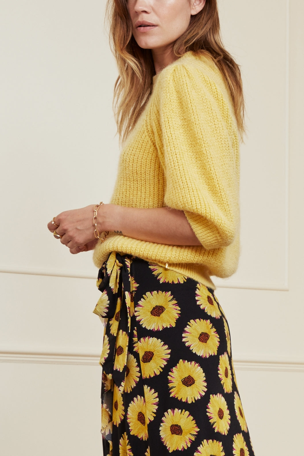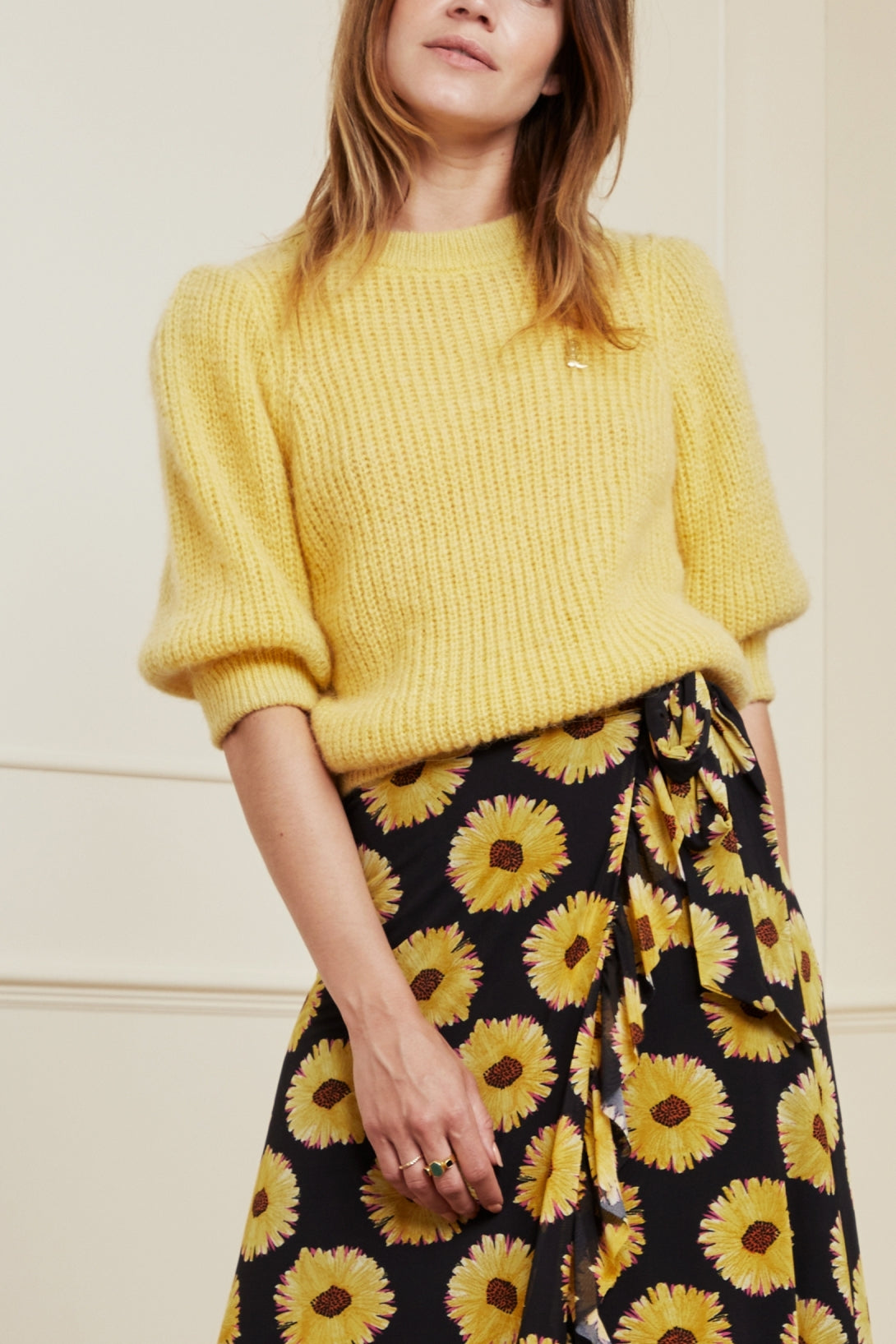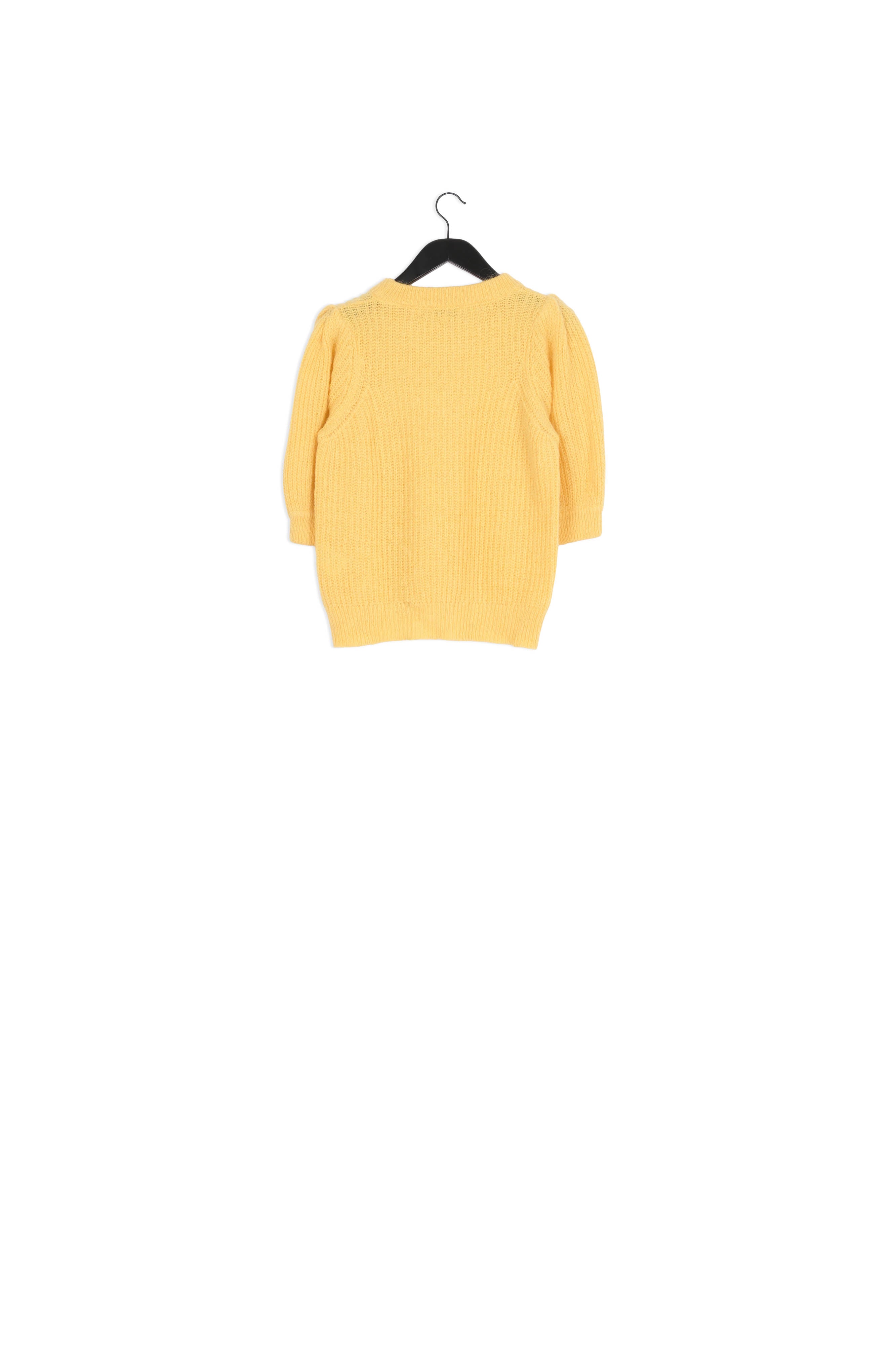 Soft knitted pullover with round neck. Jet Pullover has slightly puffed short sleeves and a gold-coloured brooch. This pullover is made from an alpaca wool blend.