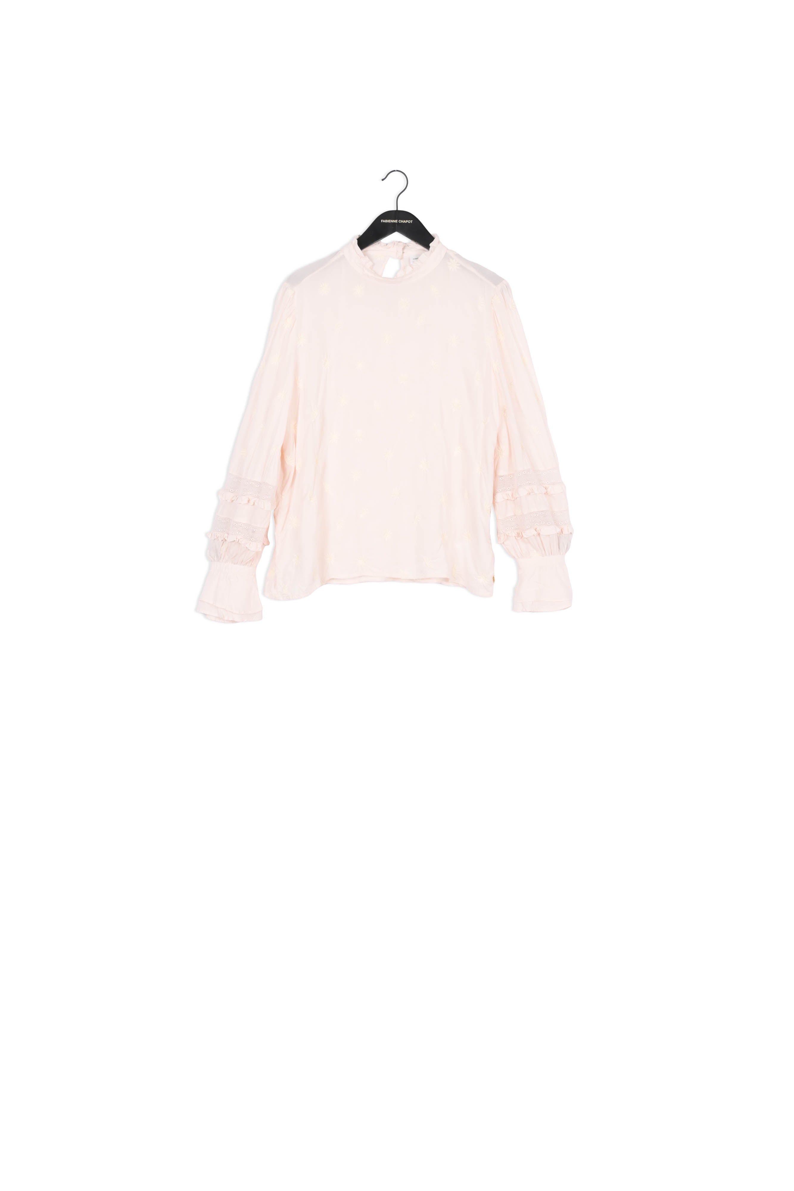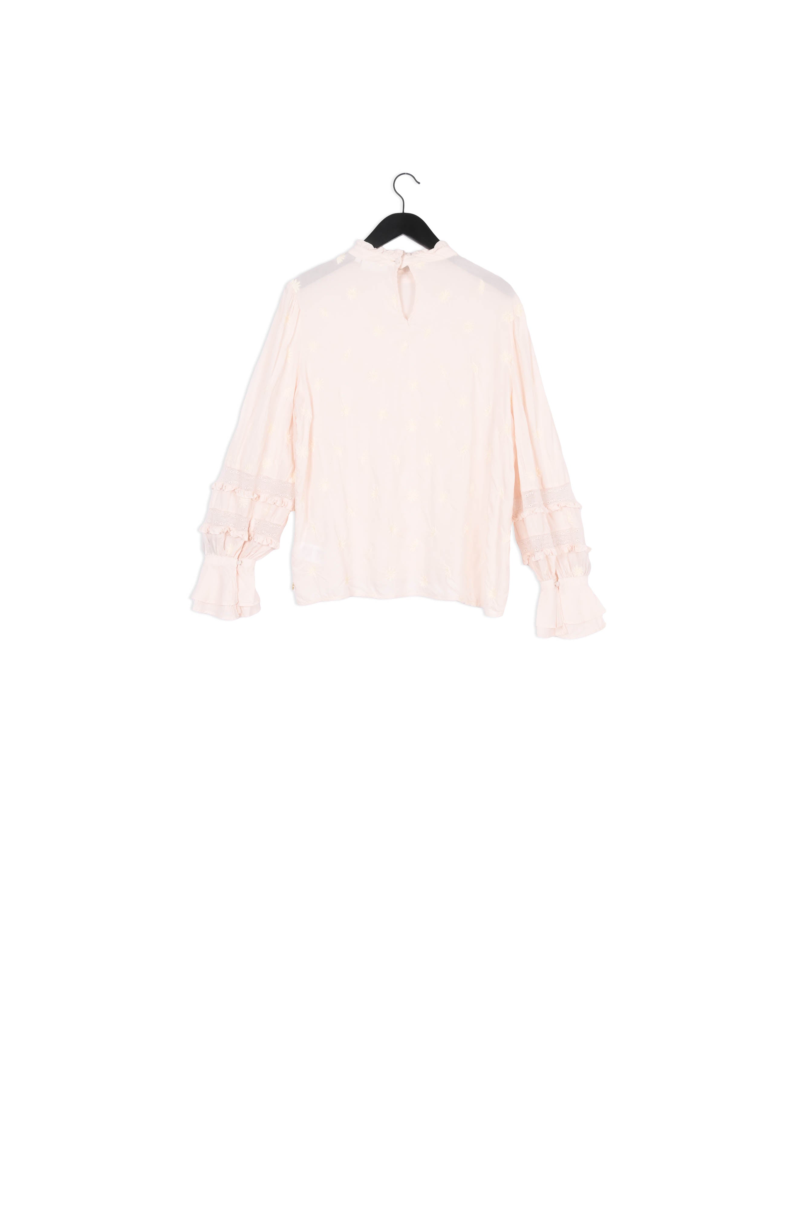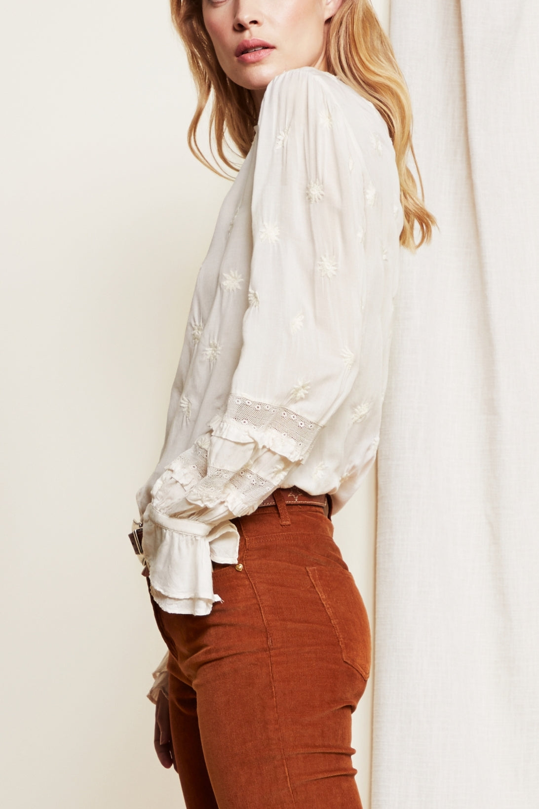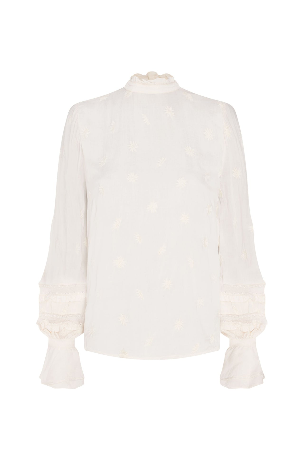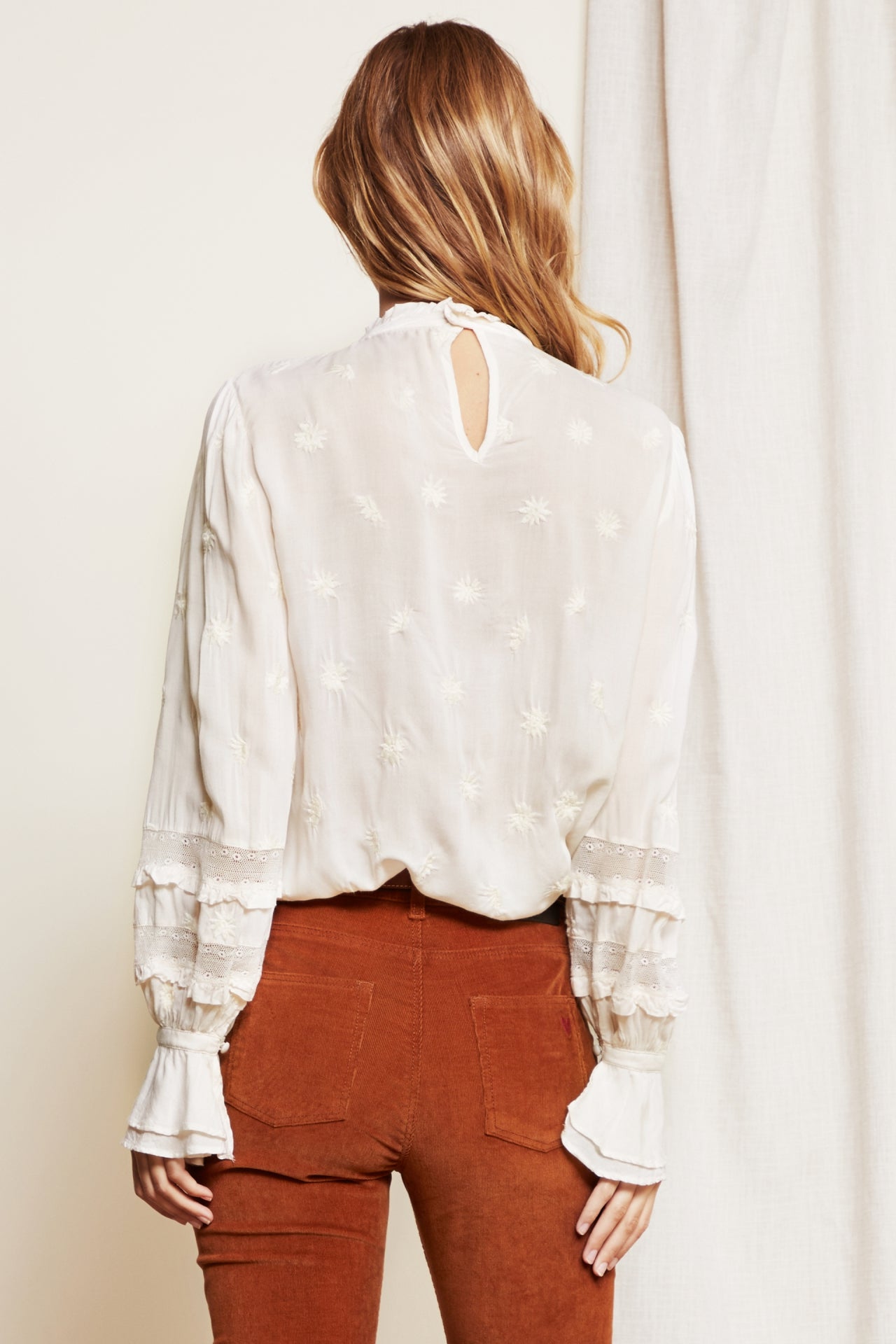 Blouse with high-closed collar, embroidered print. Leo Top has lace and ruffle details on the sleeves.