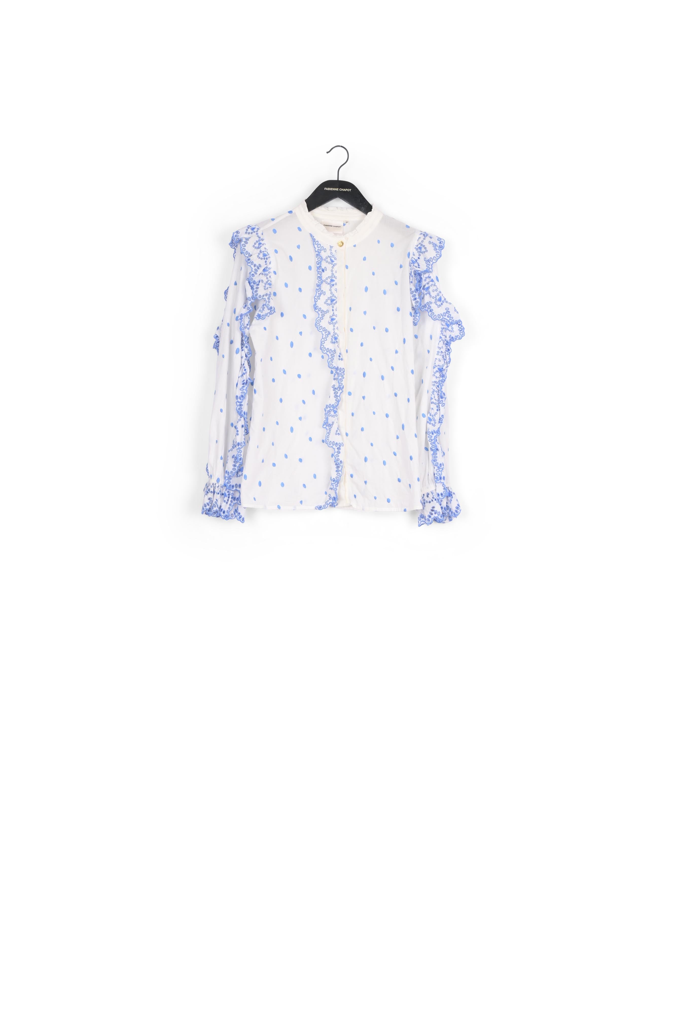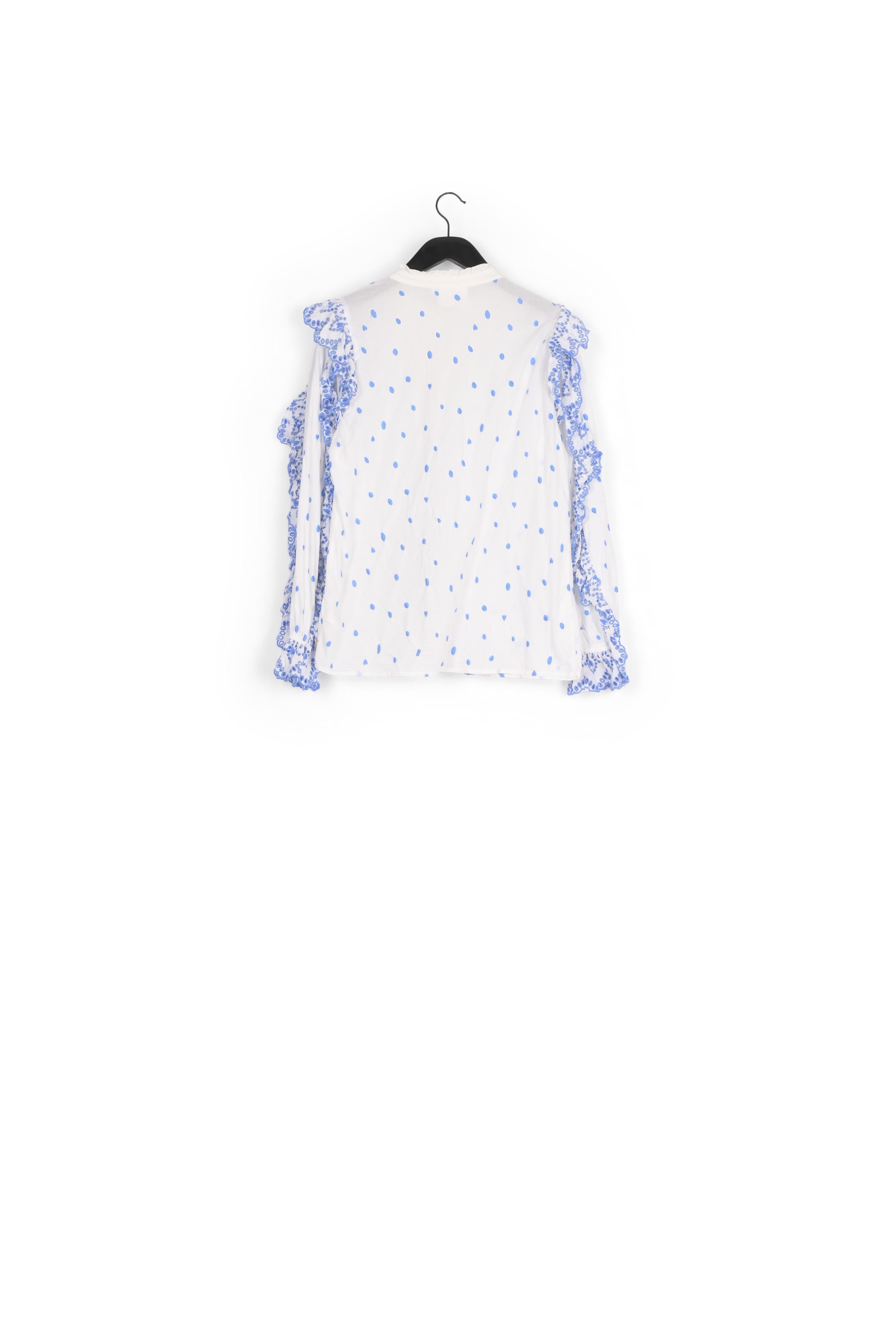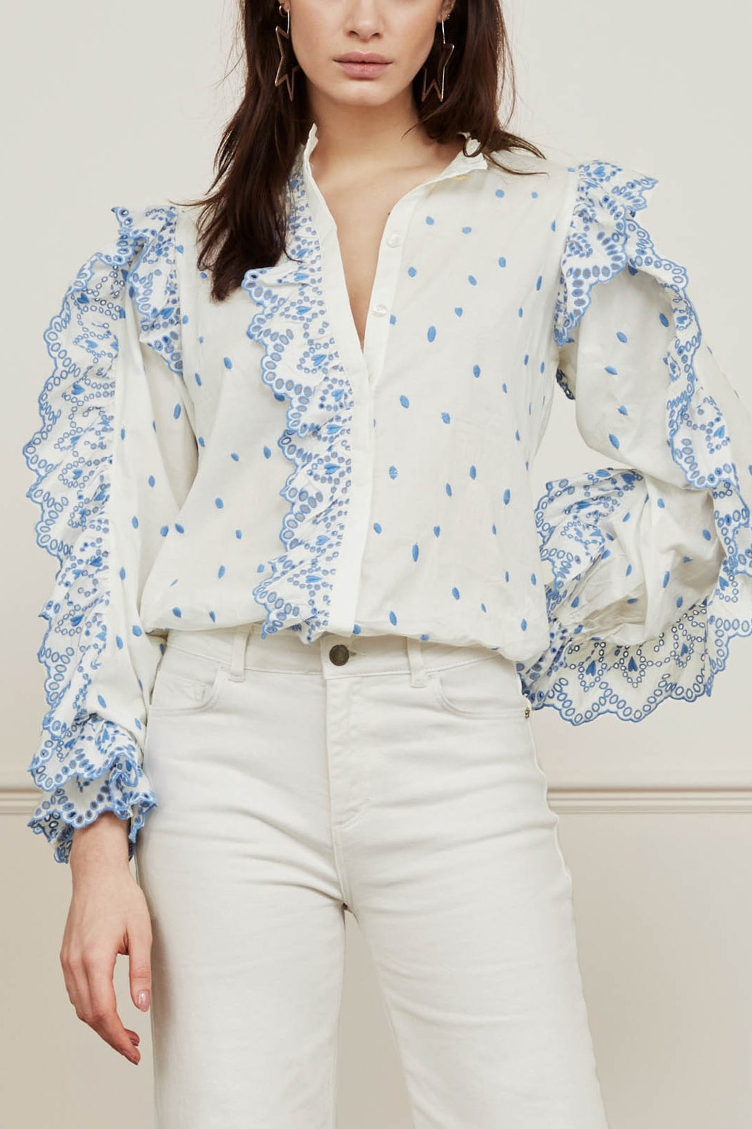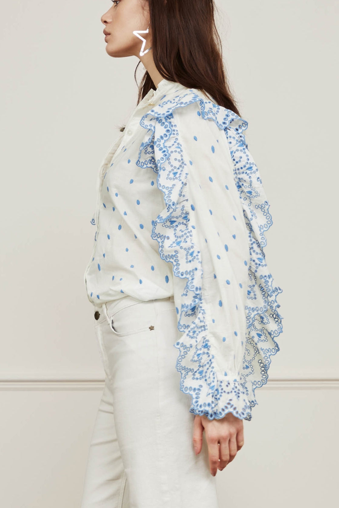 Blouse with long, voluminous sleeves, openwork details and beautiful ruffles on the sleeves. Josie Blouse has a gold button on the hem and elastic at the cuffs.