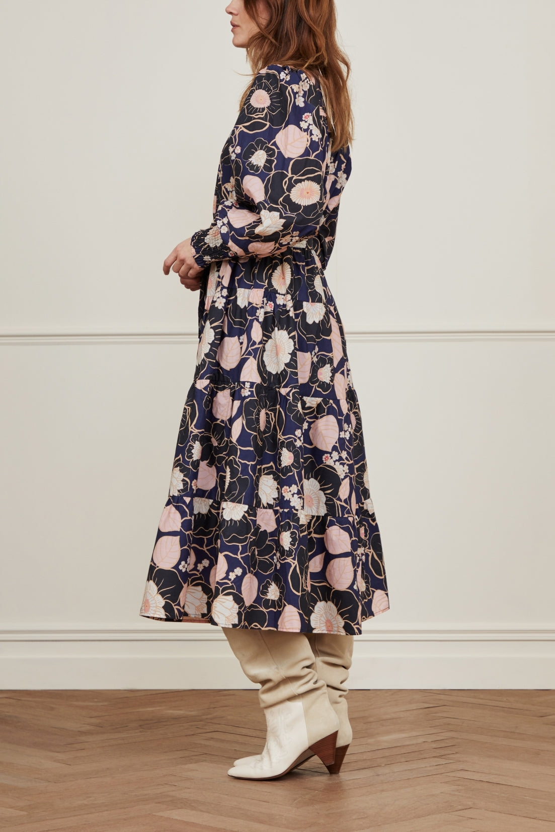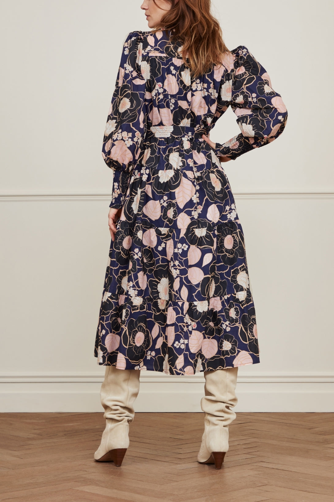 Midi A-line dress with detachable tie belt and a stand-up collar with ruffles. Arlene Dress features a gold button on the collar, puff sleeves and smocked cuffs. This item is made of 100% cotton.