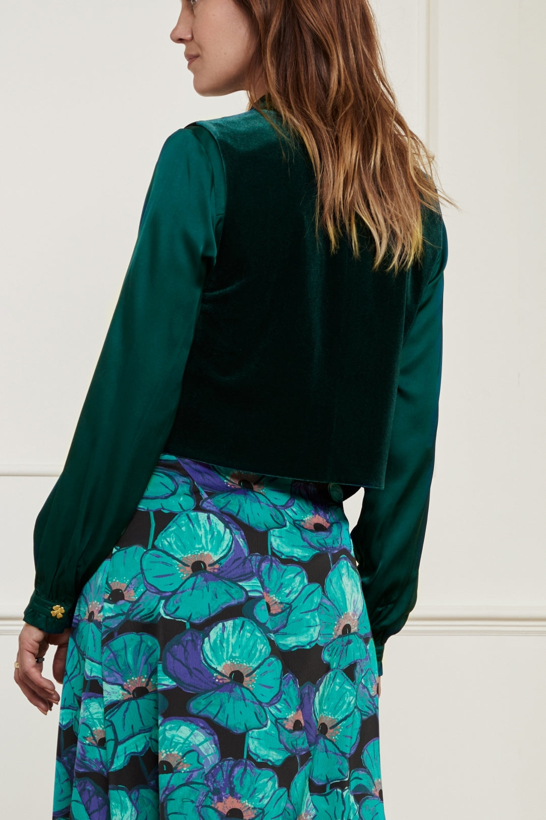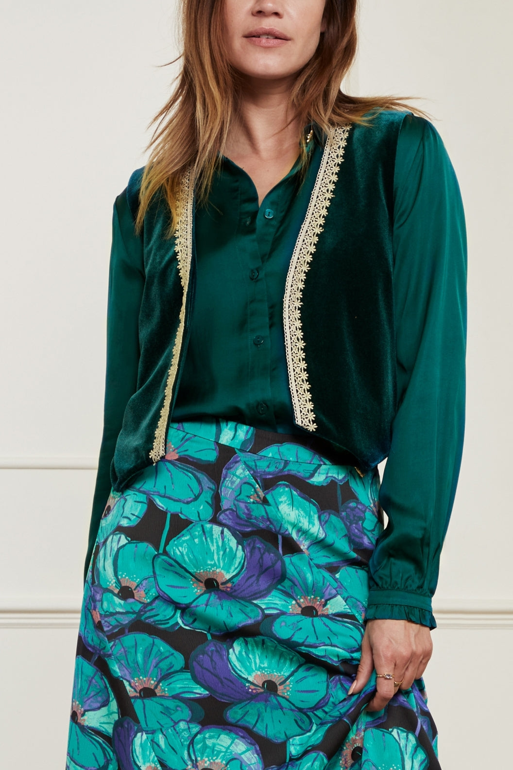 Velvet gilet with gold-coloured lace details. Giulia Gilet has inner lining in the Dalmatian print.
