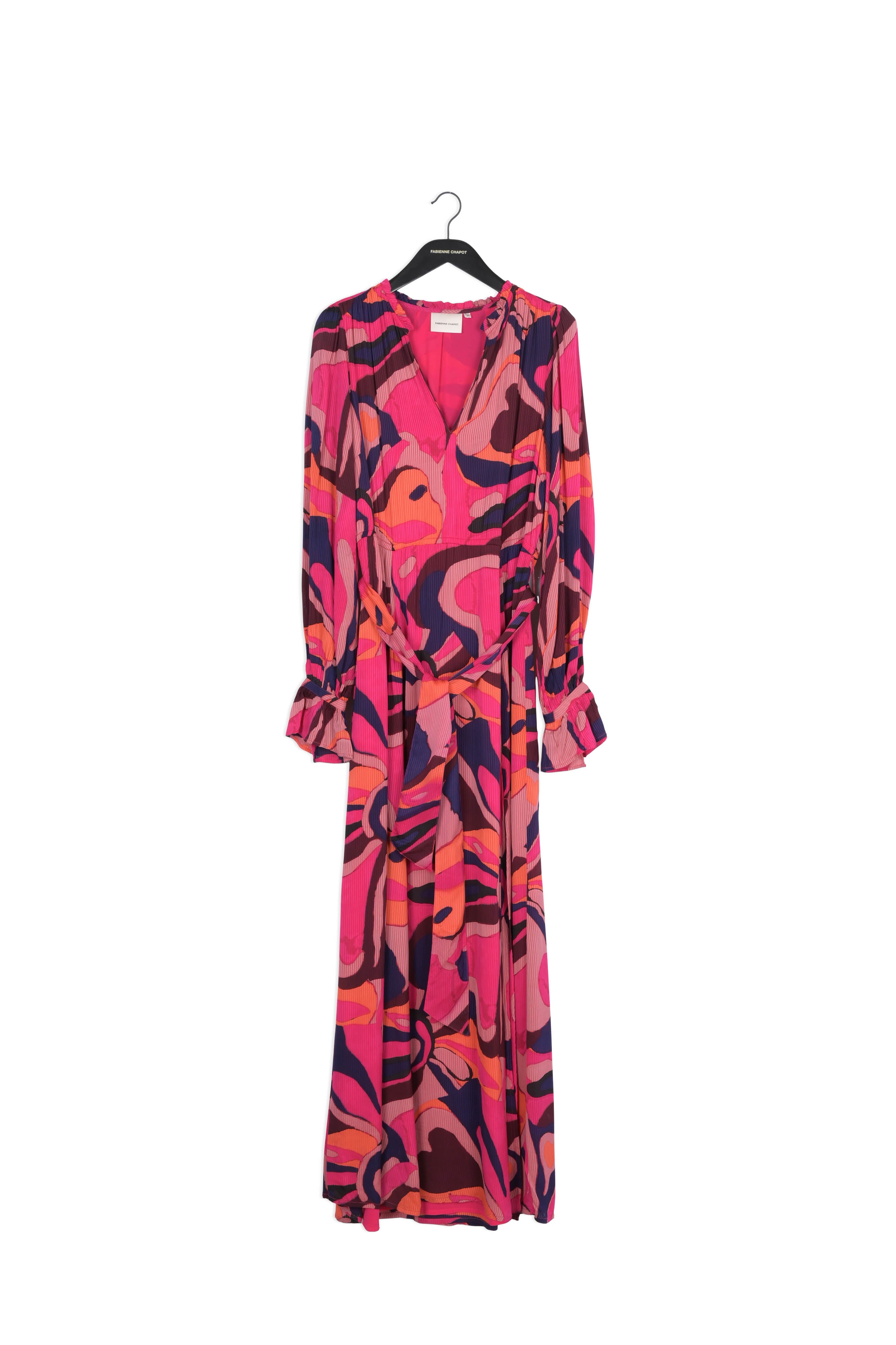 Long dress with a stand-up collar and V-neckline. Sarasara Dress features a tie belt at the waist, balloon sleeves and beautiful flared cuffs. -
