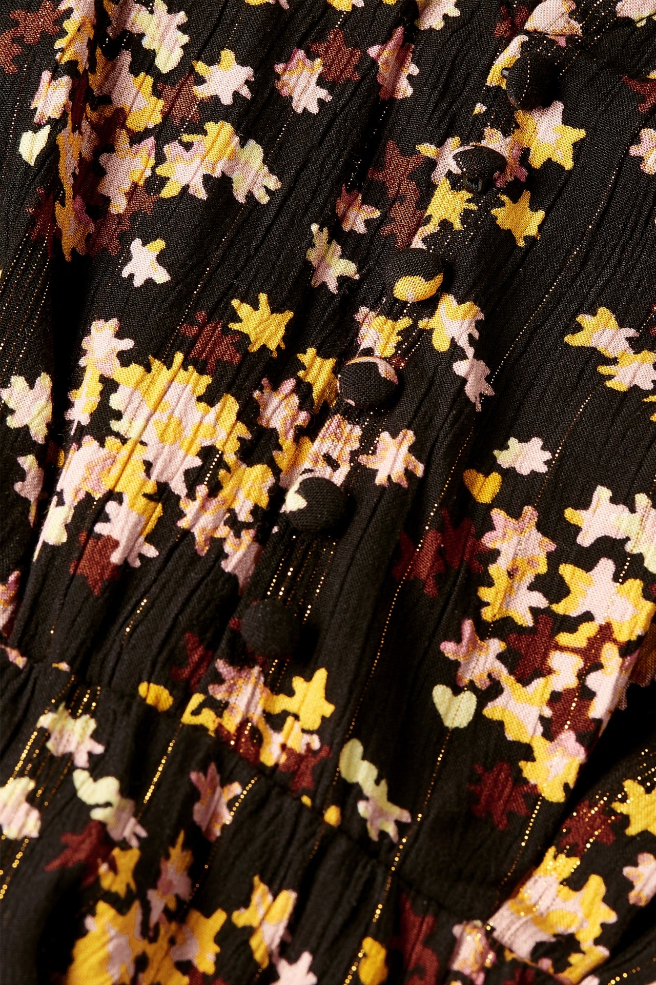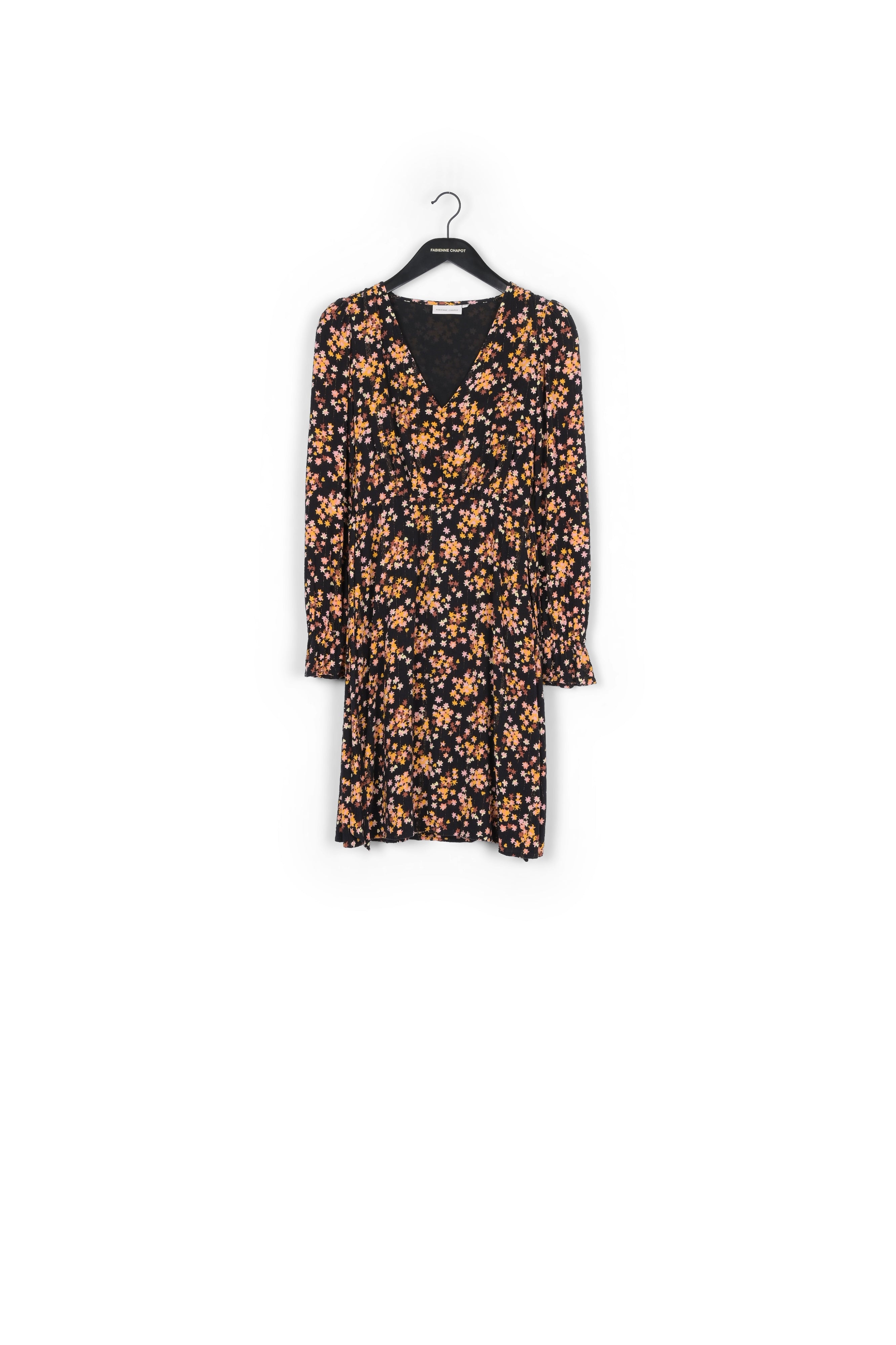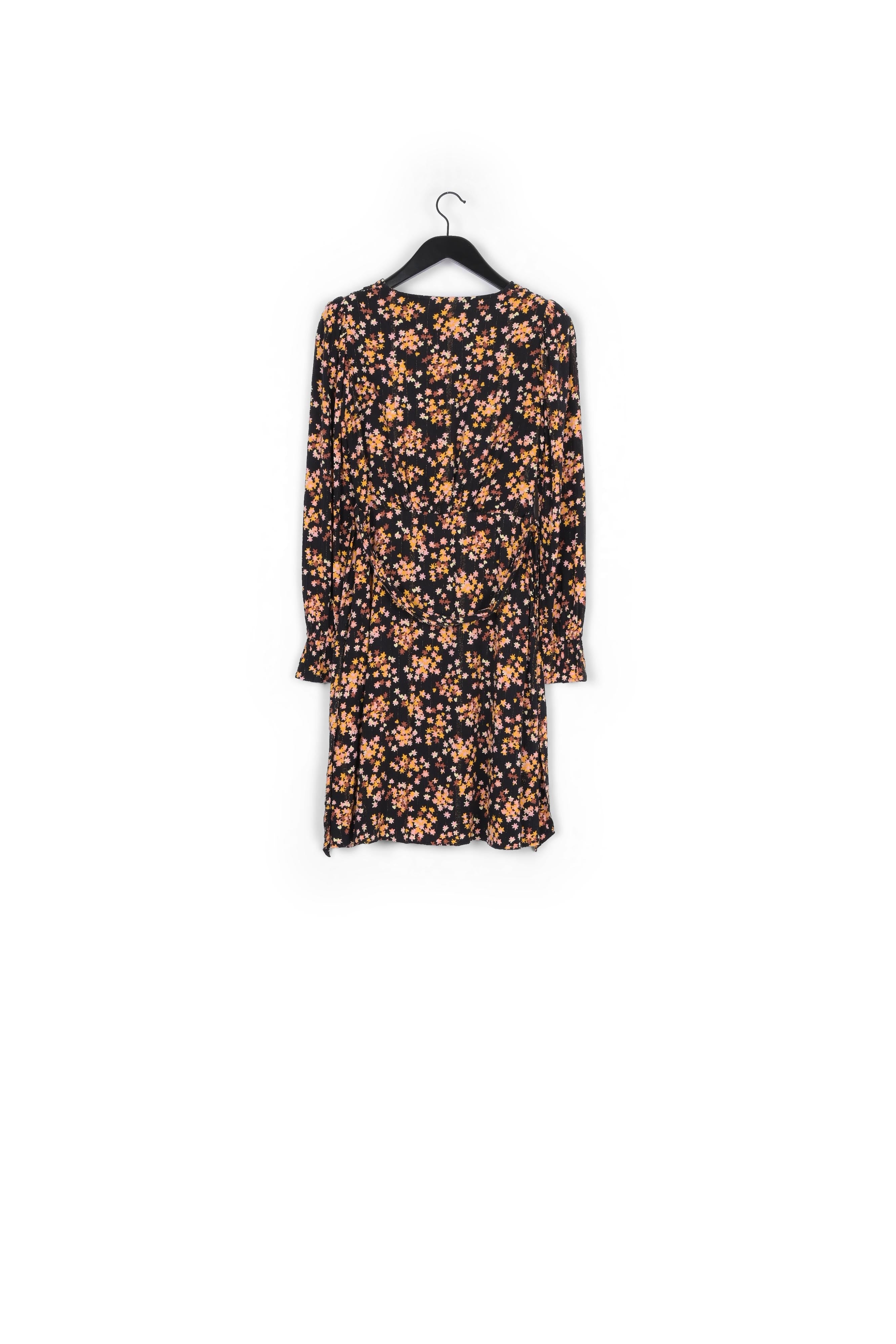 Short dress with V-neck, fabric coverd button details and long sleeves with ruffles and elastic cuffs. Isabella Dress has a tie belt at the waist and a blind zipper on the side.