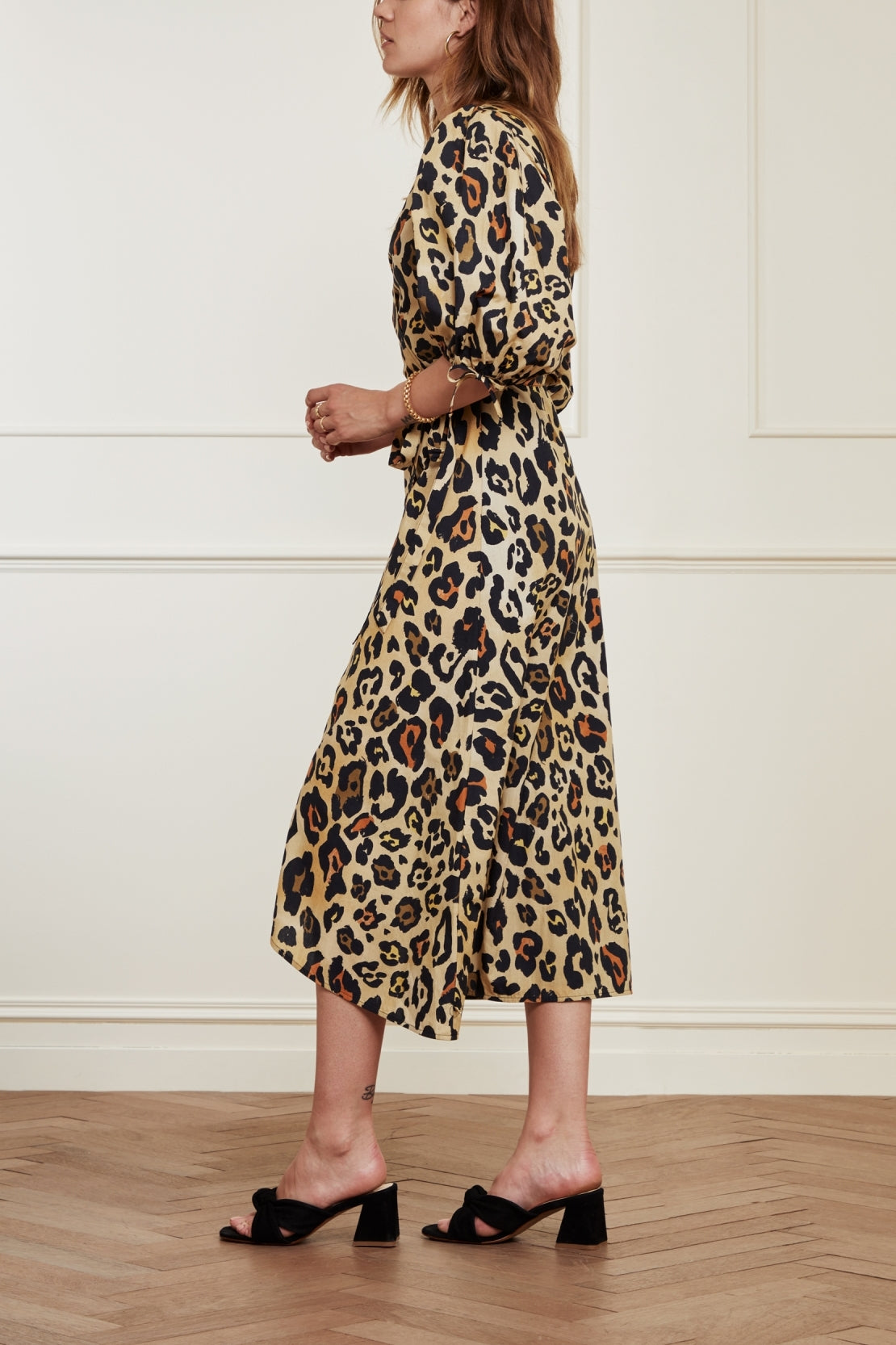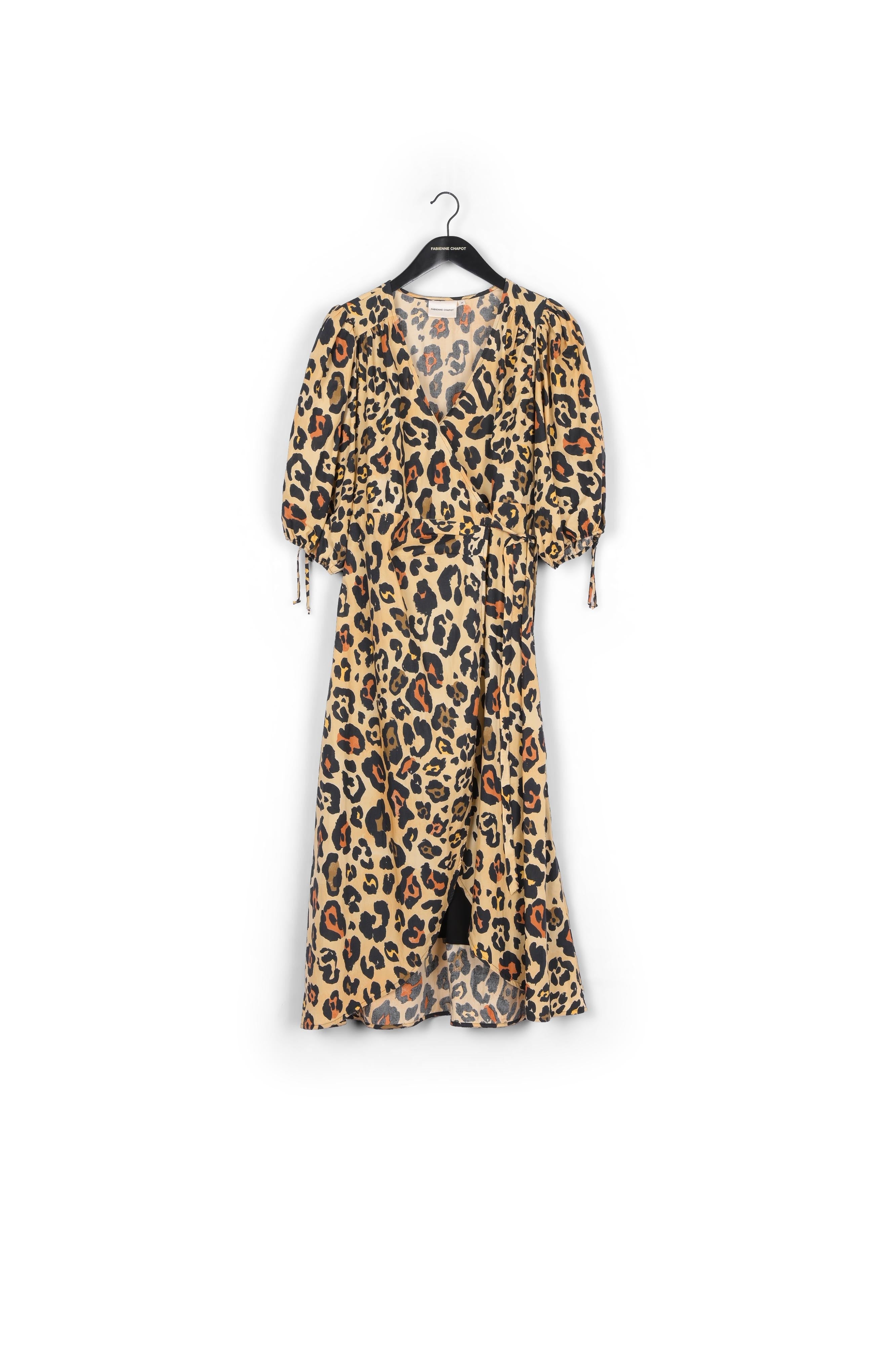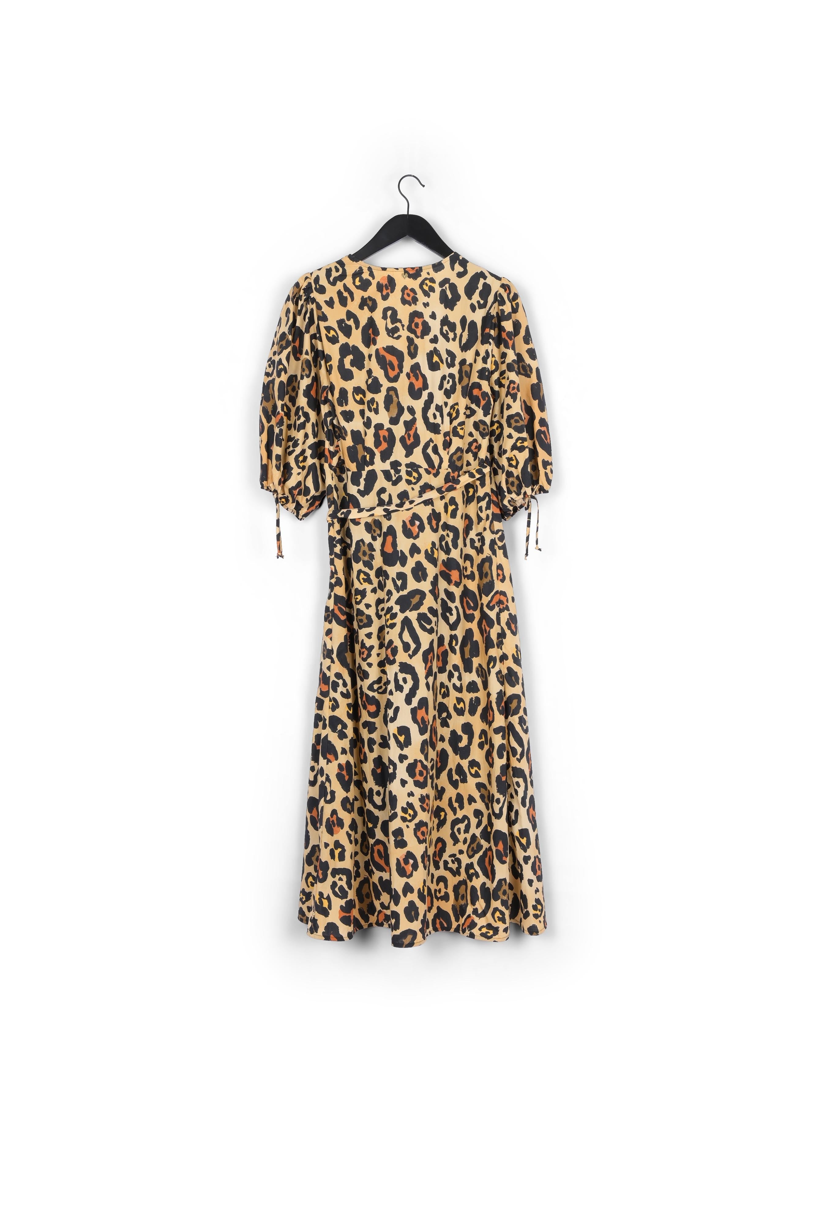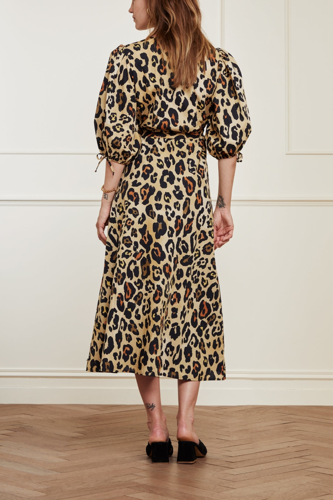Midi wrap dress with short balloon sleeves, V-neckline and openwork details.