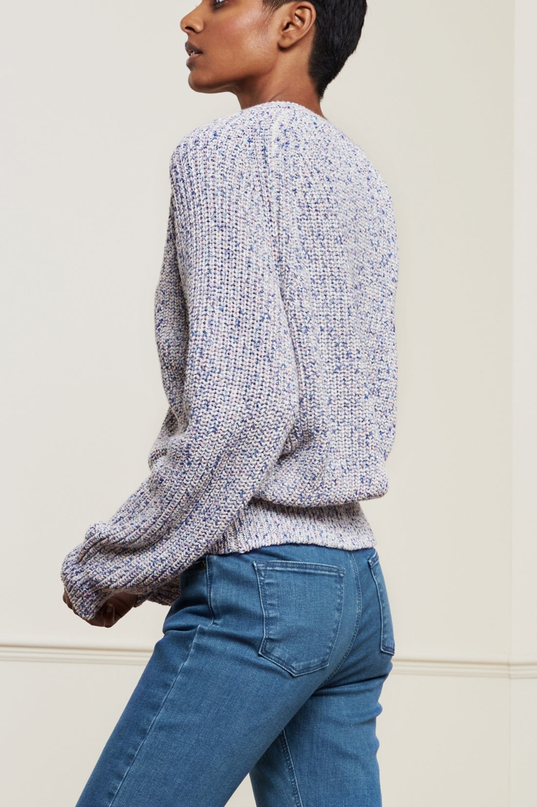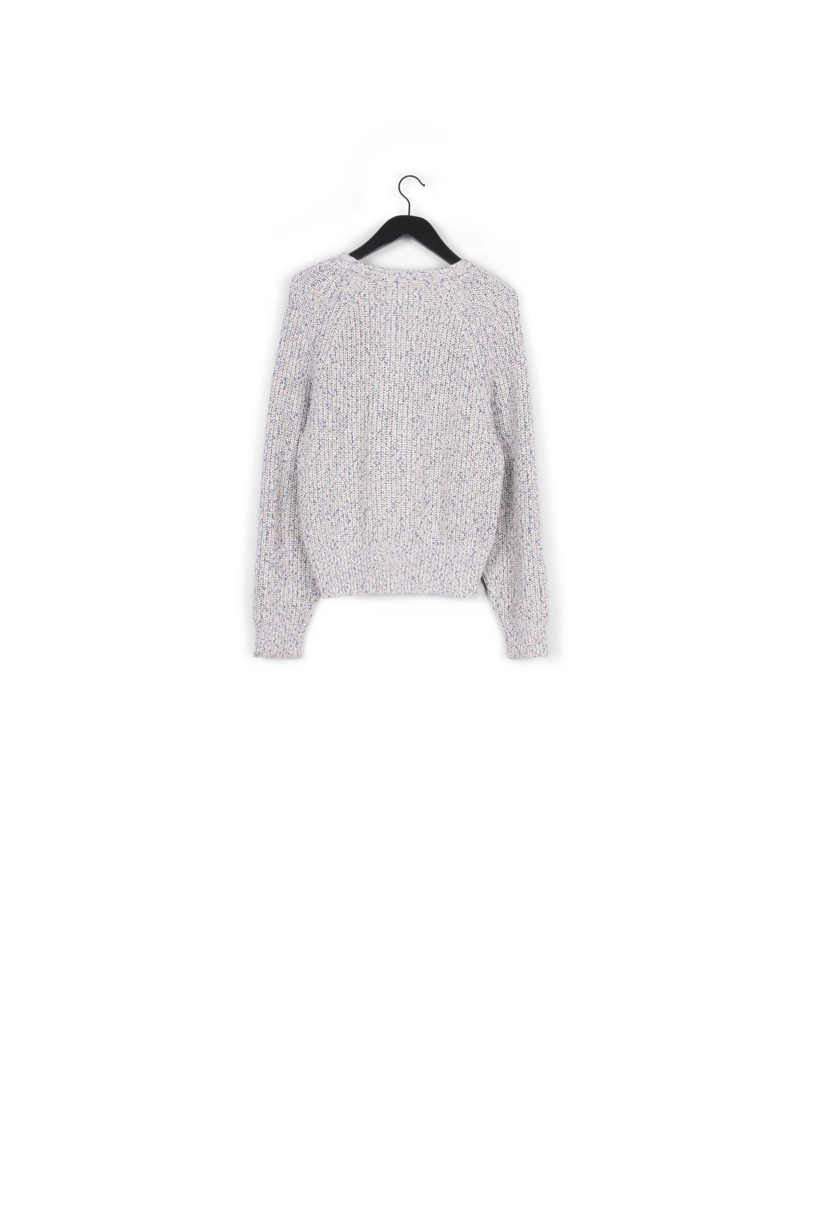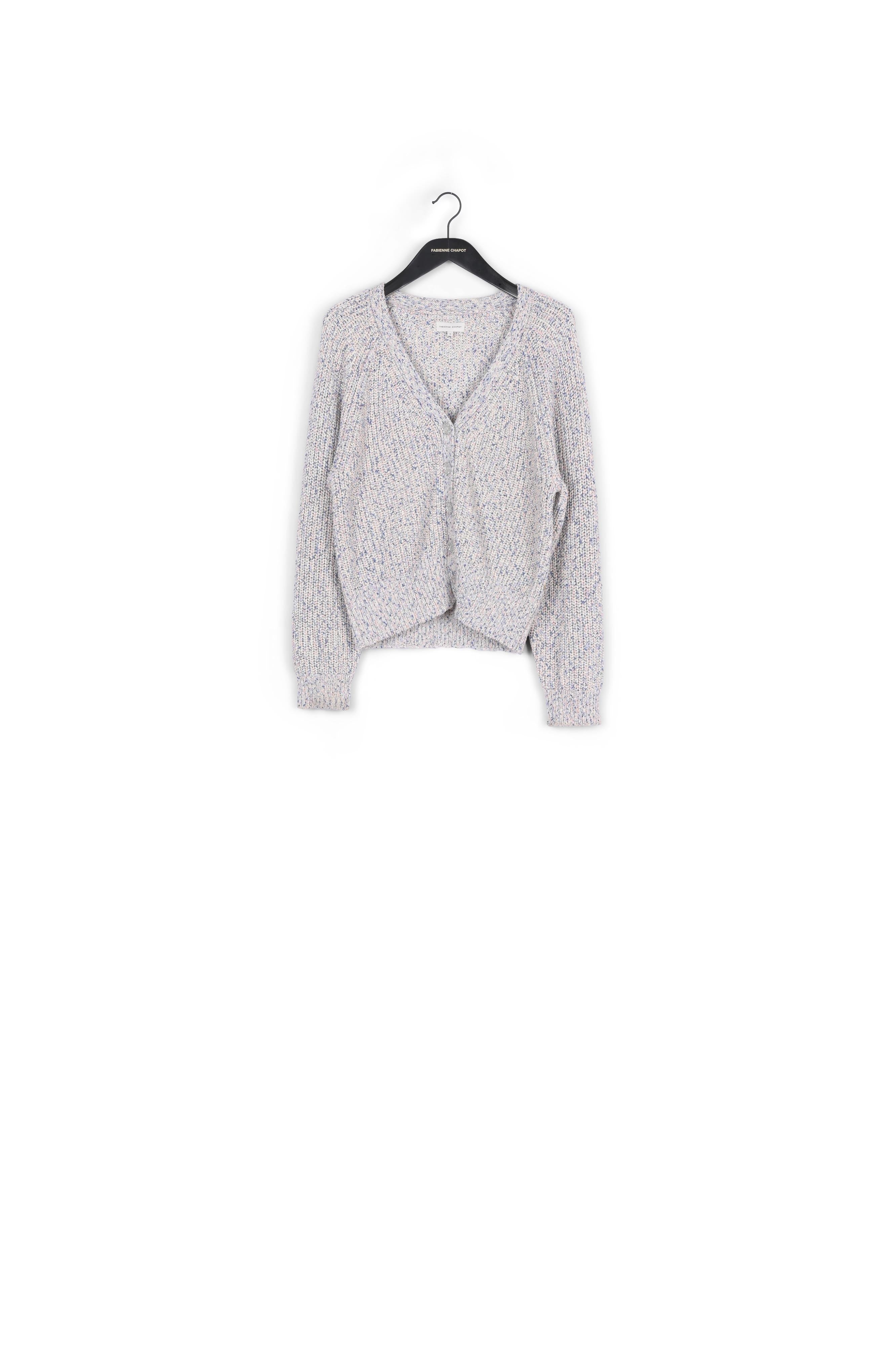 Knitted cardigan with different colors and V-neck. Confetti Cardigan has a button closure with fancy transparent buttons. -