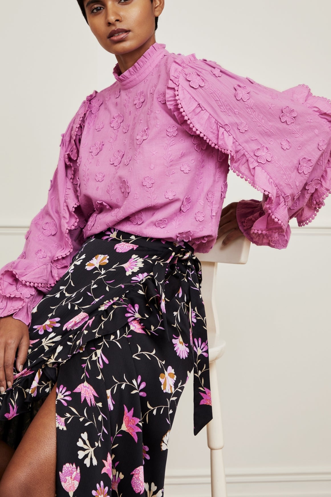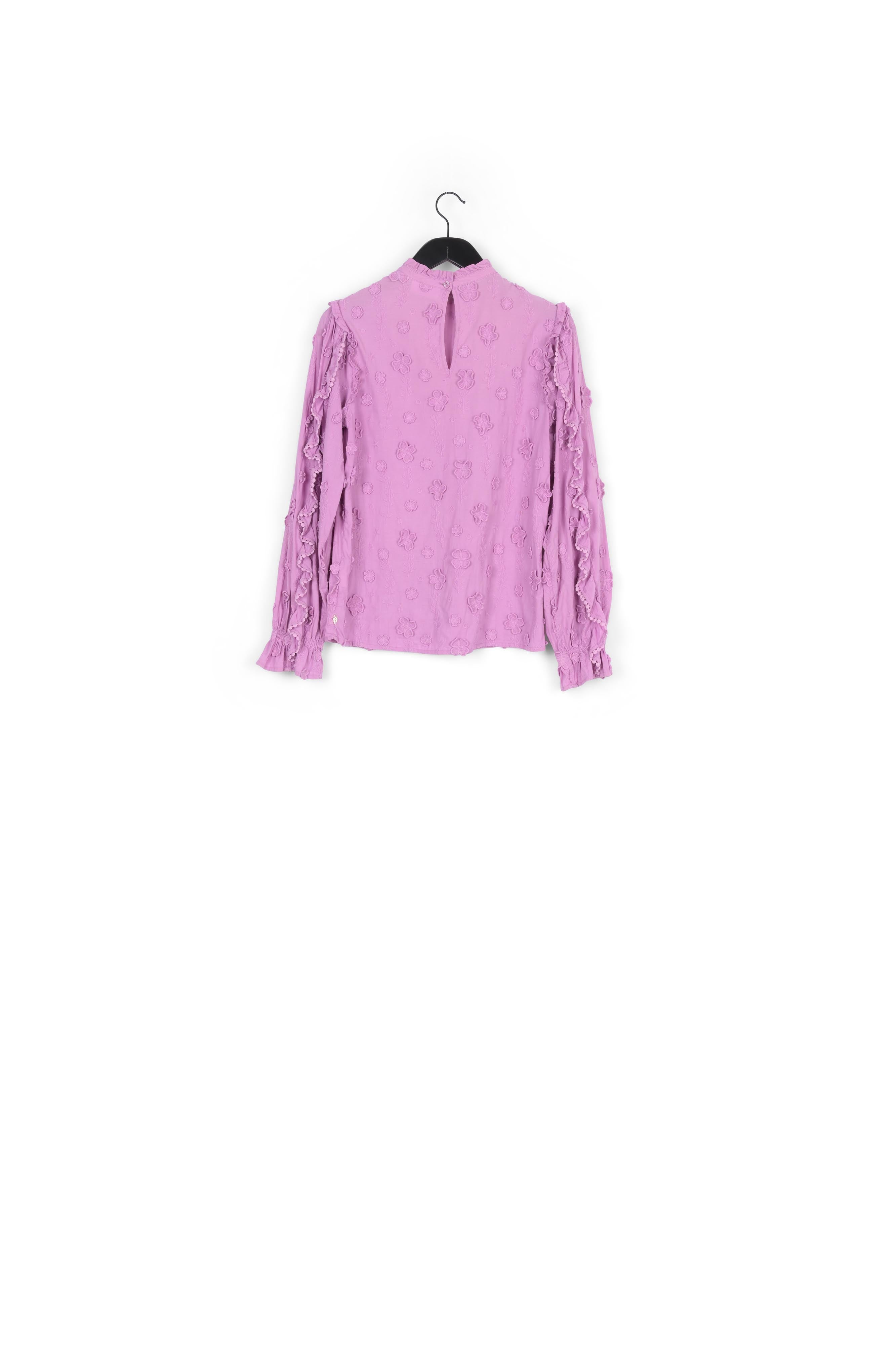 Top with puffed sleeves and elastic cuffs. Josefin Top has ruffles and pompom details on the sleeves and is made of a beautiful fabric. It is a 3D translation of our unique prints in a beautiful embroidery technique, making the flowers seem to grow out of the fabric. This top is made of 100% cotton.