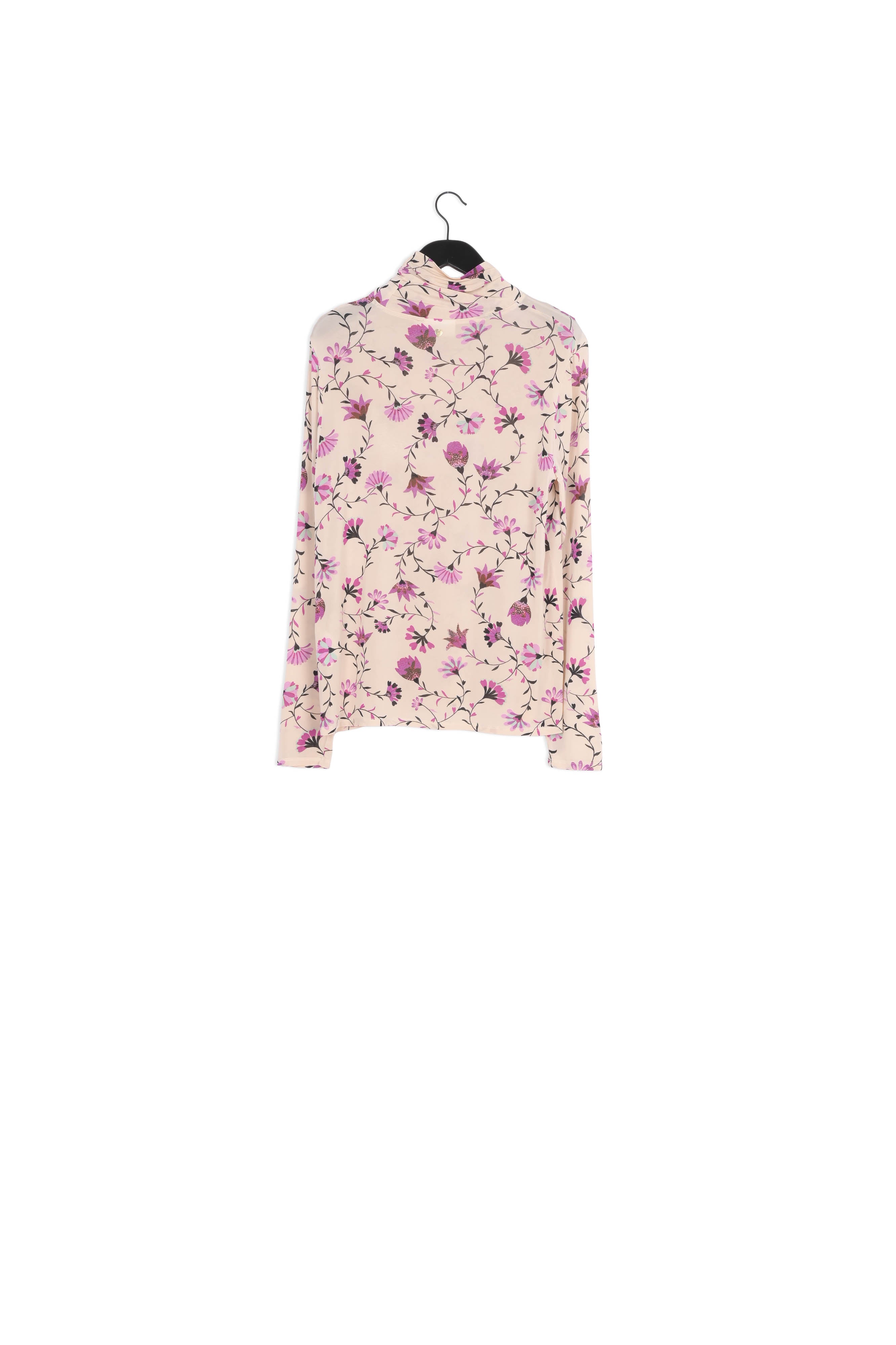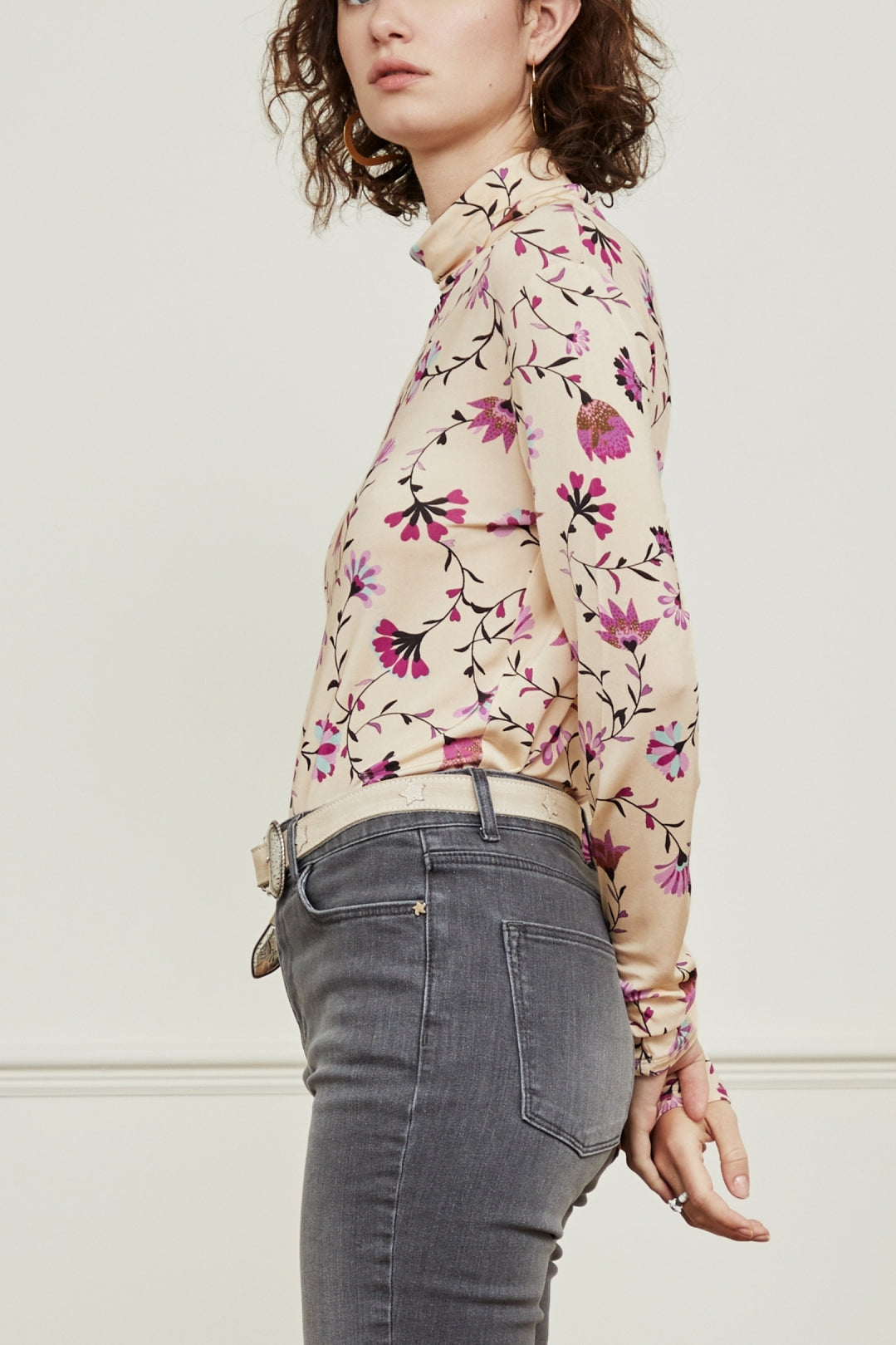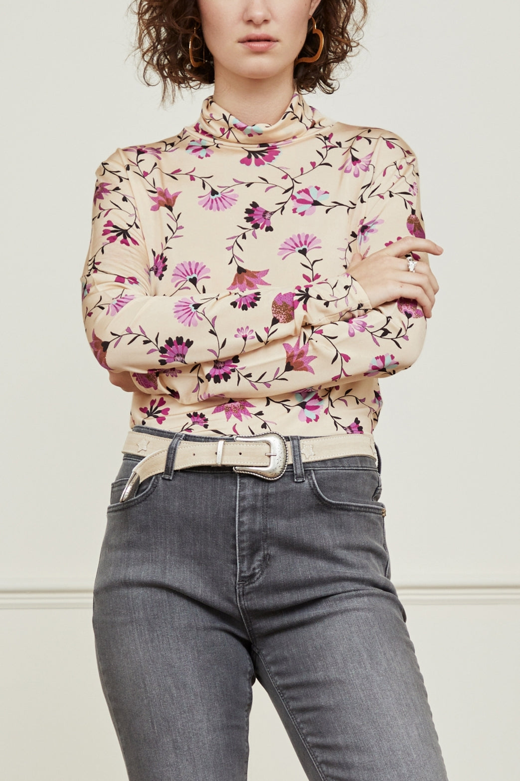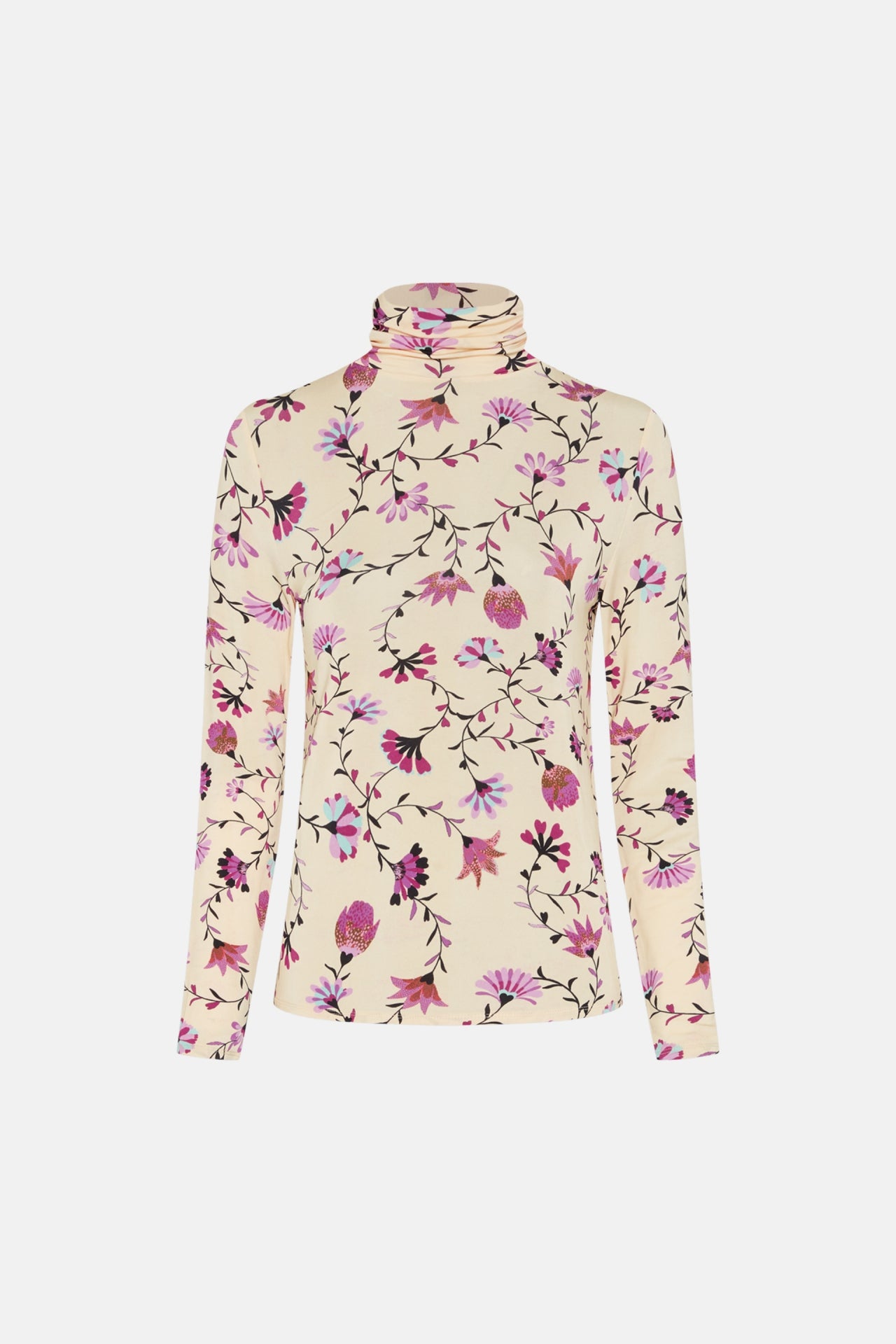 Fitted top with long sleeves and a high turtleneck. Jane Billy Top has an allover Cream Tulip print and feels soft and stretchy.