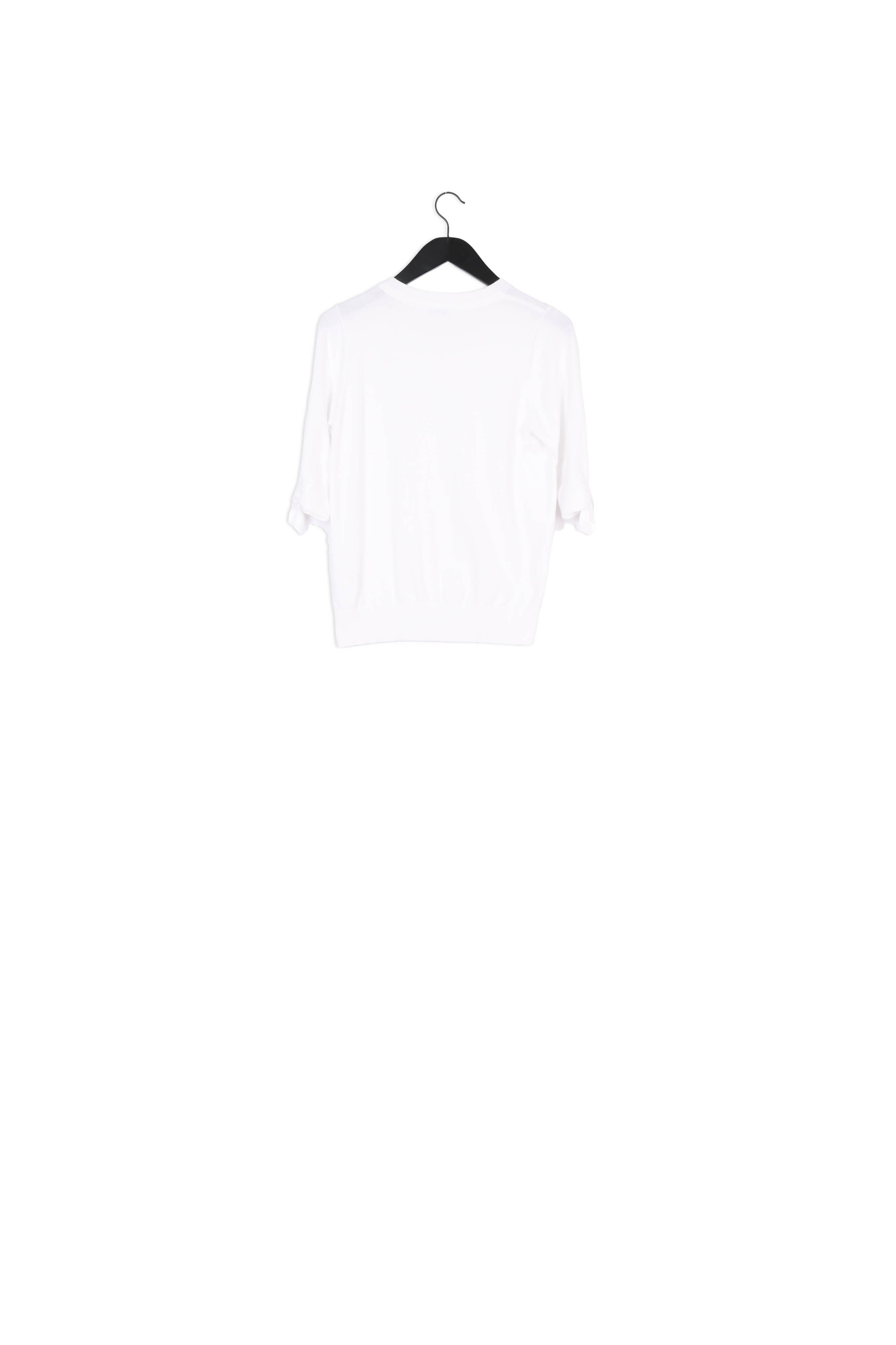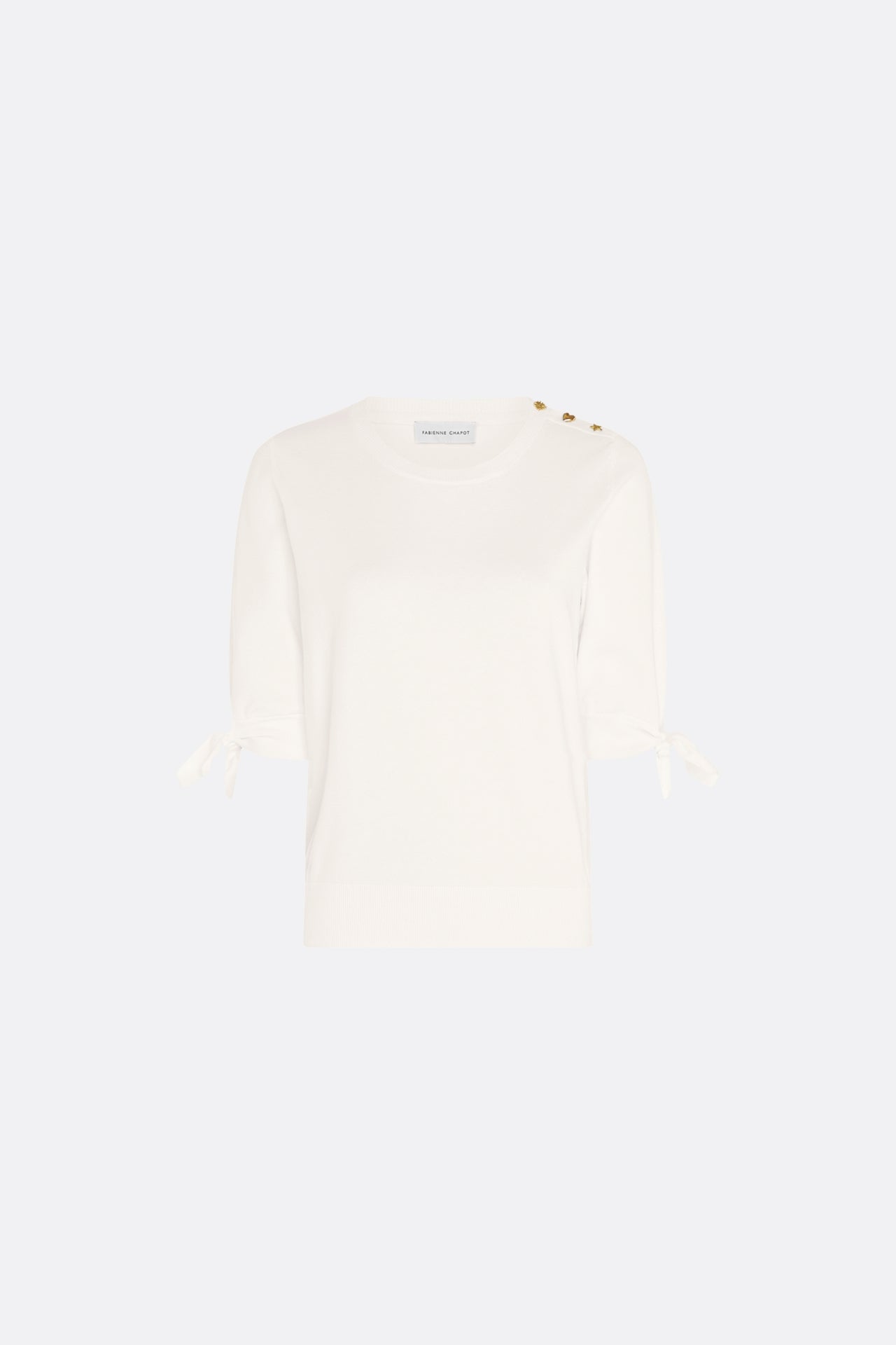 Fine-knit pullover with a high, round neck and three-quarter length sleeves. Molly Short Sleeve Pullover has gold-coloured buttons on the left shoulder and a bow detail on the sleeves. -