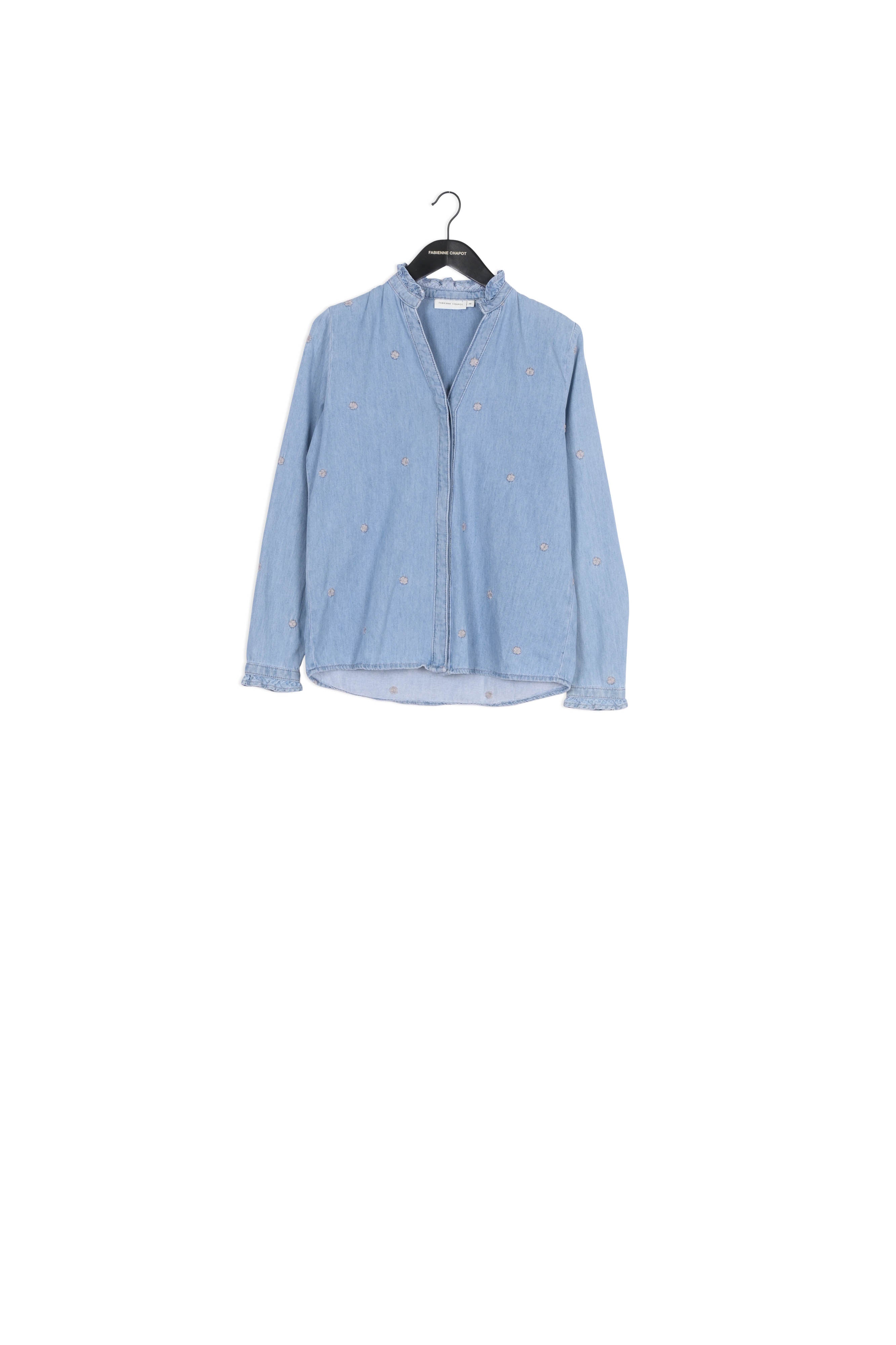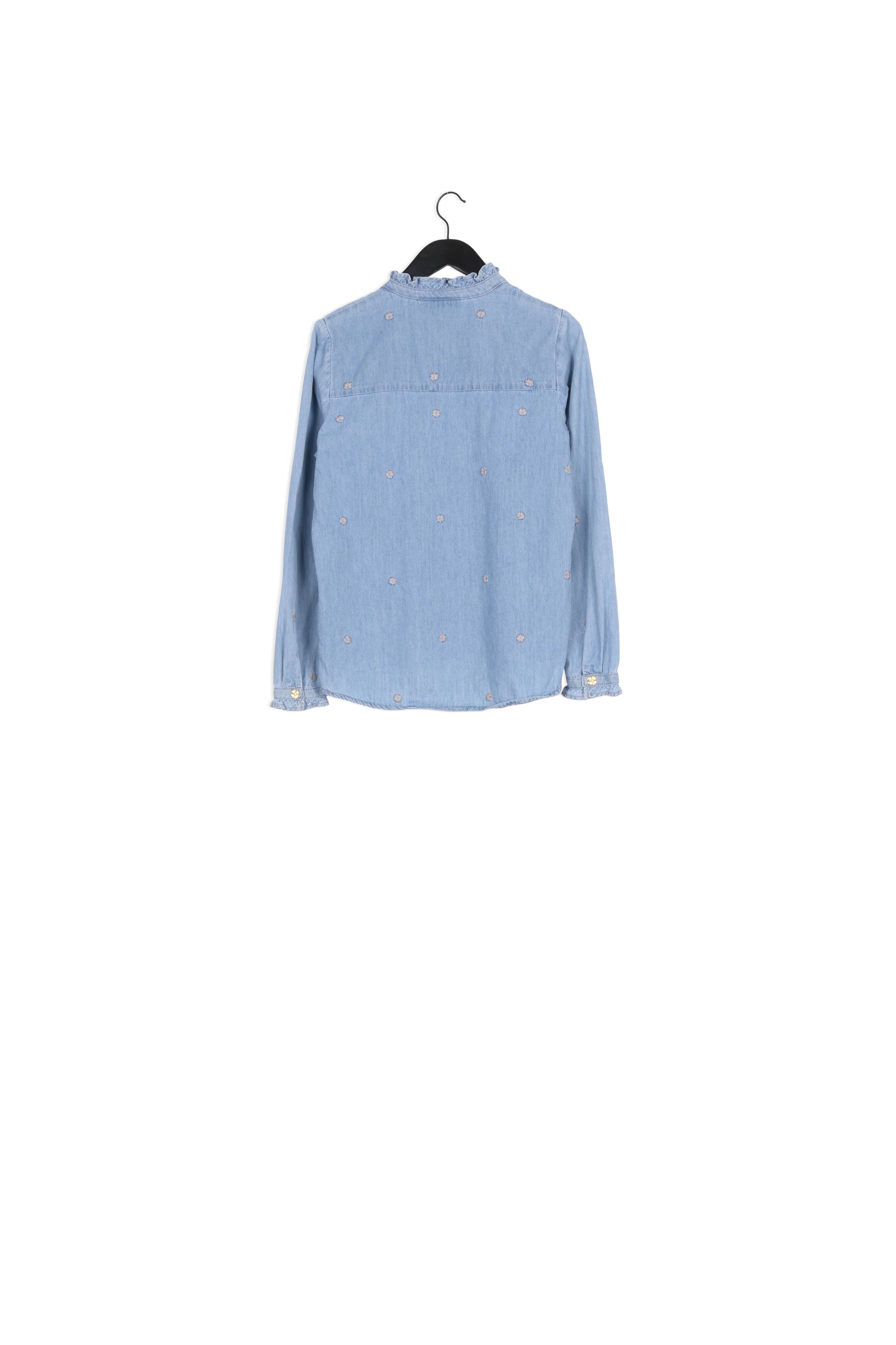 Denim blouse with button closure. Frida Ruffle Denim Blouse has ruffle details along the collar and cuffs and embroidered flowers and is made of 100% cotton.