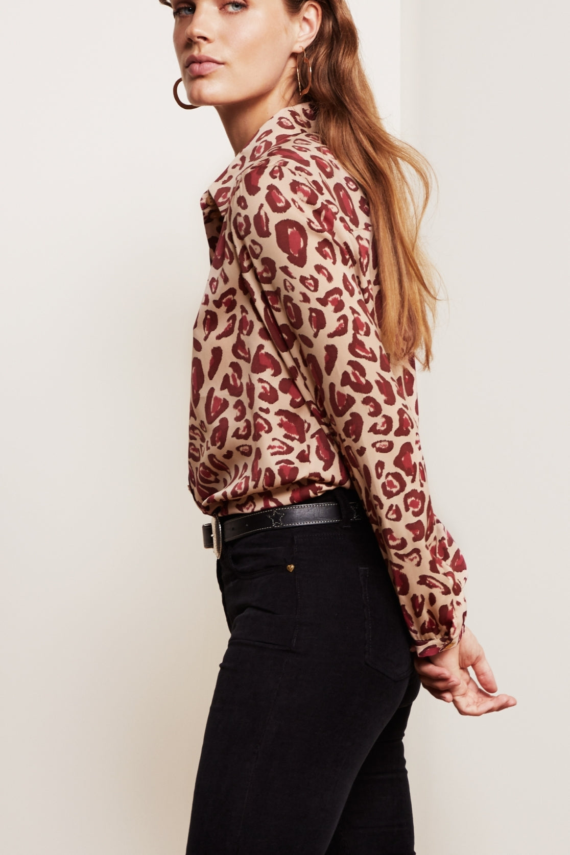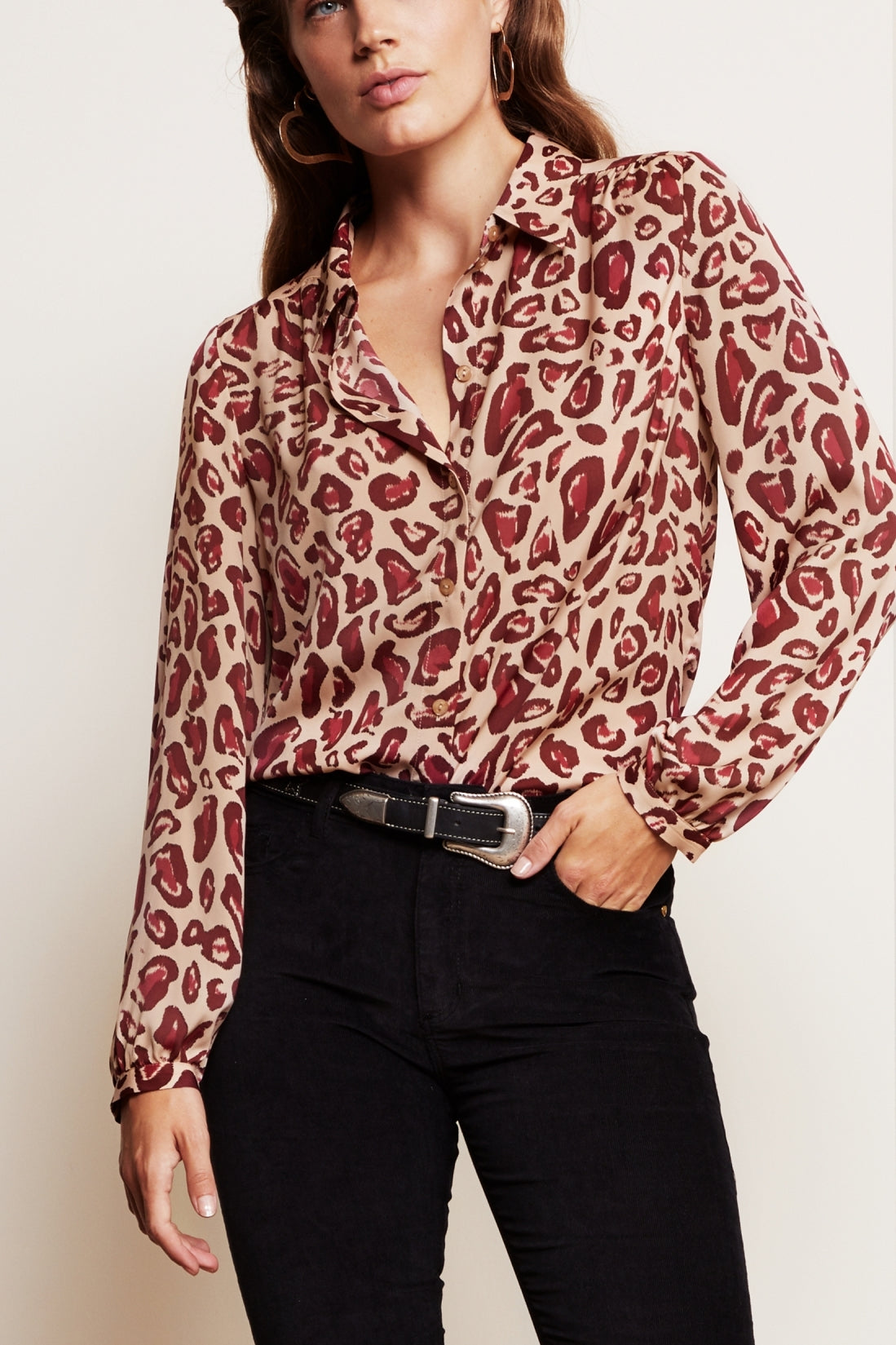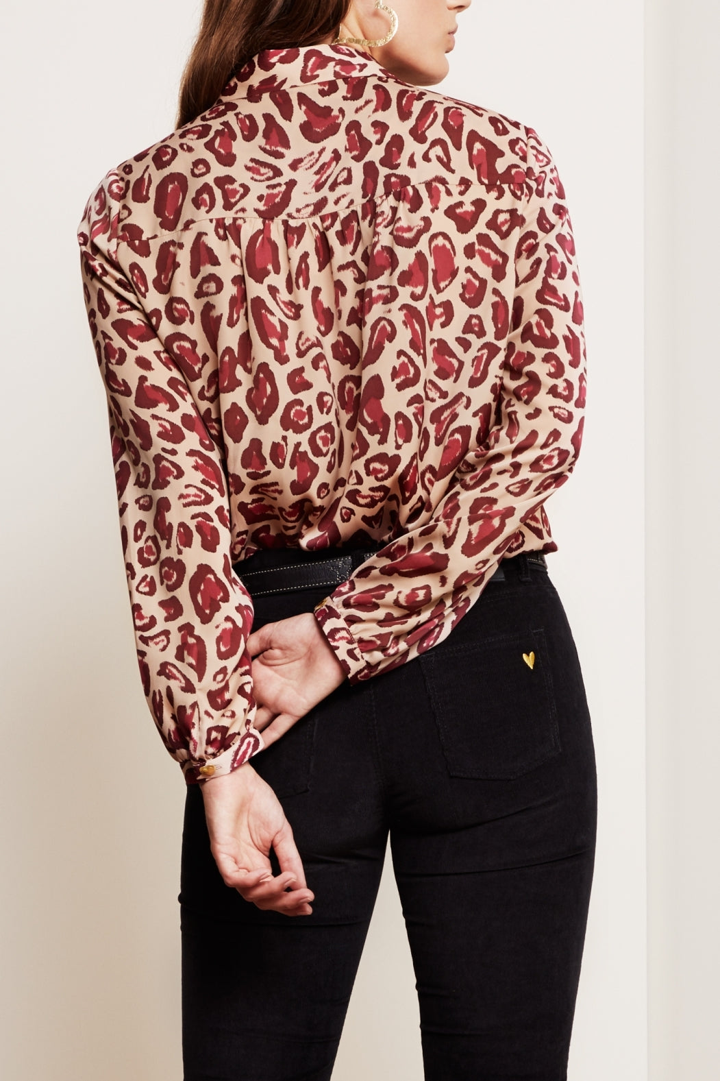 Flowing blouse with classic collar and button closure. Mira Blouse has light puffed sleeves, pleated details on the front and back and gold-colored buttons on the cuffs.
