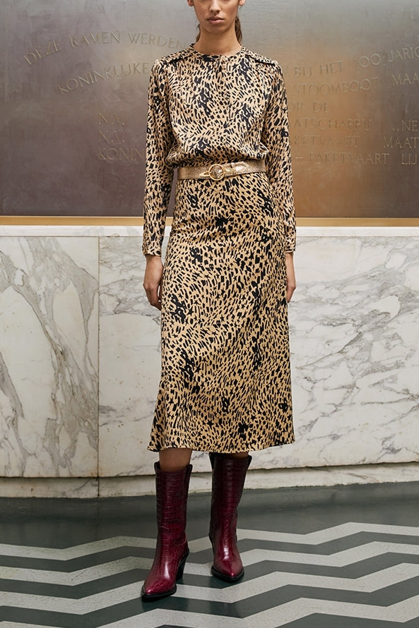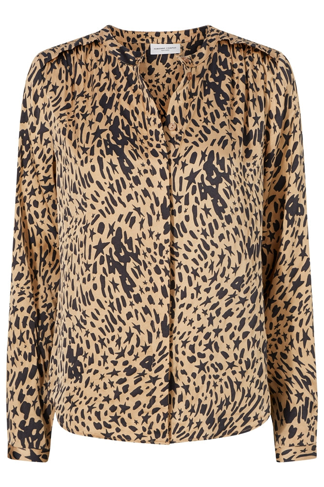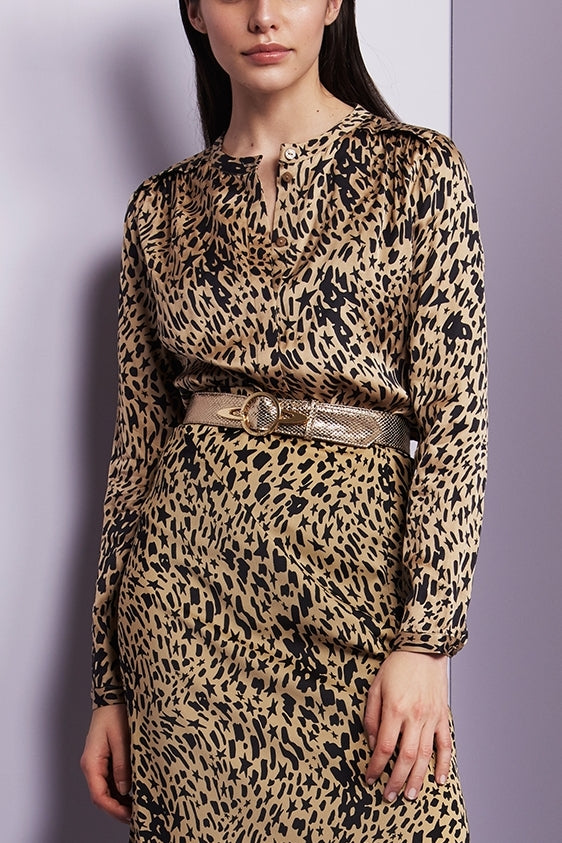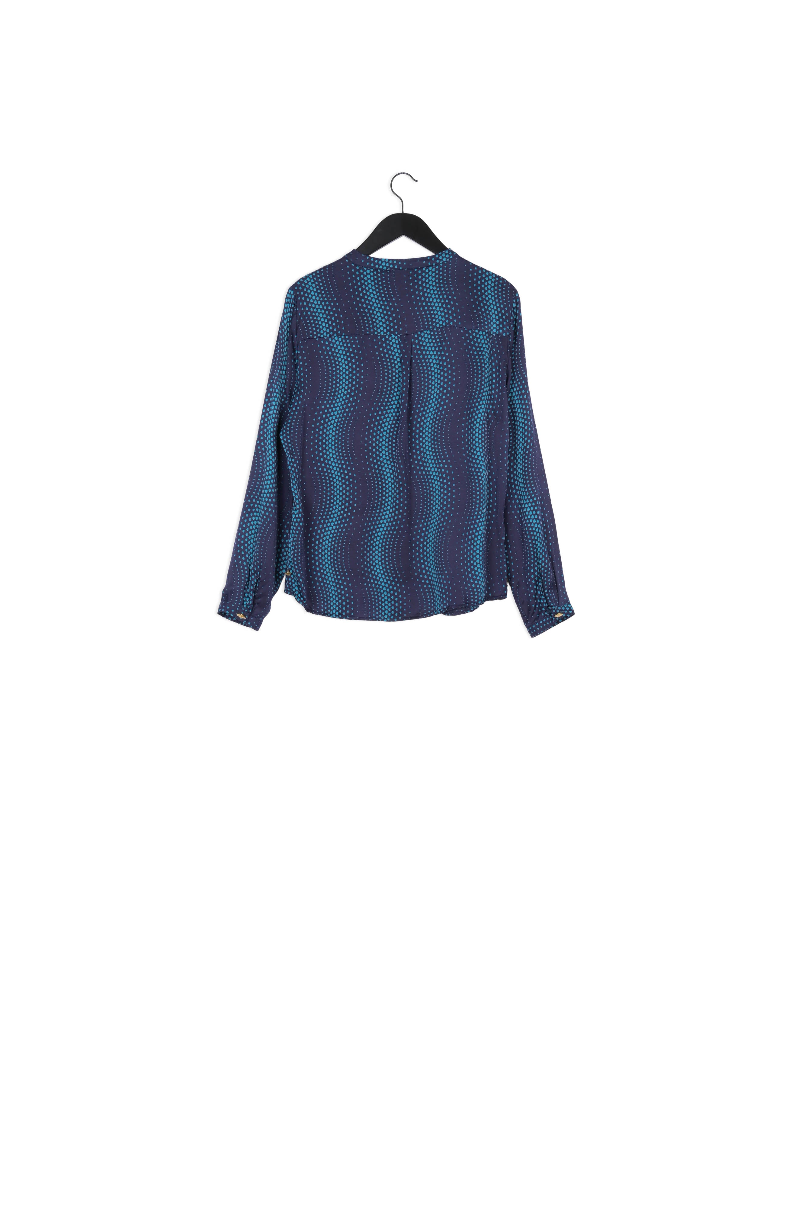 Loose-fitting blouse with Mao collar, concealed button closure and gold-coloured button shaped like a UFO on the cuffs. Sunset Blouse is rounded at the back.