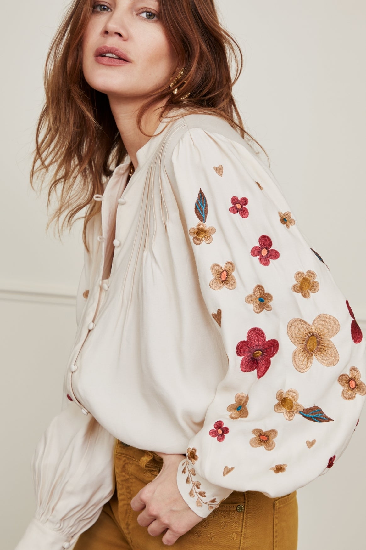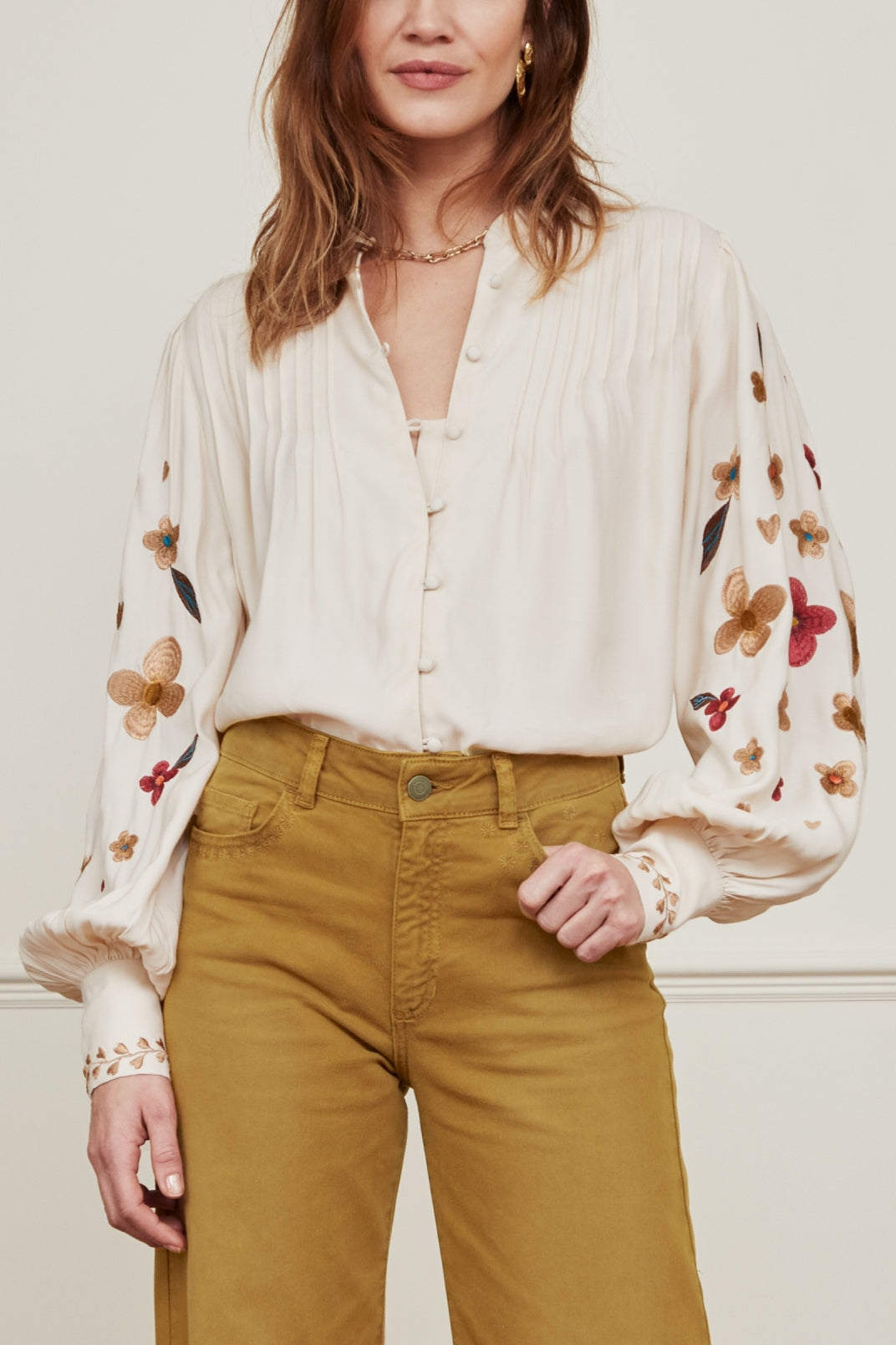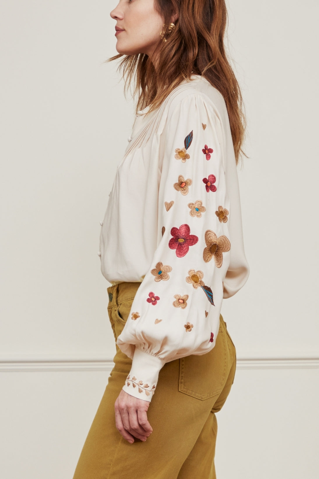 Flowing blouse with hook and button fastening. Heidi Blouse has pleated details on the chest and balloon sleeves with beautiful embroidered flowers.
