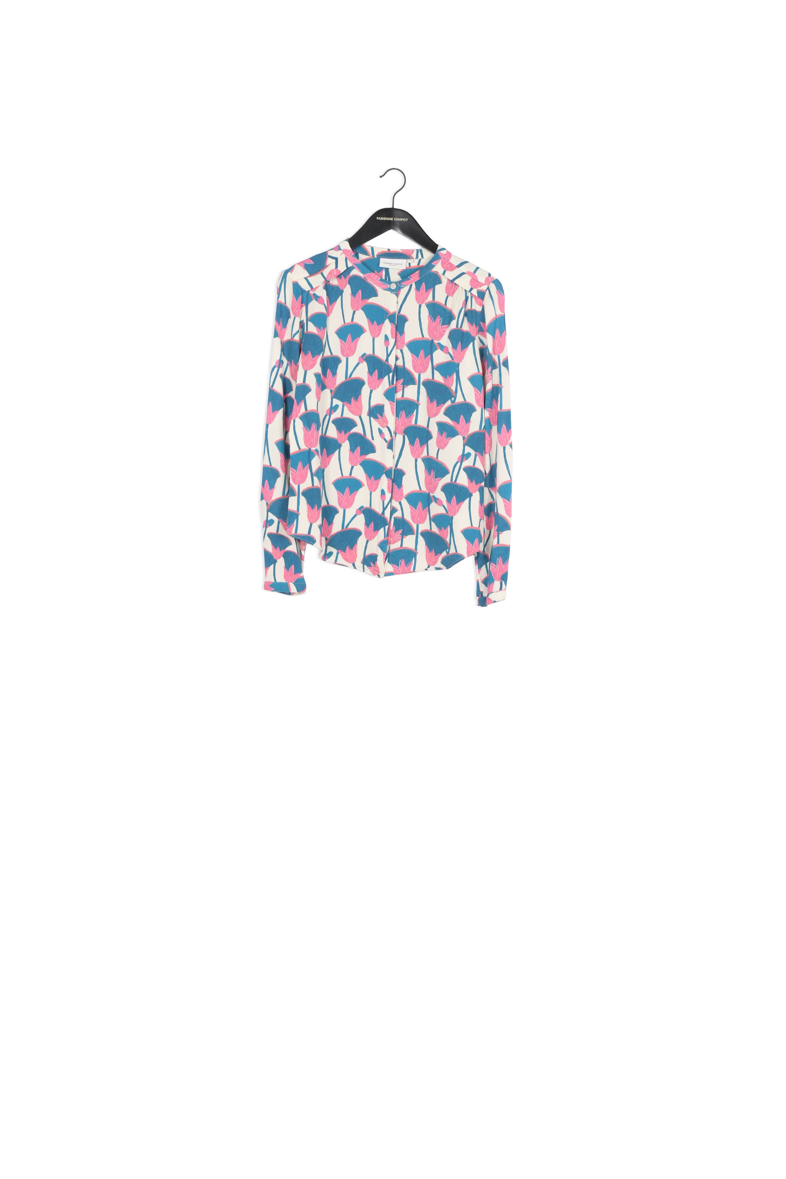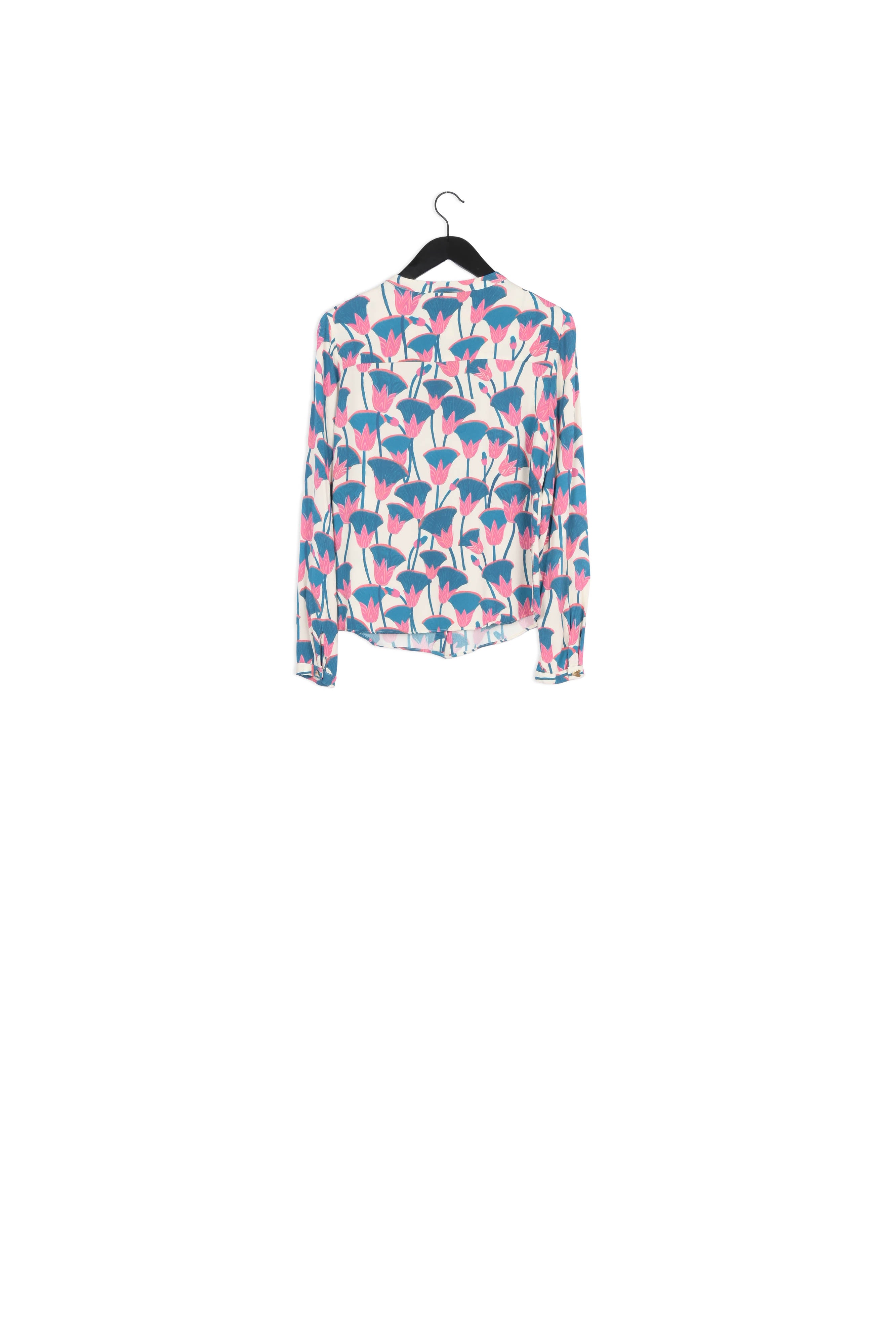 Loose-fitting blouse with Mao collar and a concealed button closure. Sunset Blouse is rounded at the back. -