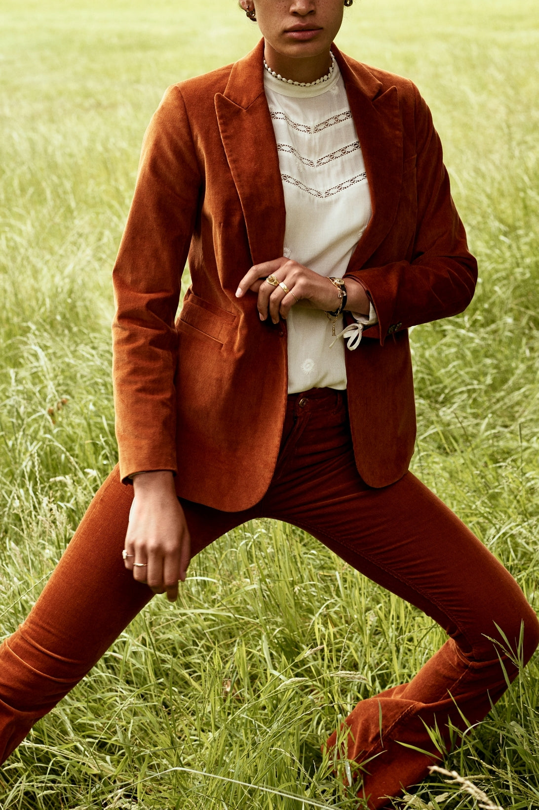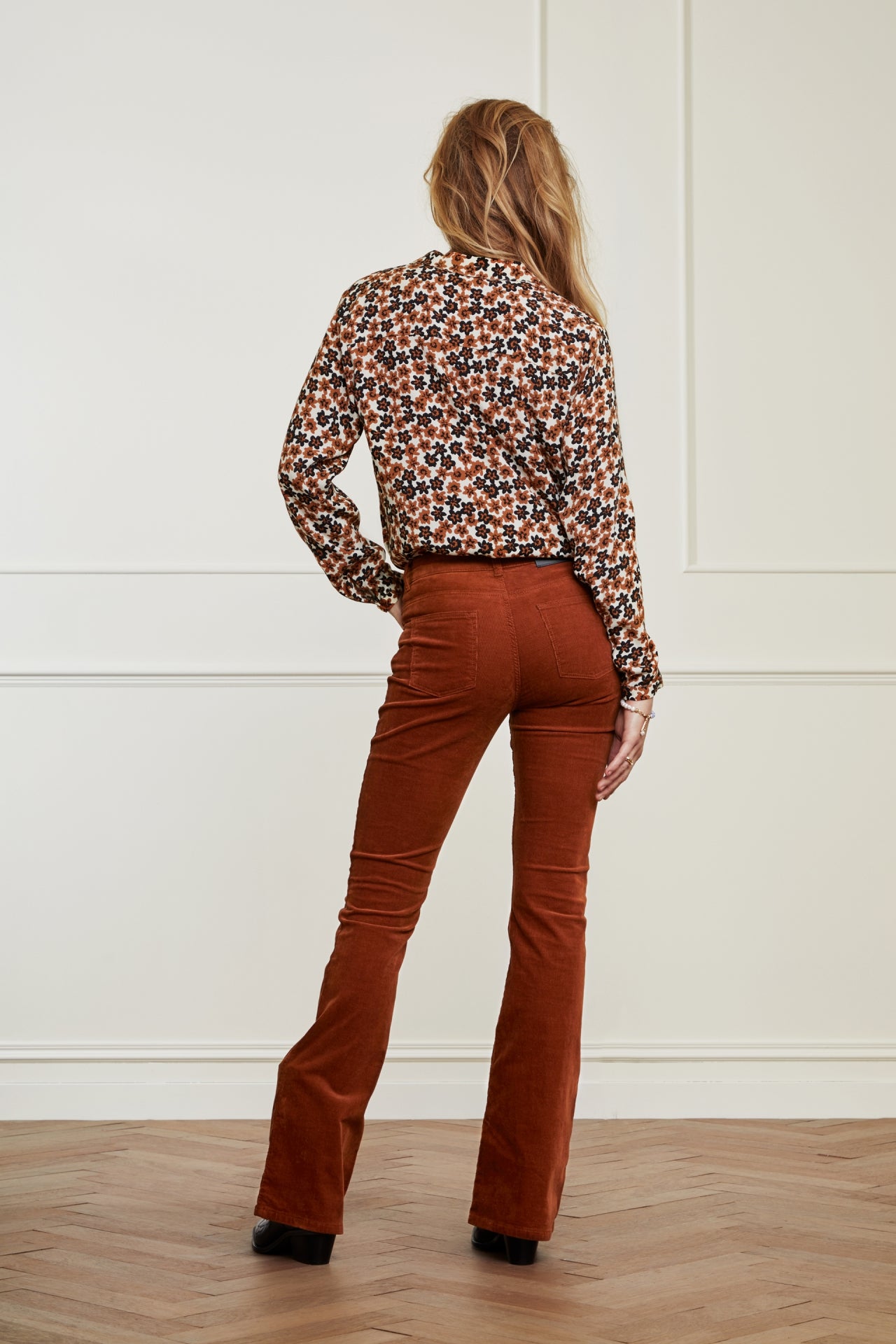 Mid-rise trousers with the ultimate fit! Eva Corduroy Flare Trousers has an average waist height, wide legs, button and zipper closure and an embroidered heart at the back pocket. This trousers is made of a stretch cotton corduroy fabric. The inseam is 82 cm for L32 and 86 cm for L34.