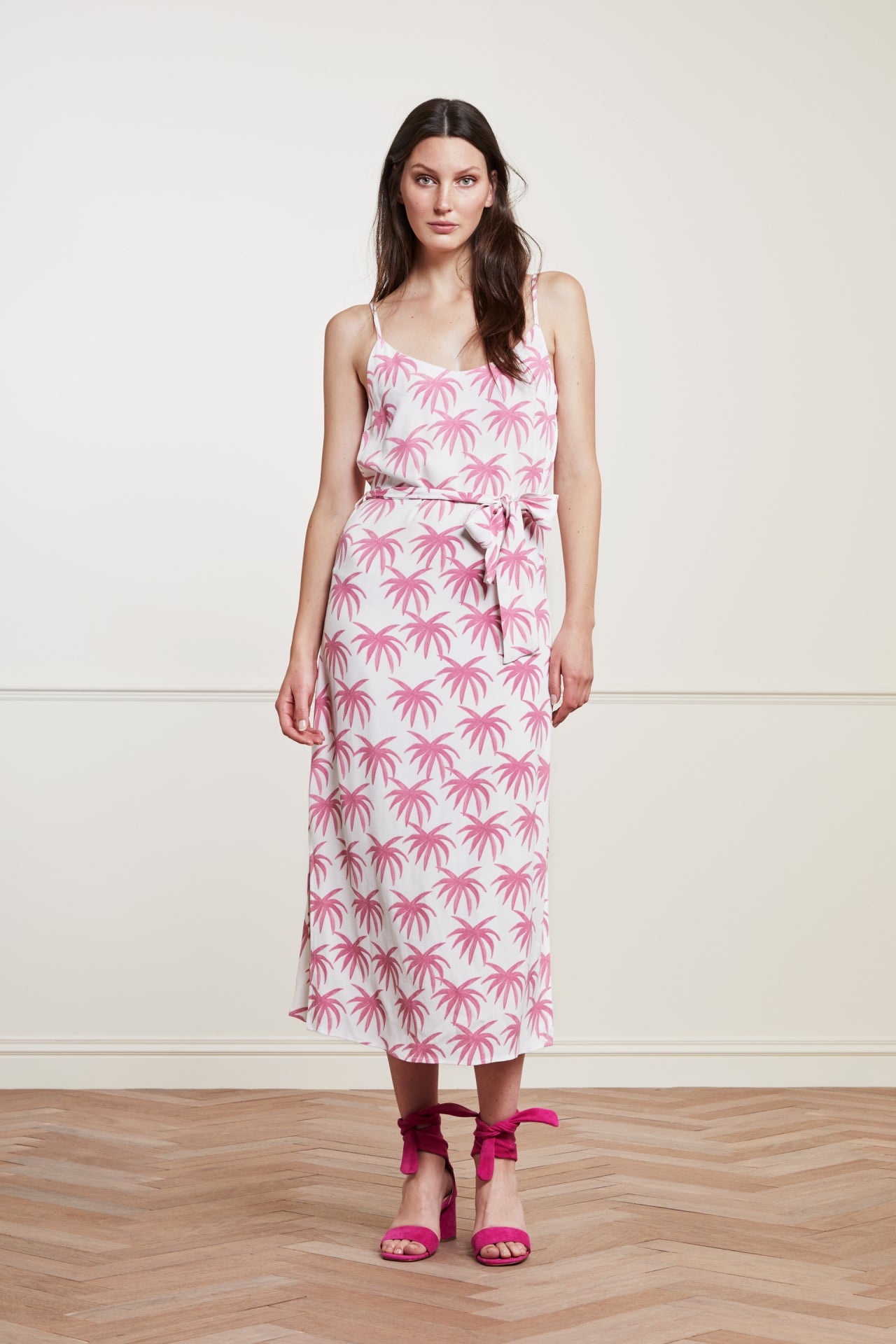 Long dress with adjustable spaghetti straps and bow tie. Sunset Dress has a split on both sides. This item is made of 53% Lenzing™ EcoVero™ Viscose: breezy, supple and conscious.